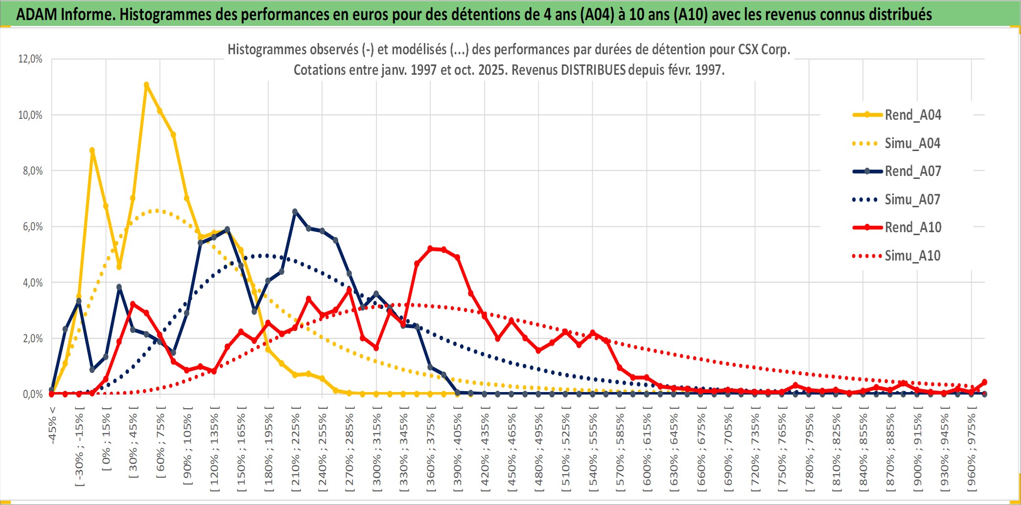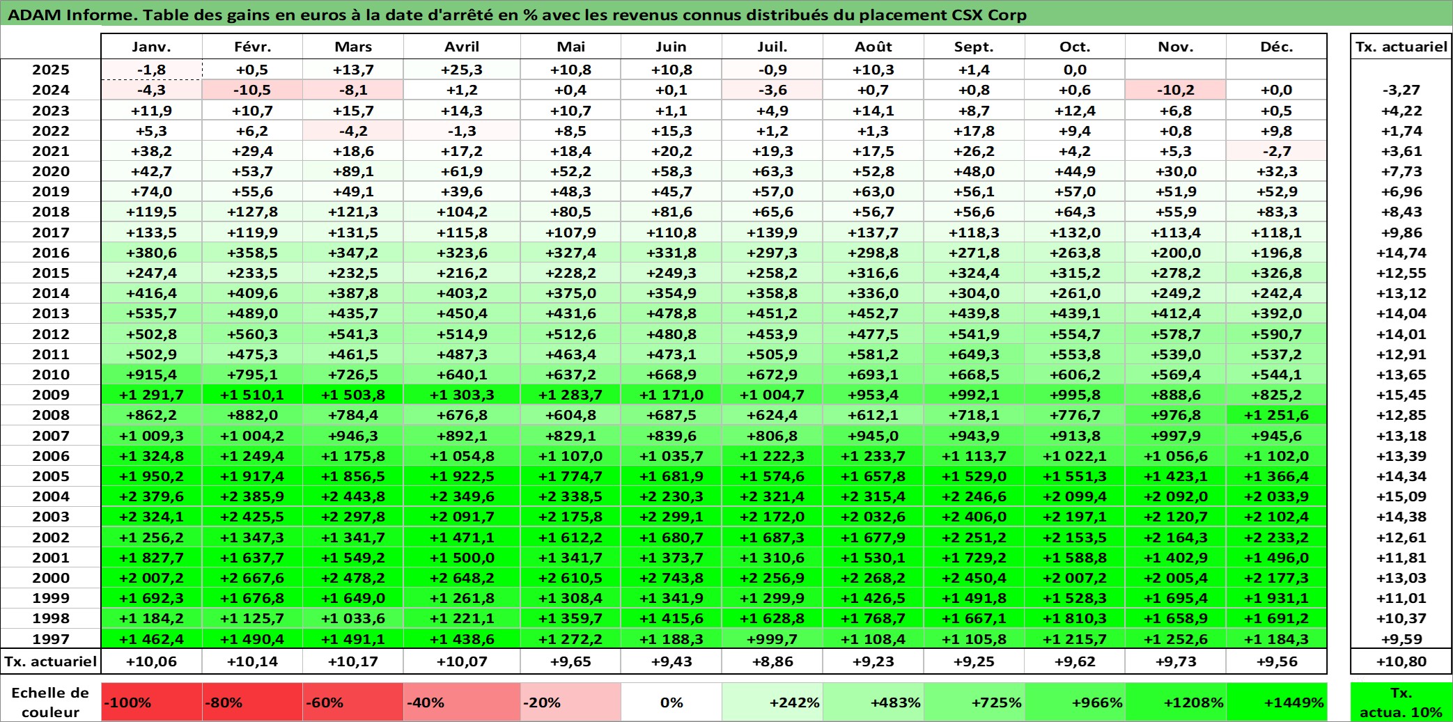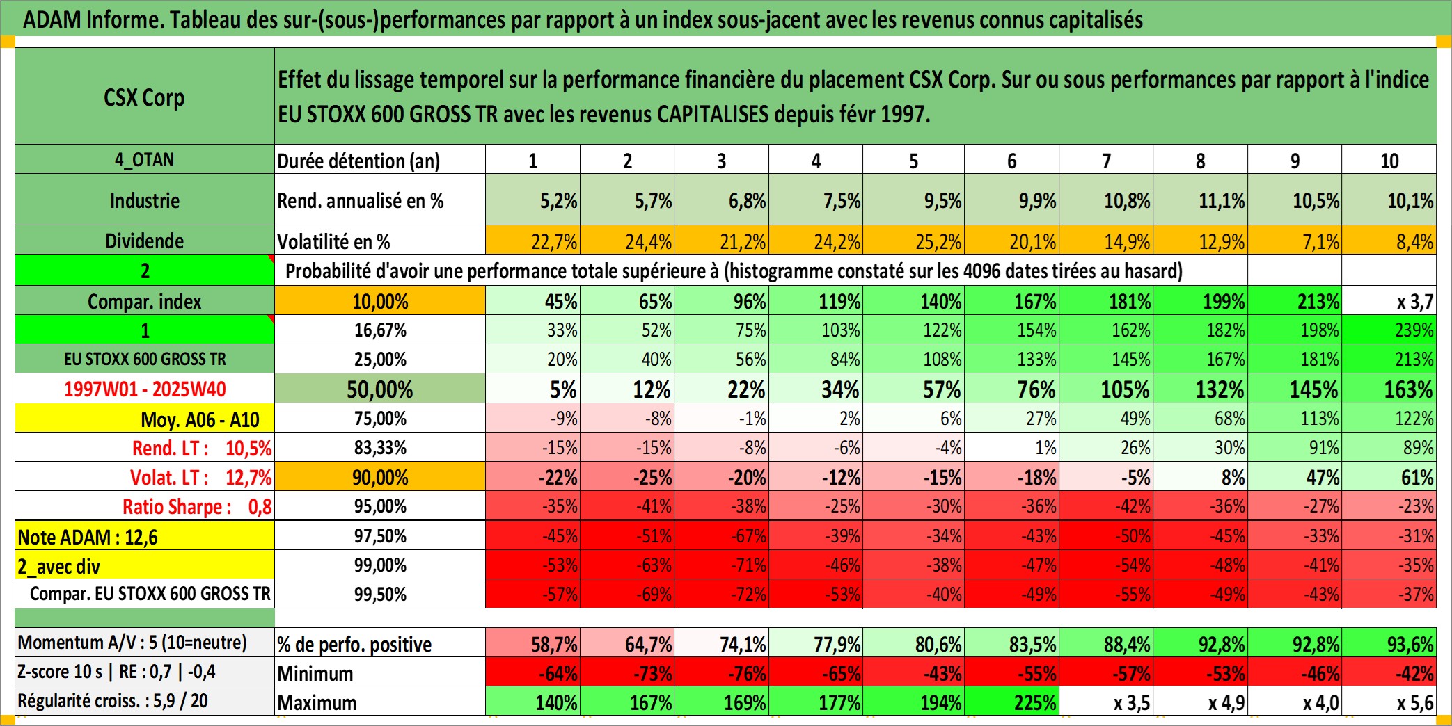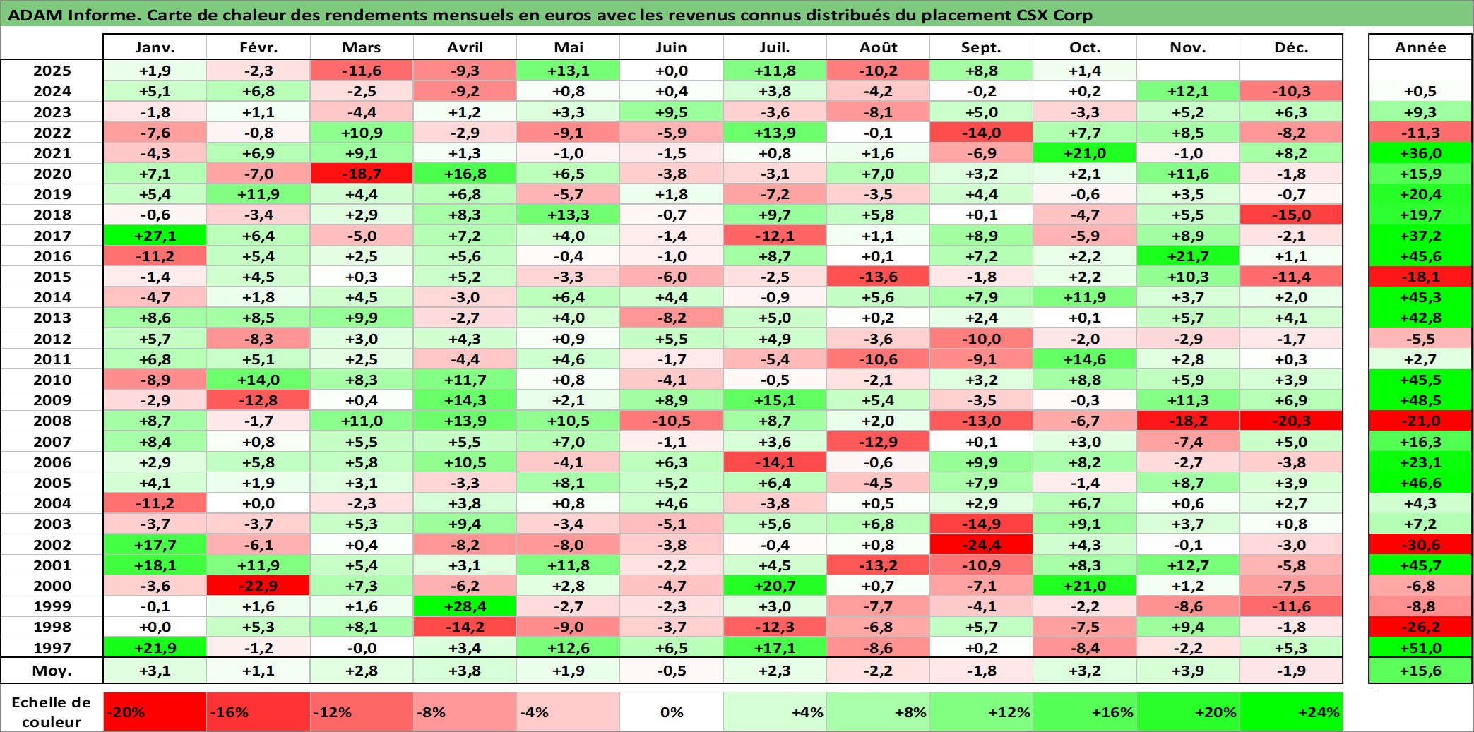 Site dédié aux investisseursPage dédiée sur site financeAnalyse des valorisations hebdomadaires de l'action CSX Corp. Cet actif est cote en USD. Les valorisations sont en contrevaleur EURO et couvrent les semaines 1997W01 a 2025W40. Les revenus de cet actif financier sont pris en compte depuis la semaine 1997W08. La note globale ESG de cet actif est estimee a 10.0 (apres rebasage entre 0 et 20).