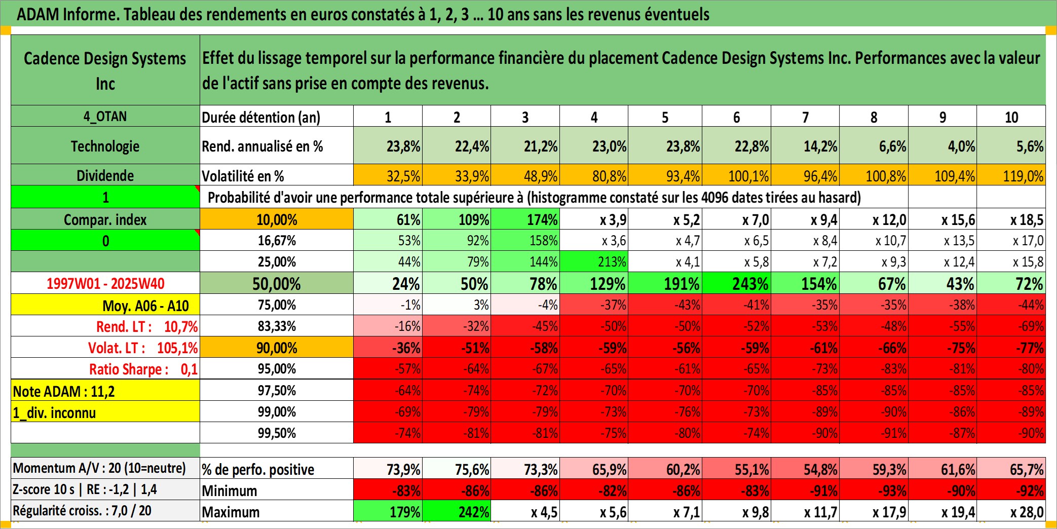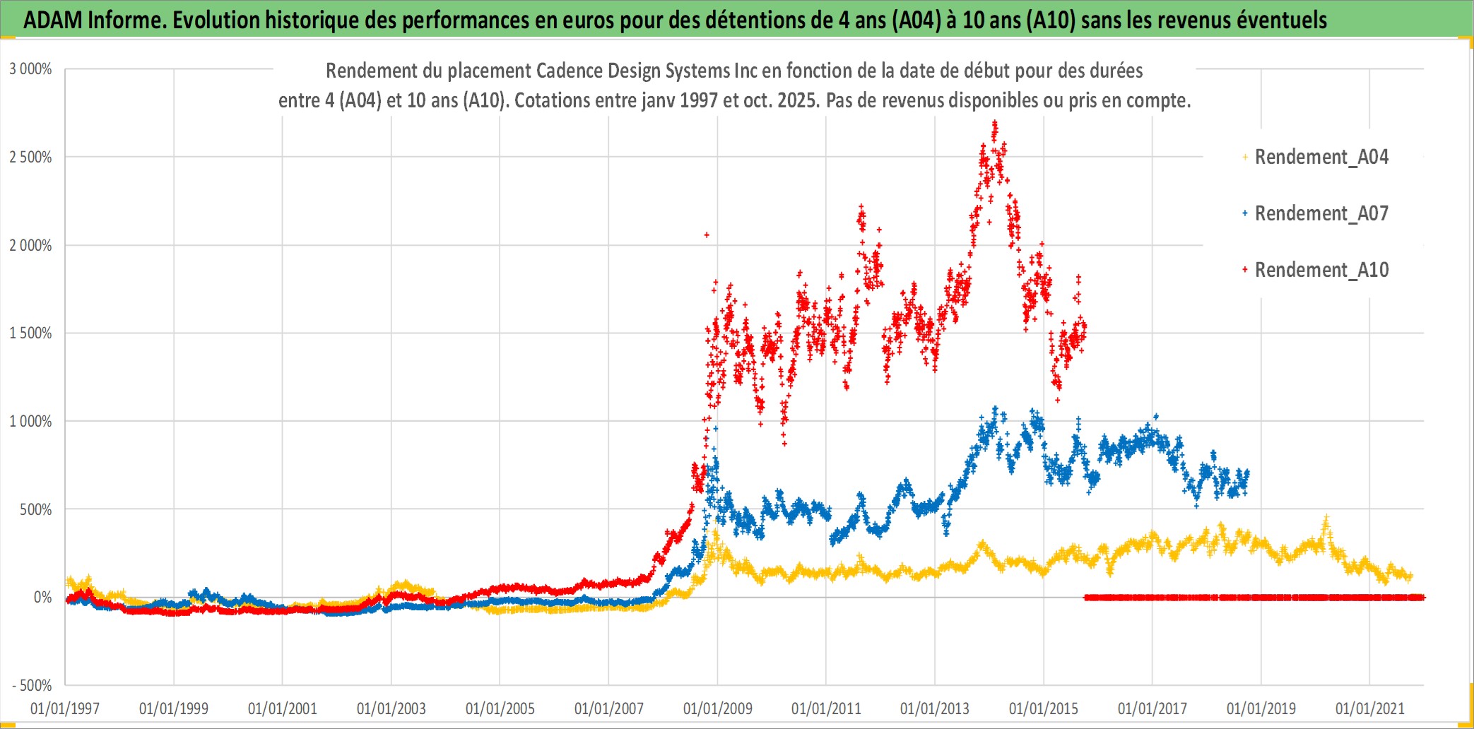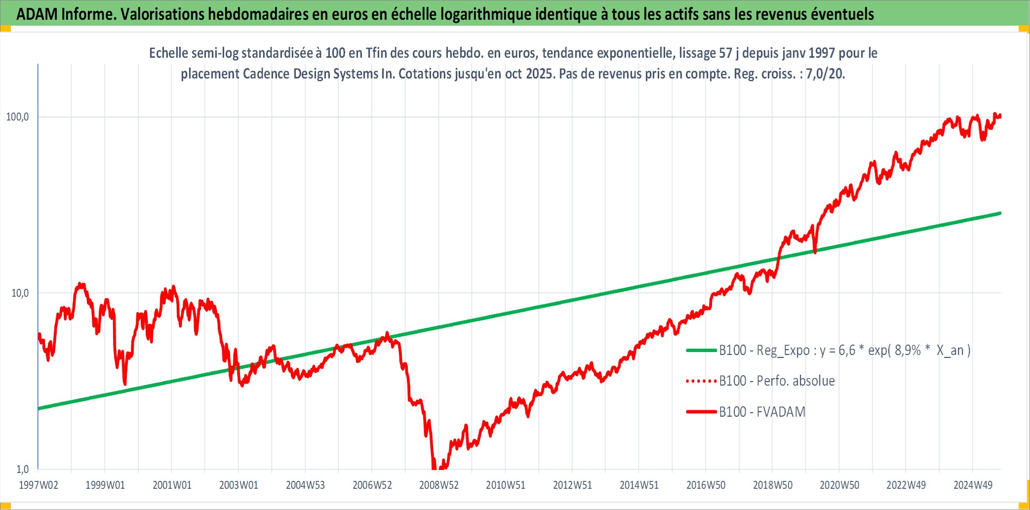 Site dédié aux investisseursPage dédiée sur site financeAnalyse des valorisations hebdomadaires de l'action Cadence Design Systems Inc. Cet actif est cote en USD. Les valorisations sont en contrevaleur EURO et couvrent les semaines 1997W01 a 2025W40. Les revenus de cet actif financier ne sont pas connus car non existants ou non disponibles sur le site Yahoo Finance. La note globale ESG de cet actif est estimee a 15.0 (apres rebasage entre 0 et 20).