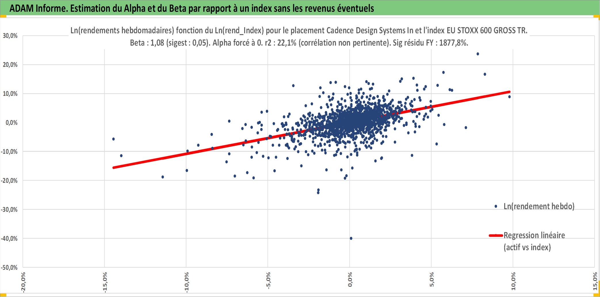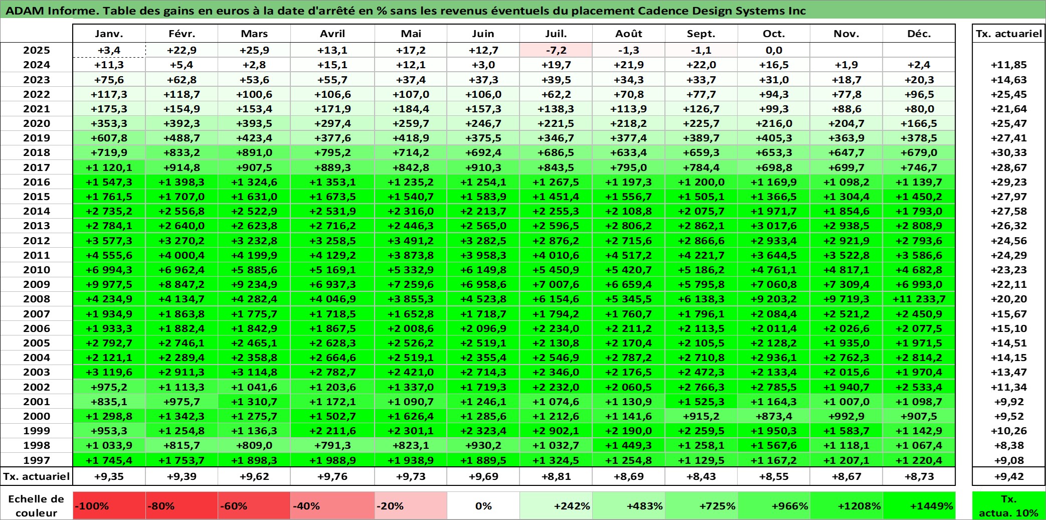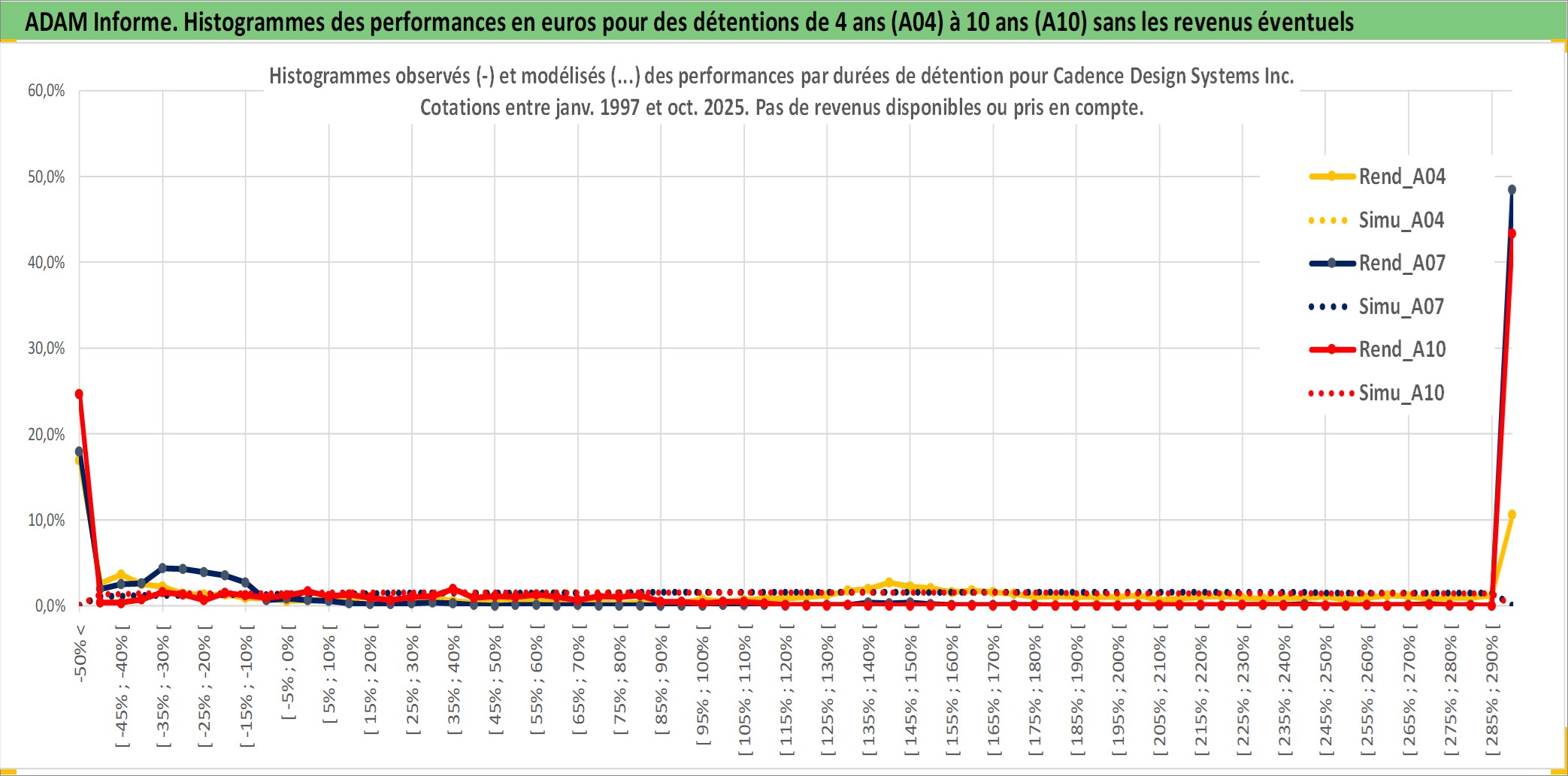 Site dédié aux investisseursPage dédiée sur site financeAnalyse des valorisations hebdomadaires de l'action Cadence Design Systems Inc. Cet actif est cote en USD. Les valorisations sont en contrevaleur EURO et couvrent les semaines 1997W01 a 2025W40. Les revenus de cet actif financier ne sont pas connus car non existants ou non disponibles sur le site Yahoo Finance. La note globale ESG de cet actif est estimee a 15.0 (apres rebasage entre 0 et 20).
