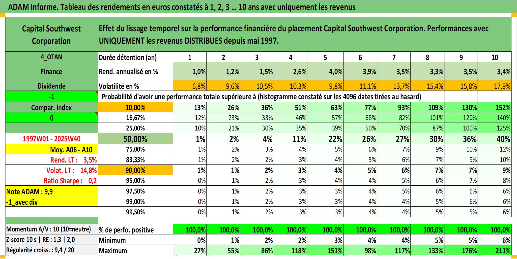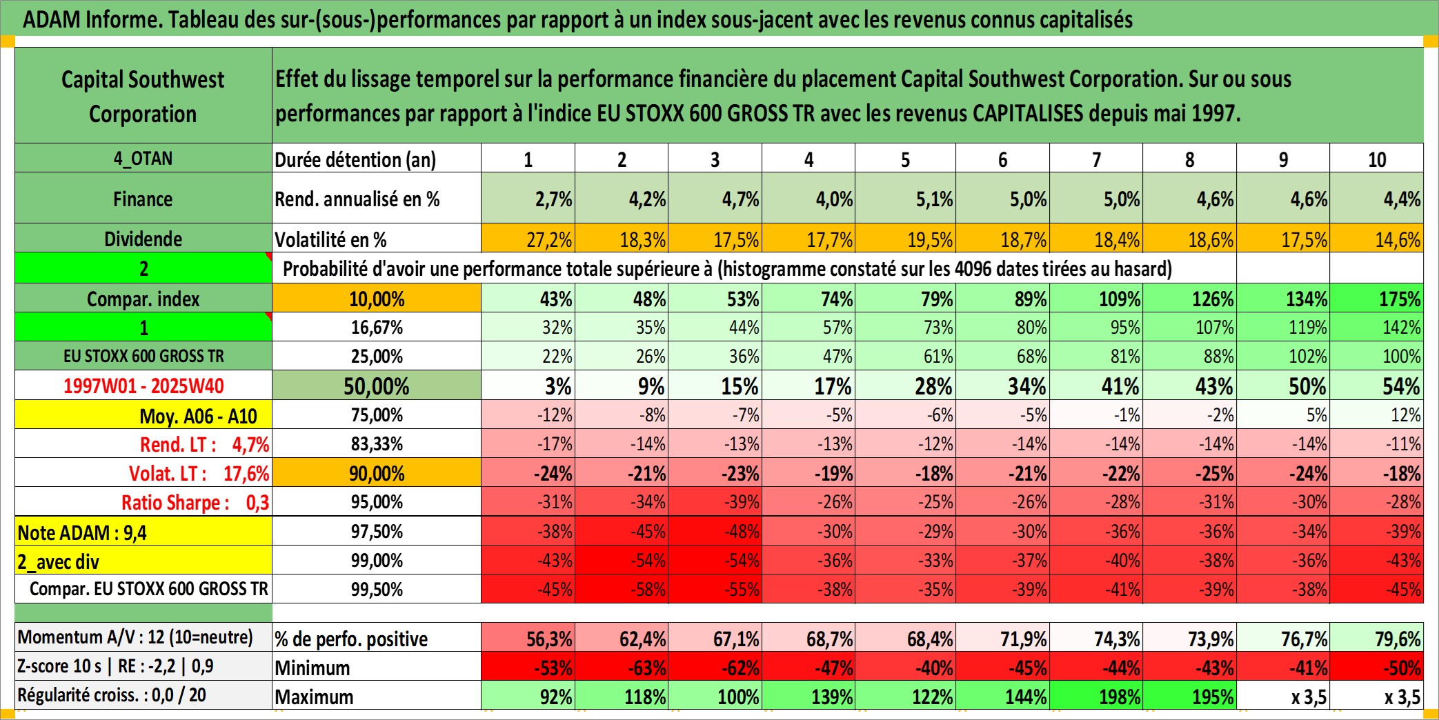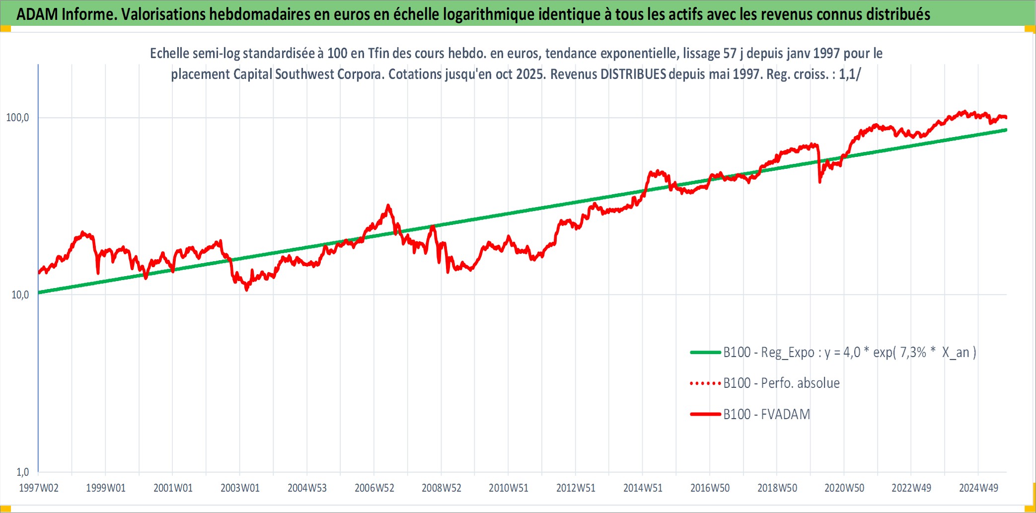 Site dédié aux investisseursPage dédiée sur site financeAnalyse des valorisations hebdomadaires de l'action Capital Southwest Corporation. Cet actif est cote en USD. Les valorisations sont en contrevaleur EURO et couvrent les semaines 1997W01 a 2025W40. Les revenus de cet actif financier sont pris en compte depuis la semaine 1997W20. La note ESG de cet actif n'est pas connue.