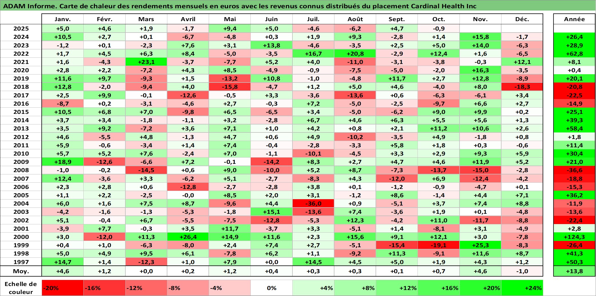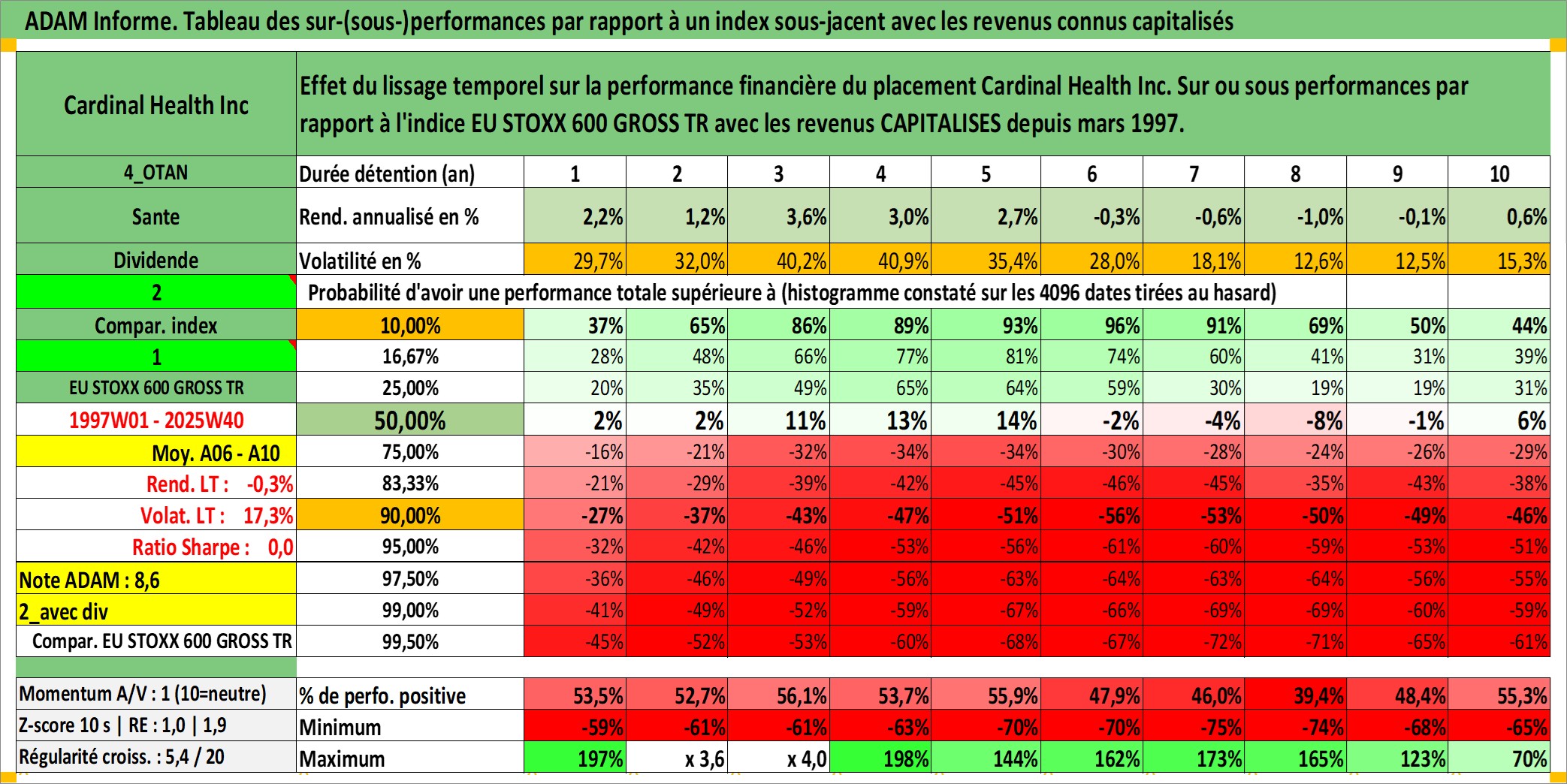 Site dédié aux investisseursPage dédiée sur site financeAnalyse des valorisations hebdomadaires de l'action Cardinal Health Inc. Cet actif est cote en USD. Les valorisations sont en contrevaleur EURO et couvrent les semaines 1997W01 a 2025W40. Les revenus de cet actif financier sont pris en compte depuis la semaine 1997W13. La note globale ESG de cet actif est estimee a 15.0 (apres rebasage entre 0 et 20).