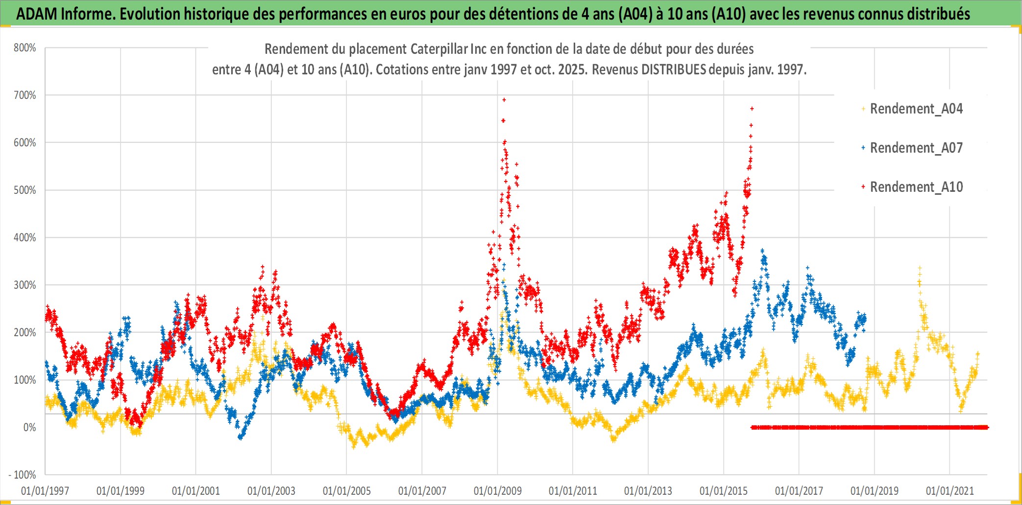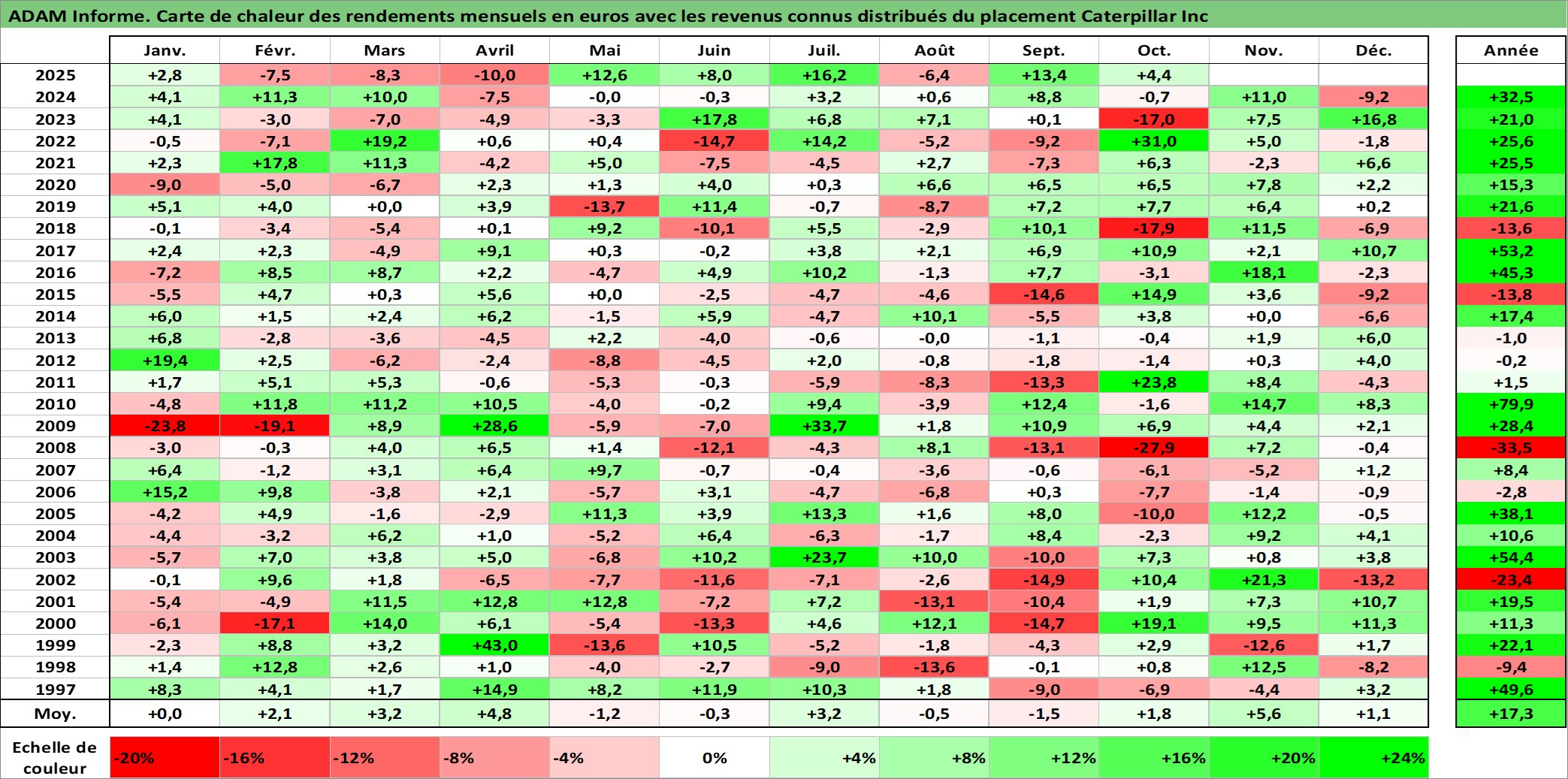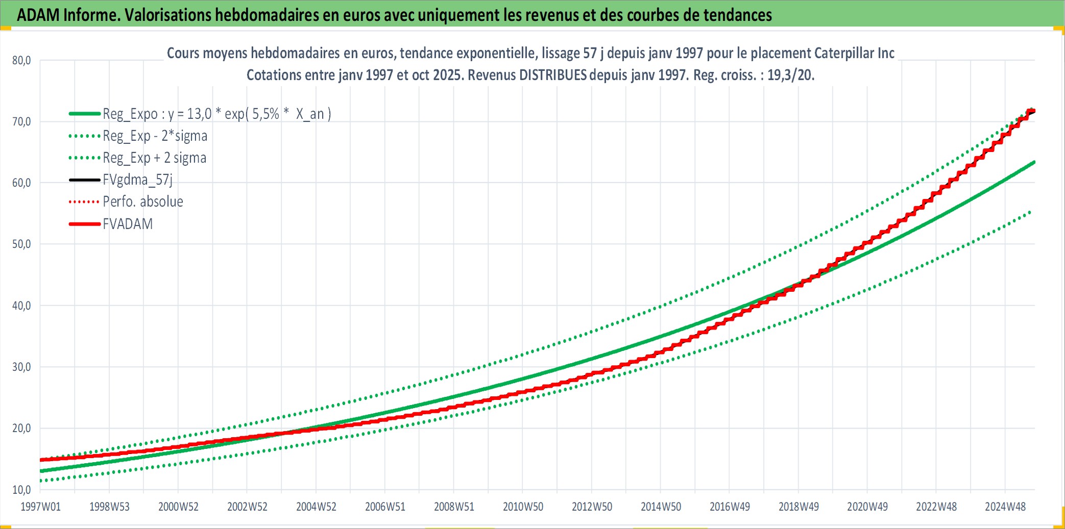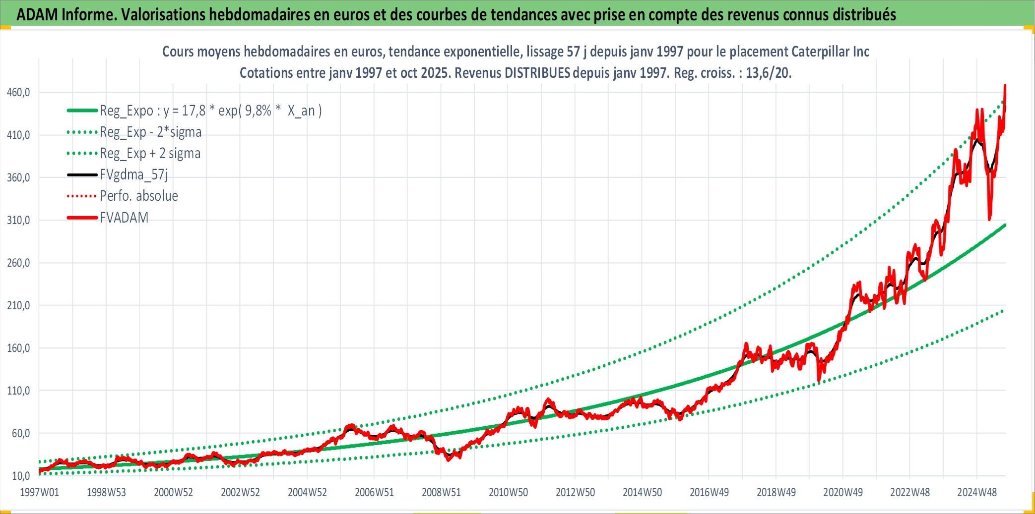 Site dédié aux investisseursPage dédiée sur site financeAnalyse des valorisations hebdomadaires de l'action Caterpillar Inc. Cet actif est cote en USD. Les valorisations sont en contrevaleur EURO et couvrent les semaines 1997W01 a 2025W40. Les revenus de cet actif financier sont pris en compte depuis la semaine 1997W03. La note globale ESG de cet actif est estimee a 4.0 (apres rebasage entre 0 et 20).