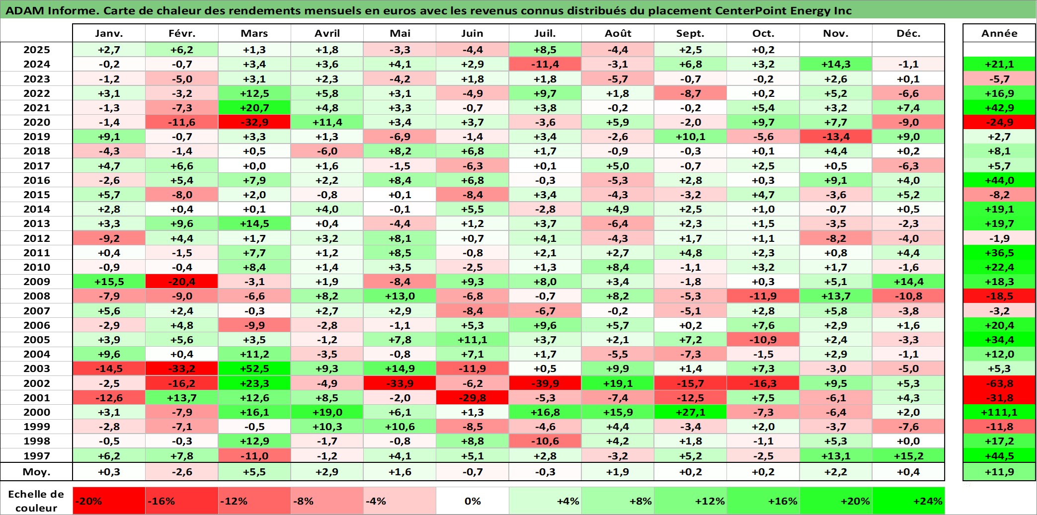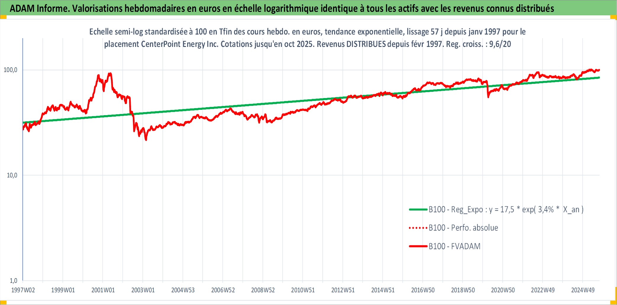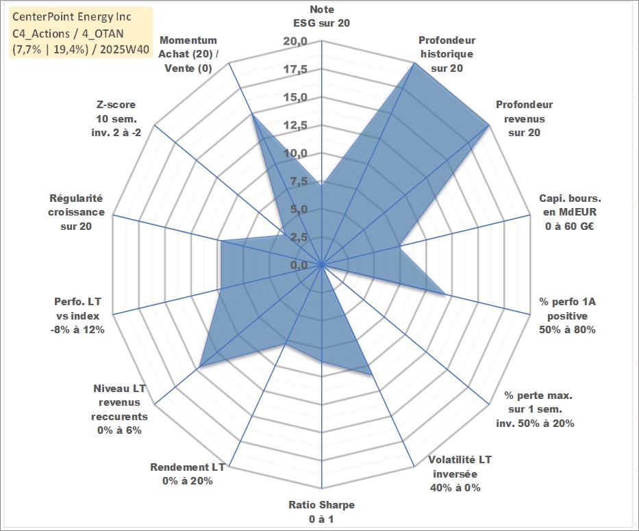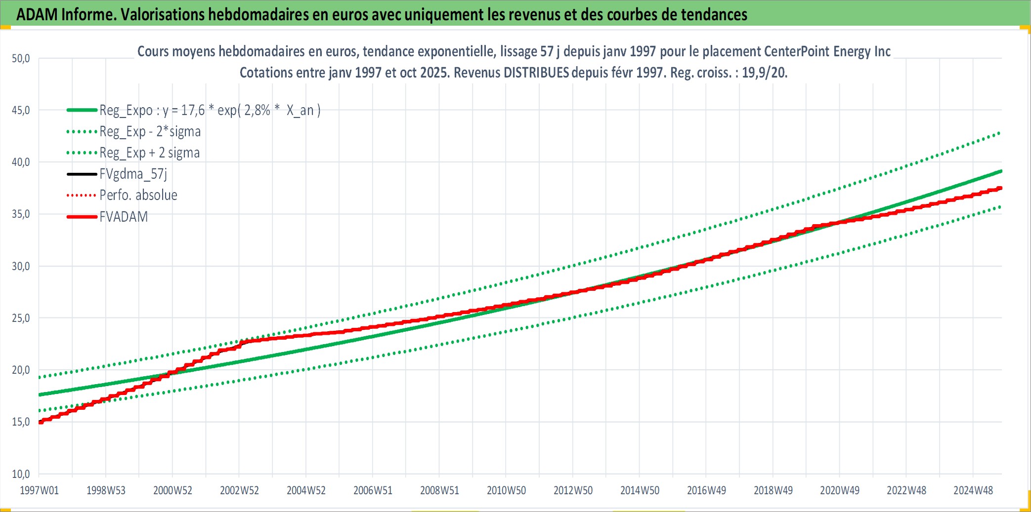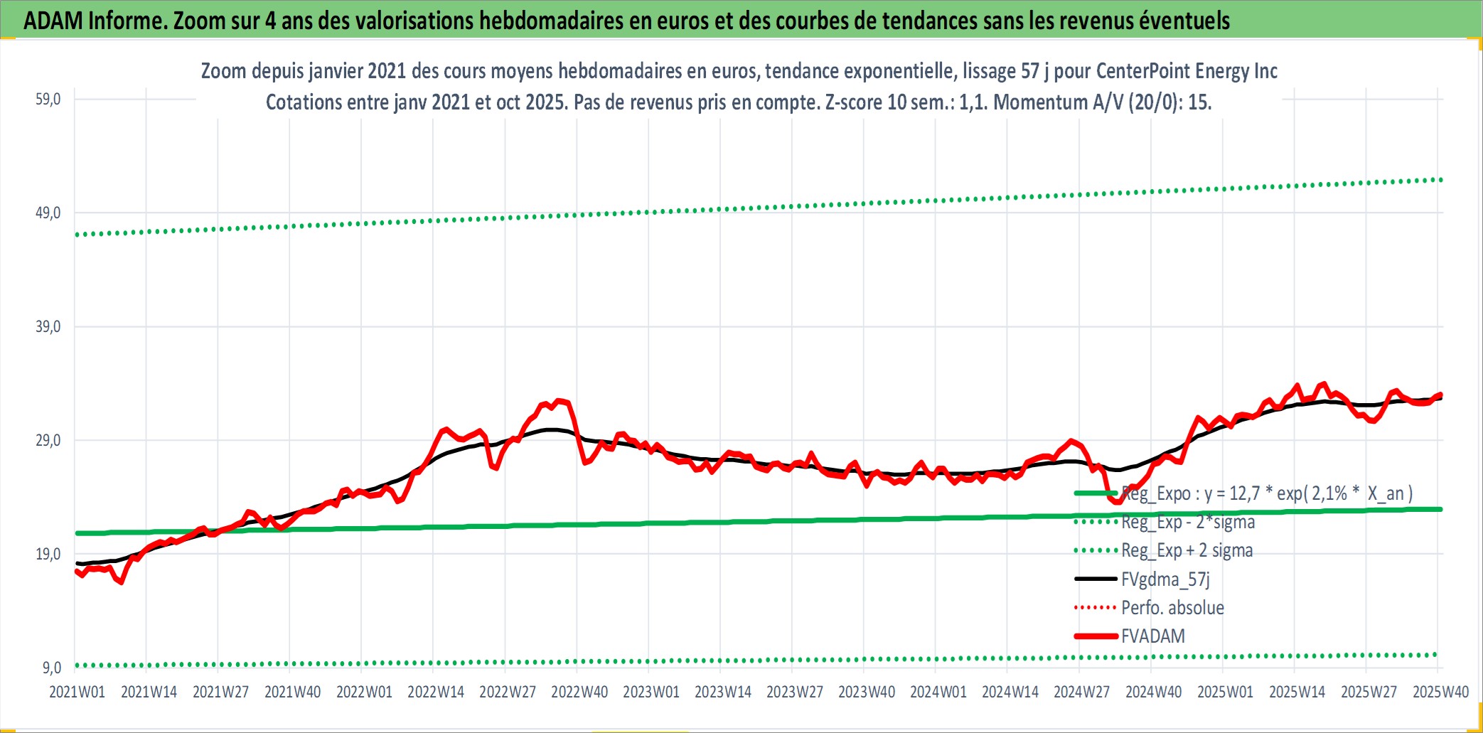 Site dédié aux investisseursPage dédiée sur site financeAnalyse des valorisations hebdomadaires de l'action CenterPoint Energy Inc. Cet actif est cote en USD. Les valorisations sont en contrevaleur EURO et couvrent les semaines 1997W01 a 2025W40. Les revenus de cet actif financier sont pris en compte depuis la semaine 1997W07. La note globale ESG de cet actif est estimee a 7.0 (apres rebasage entre 0 et 20).