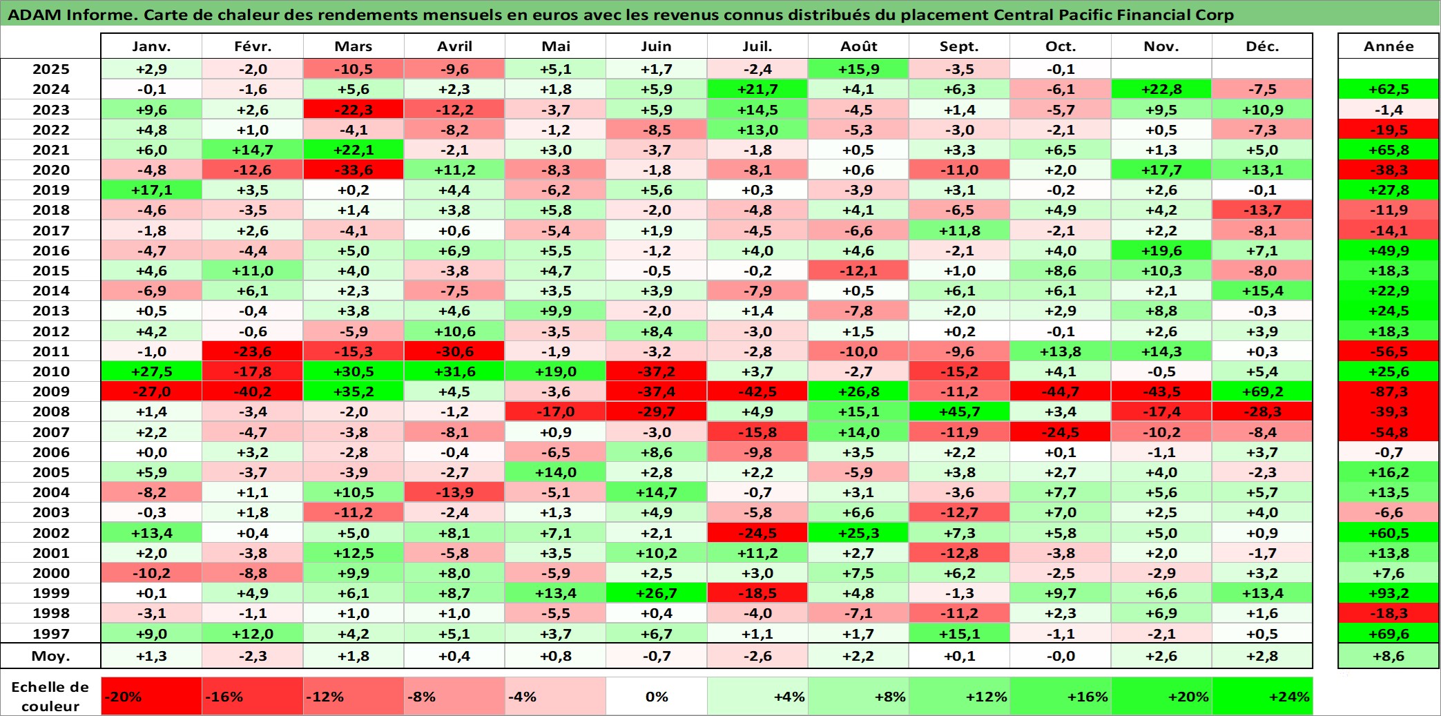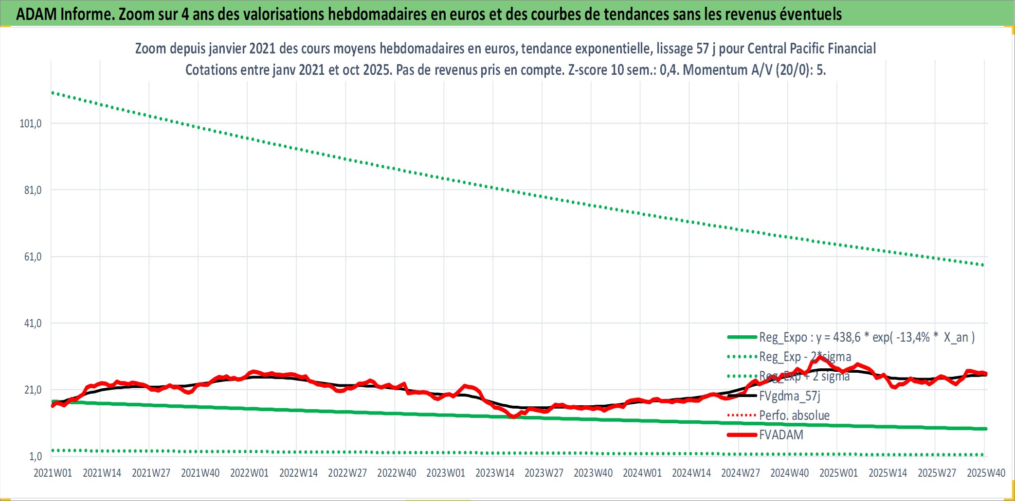 Site dédié aux investisseursPage dédiée sur site financeAnalyse des valorisations hebdomadaires de l'action Central Pacific Financial Corp. Cet actif est cote en USD. Les valorisations sont en contrevaleur EURO et couvrent les semaines 1997W01 a 2025W40. Les revenus de cet actif financier sont pris en compte depuis la semaine 1997W13. La note ESG de cet actif n'est pas connue.