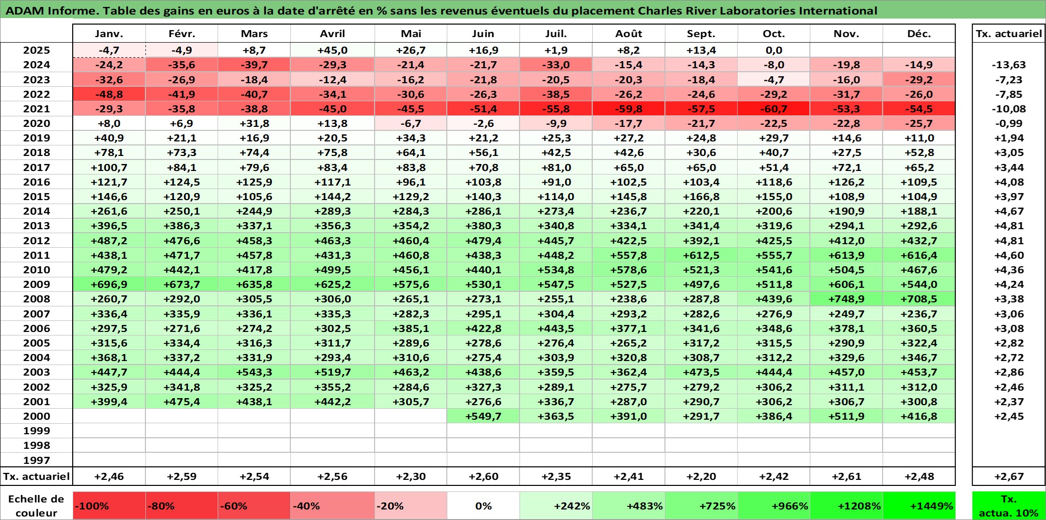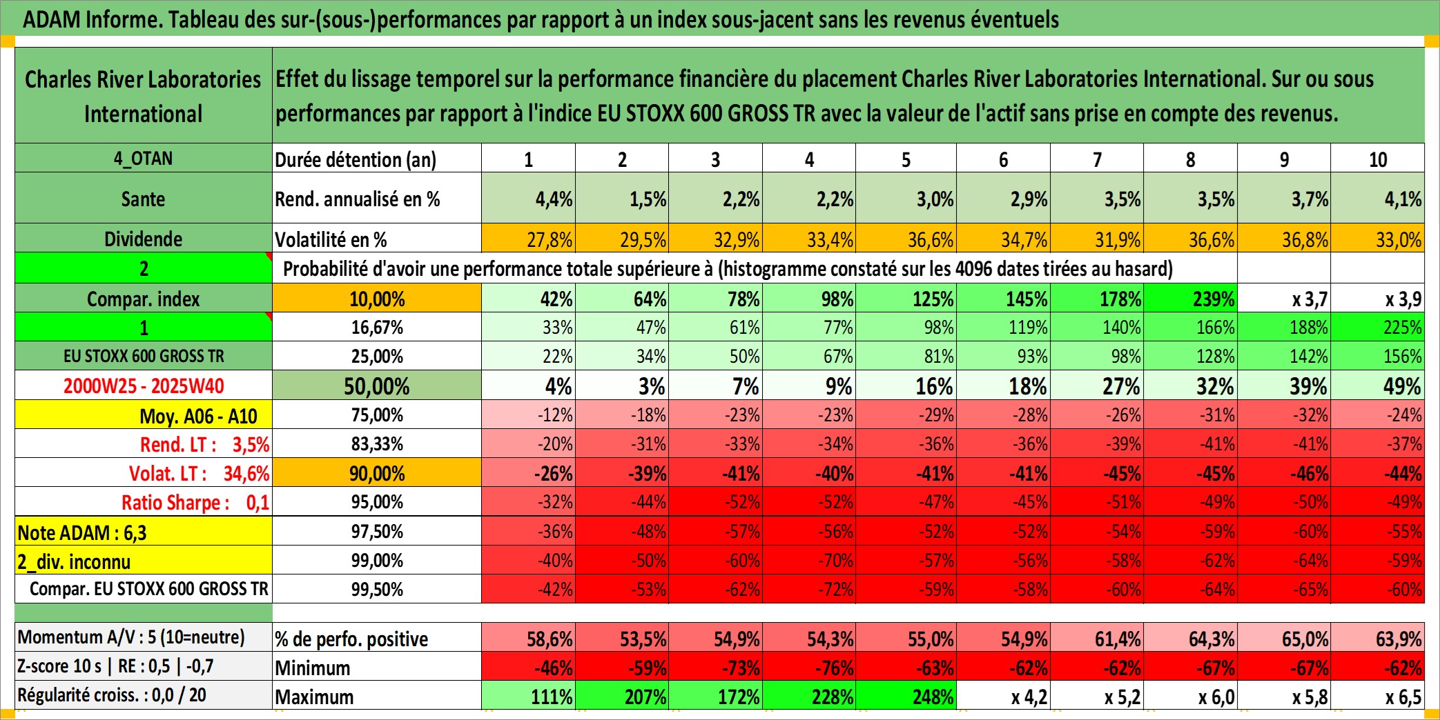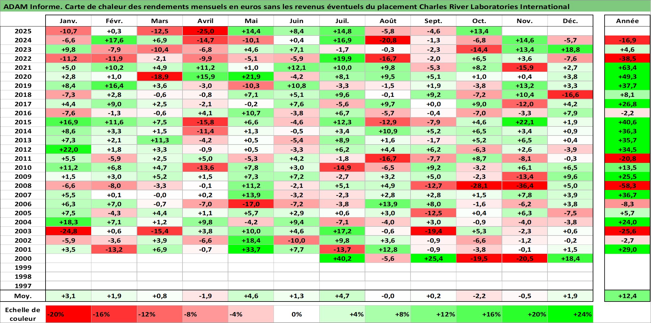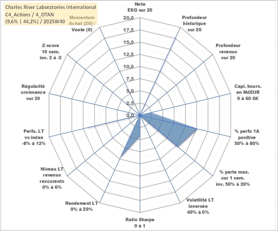 Site dédié aux investisseursPage dédiée sur site financeAnalyse des valorisations hebdomadaires de l'action Charles River Laboratories International. Cet actif est cote en USD. Les valorisations sont en contrevaleur EURO et couvrent les semaines 2000W25 a 2025W40. Les revenus de cet actif financier ne sont pas connus car non existants ou non disponibles sur le site Yahoo Finance. La note ESG de cet actif n'est pas connue.