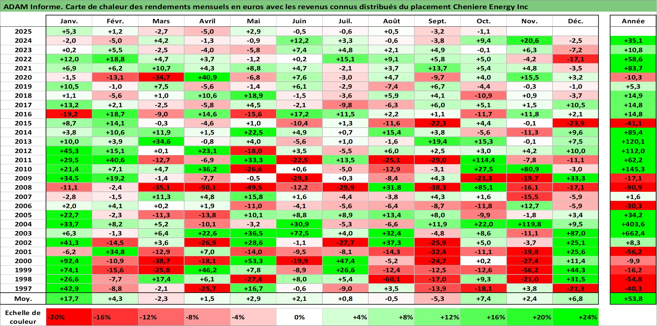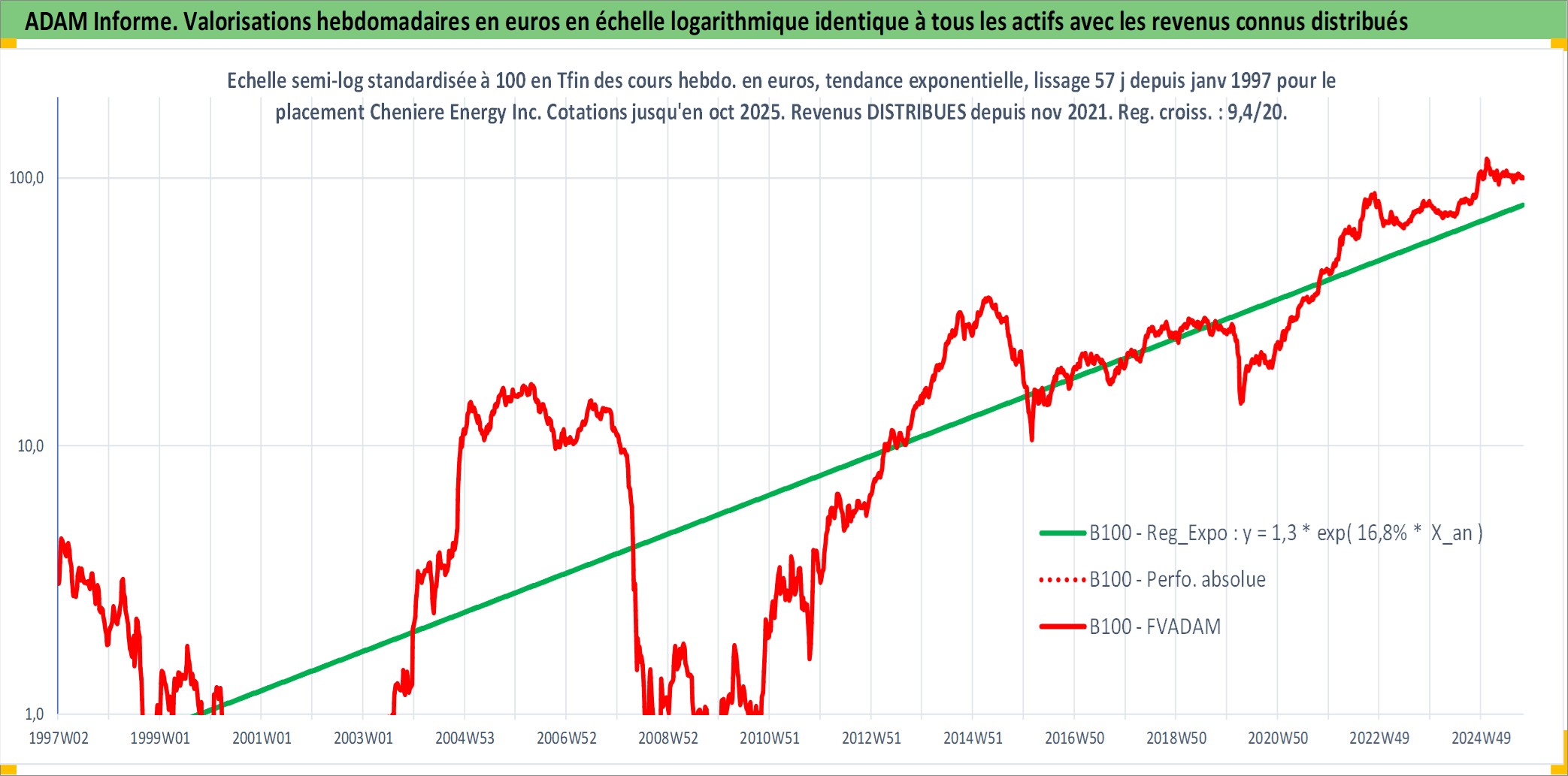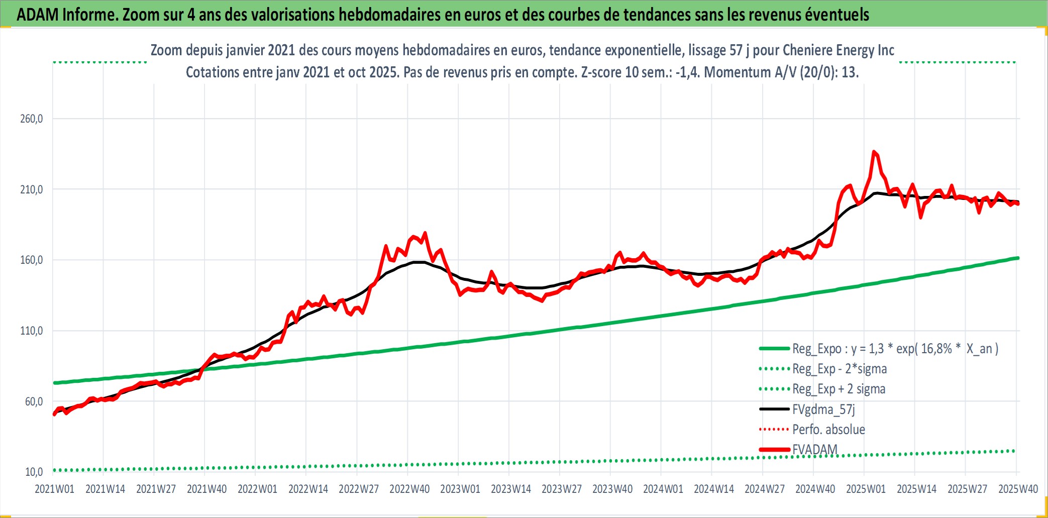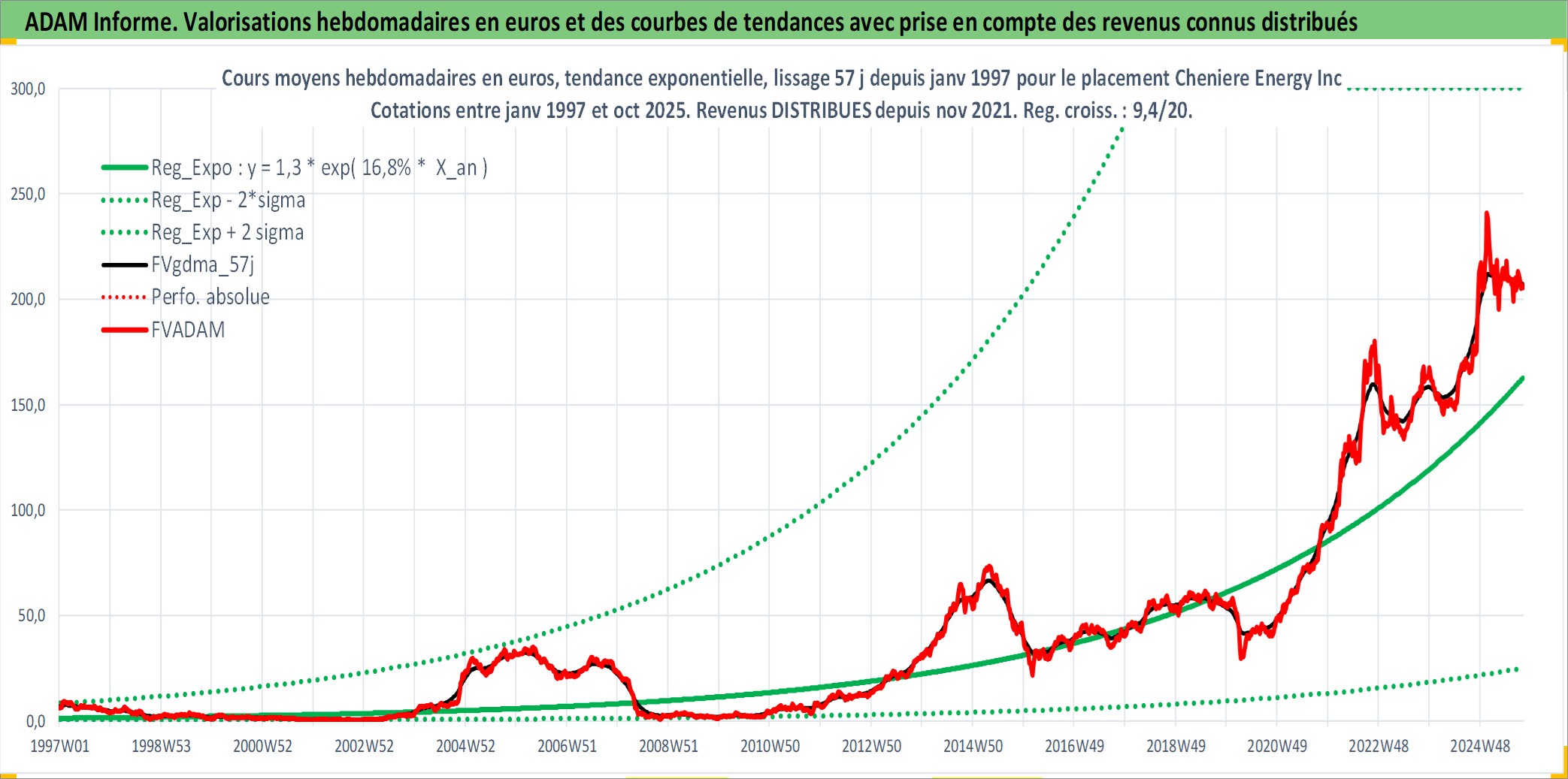 Site dédié aux investisseursPage dédiée sur site financeAnalyse des valorisations hebdomadaires de l'action Cheniere Energy Inc. Cet actif est cote en USD. Les valorisations sont en contrevaleur EURO et couvrent les semaines 1997W01 a 2025W40. Les revenus de cet actif financier sont pris en compte depuis la semaine 2021W44. La note globale ESG de cet actif est estimee a 9.0 (apres rebasage entre 0 et 20).