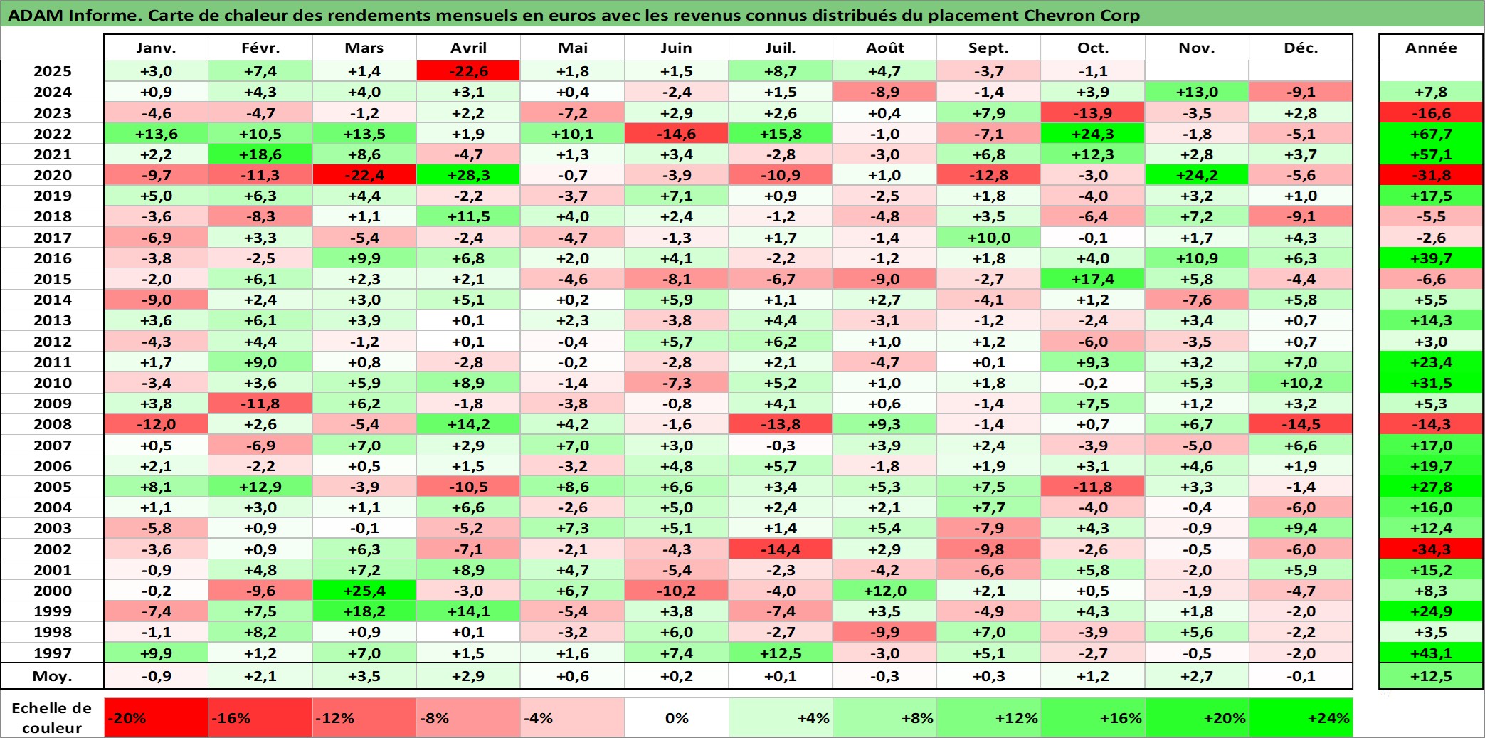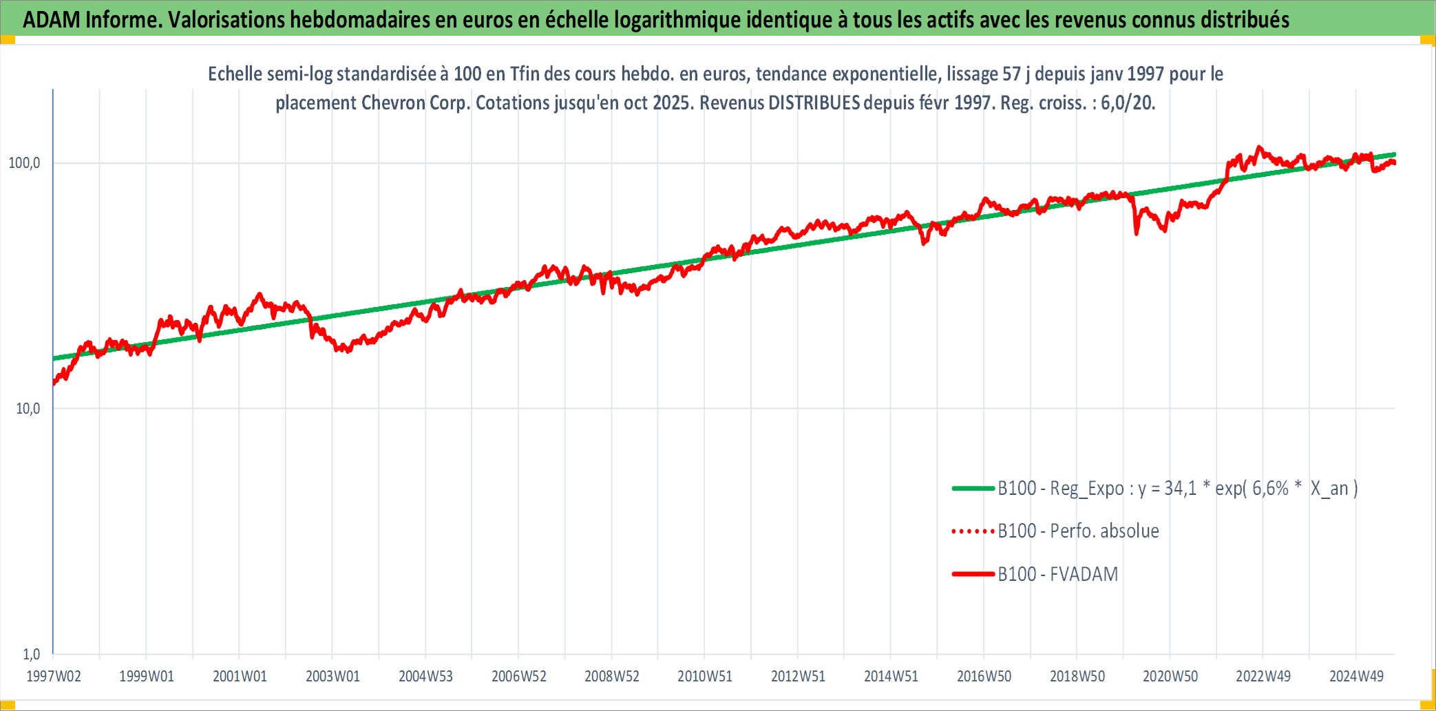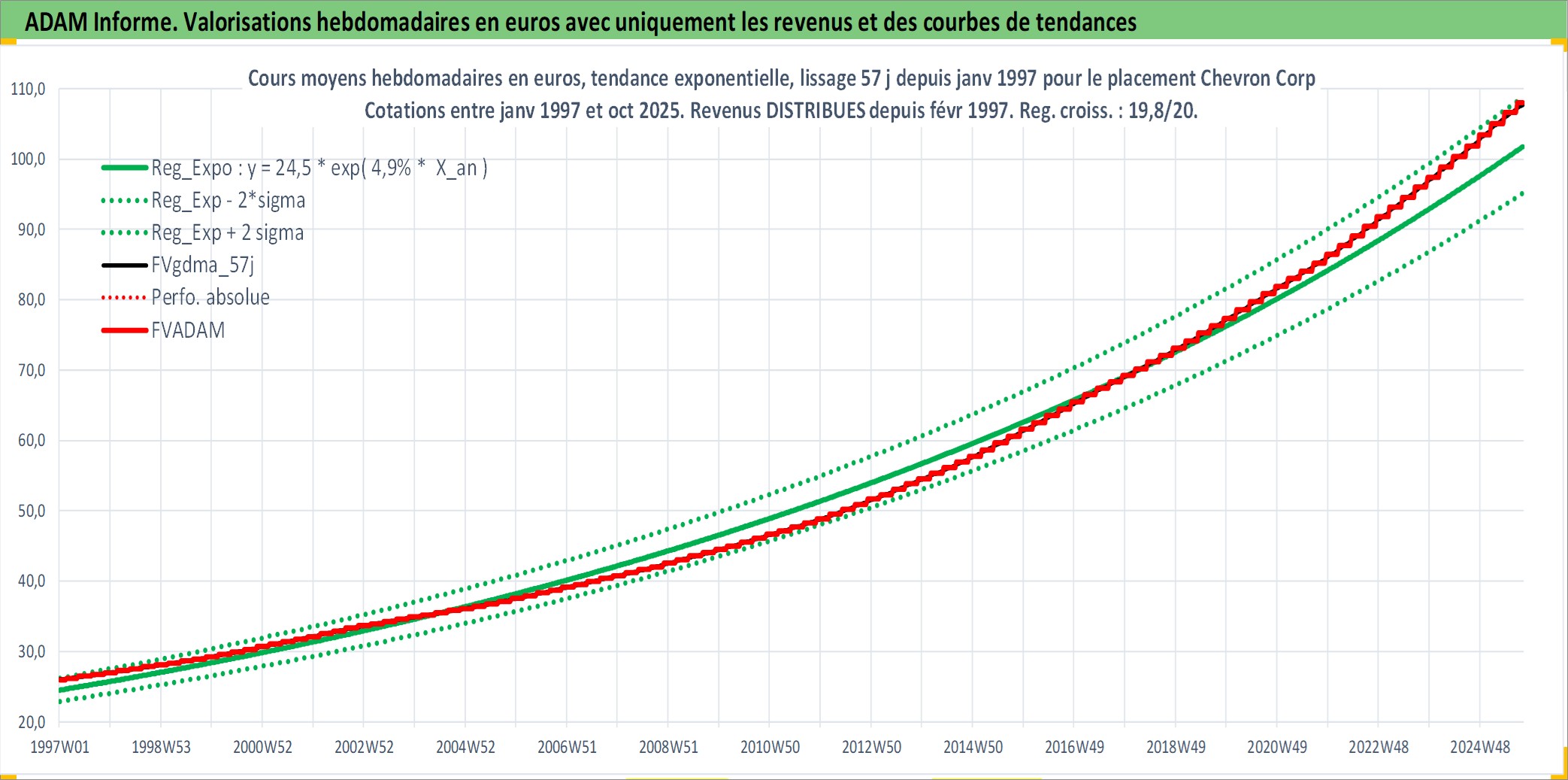 Site dédié aux investisseursPage dédiée sur site financeAnalyse des valorisations hebdomadaires de l'action Chevron Corp. Cet actif est cote en USD. Les valorisations sont en contrevaleur EURO et couvrent les semaines 1997W01 a 2025W40. Les revenus de cet actif financier sont pris en compte depuis la semaine 1997W08. La note globale ESG de cet actif est estimee a 2.0 (apres rebasage entre 0 et 20).