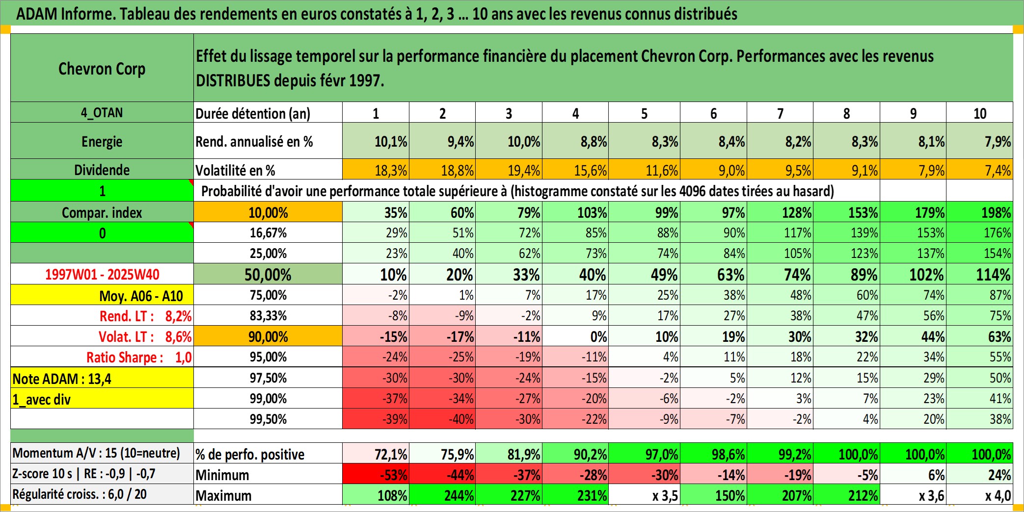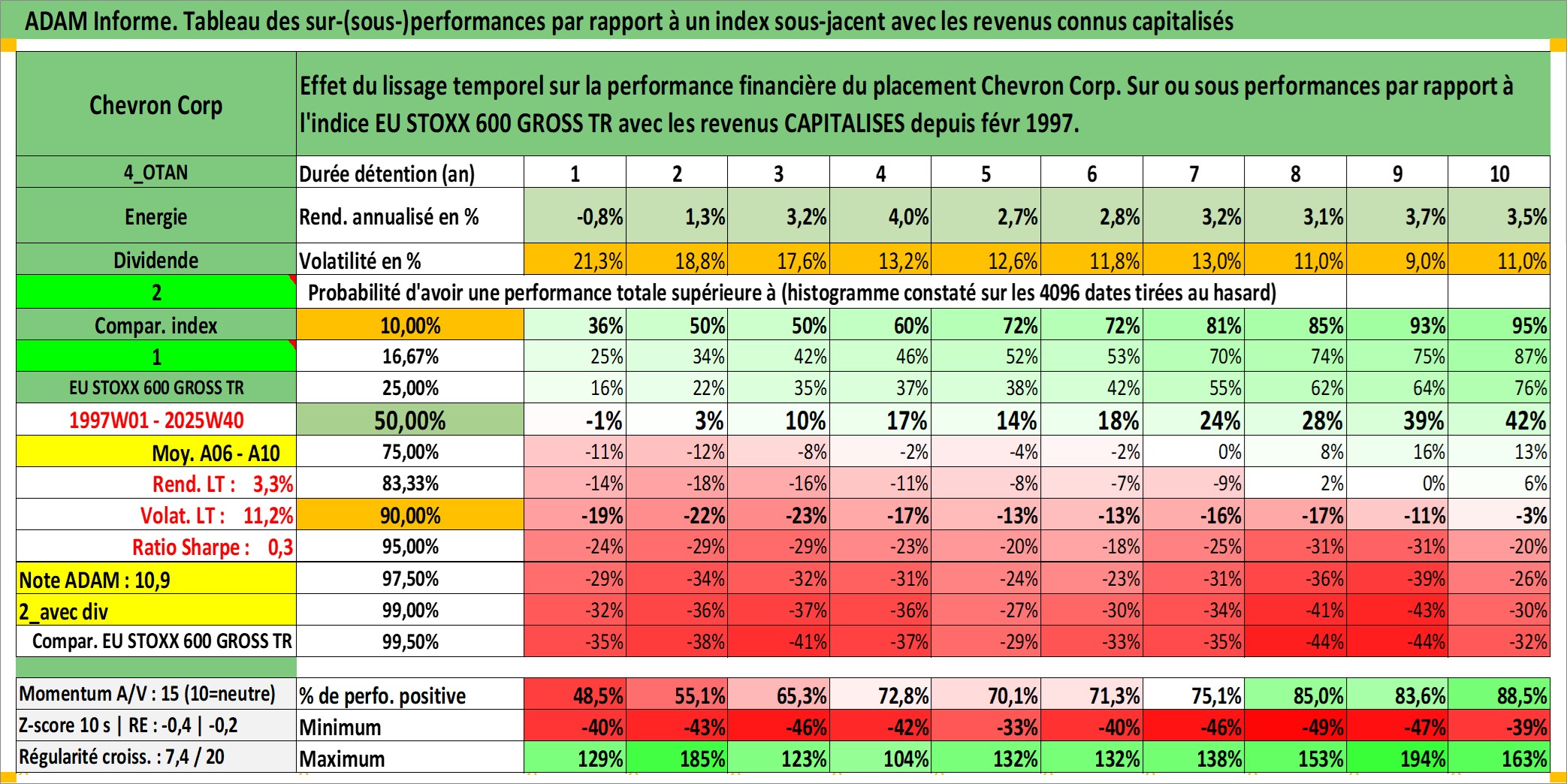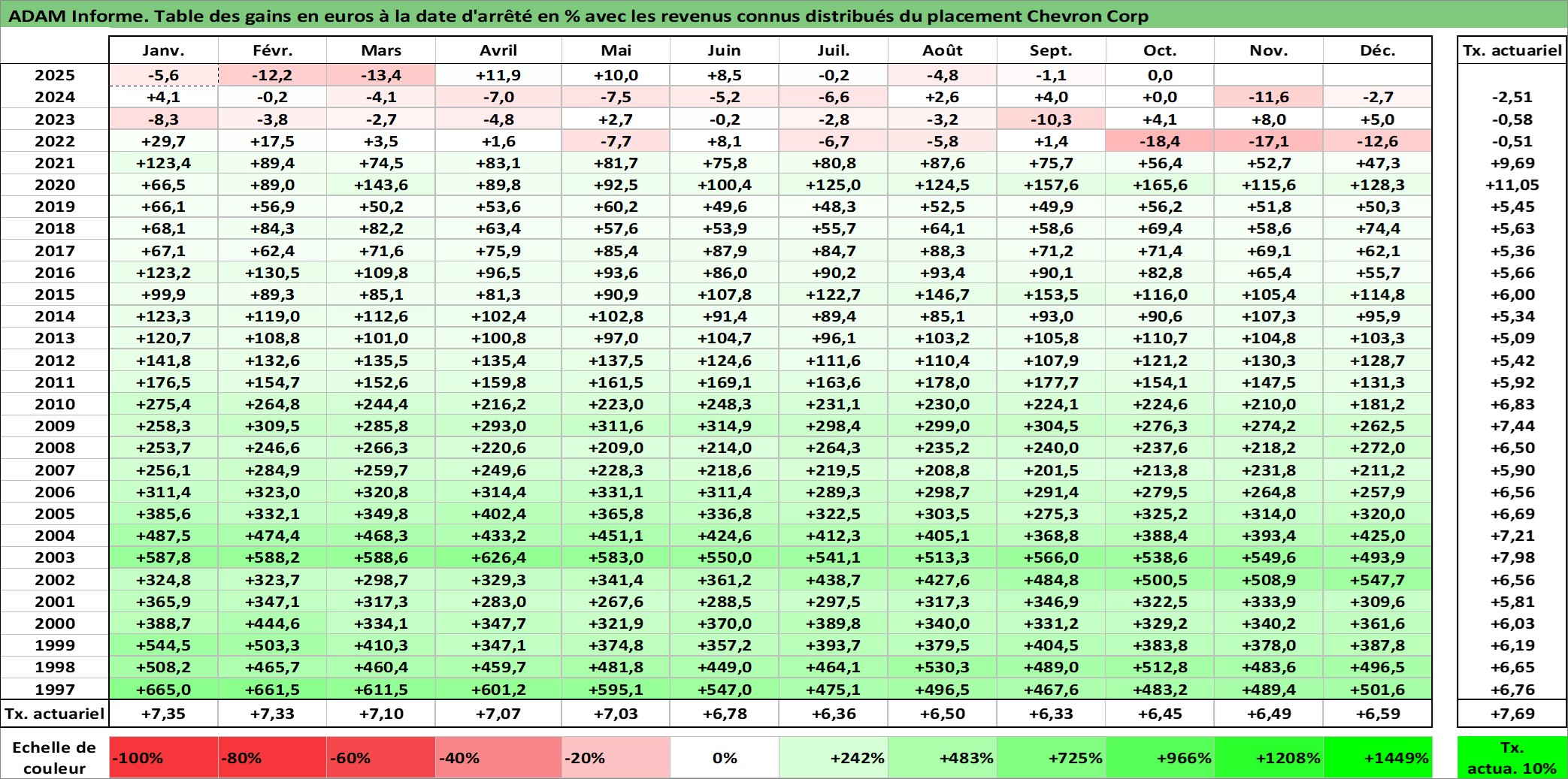 Site dédié aux investisseursPage dédiée sur site financeAnalyse des valorisations hebdomadaires de l'action Chevron Corp. Cet actif est cote en USD. Les valorisations sont en contrevaleur EURO et couvrent les semaines 1997W01 a 2025W40. Les revenus de cet actif financier sont pris en compte depuis la semaine 1997W08. La note globale ESG de cet actif est estimee a 2.0 (apres rebasage entre 0 et 20).