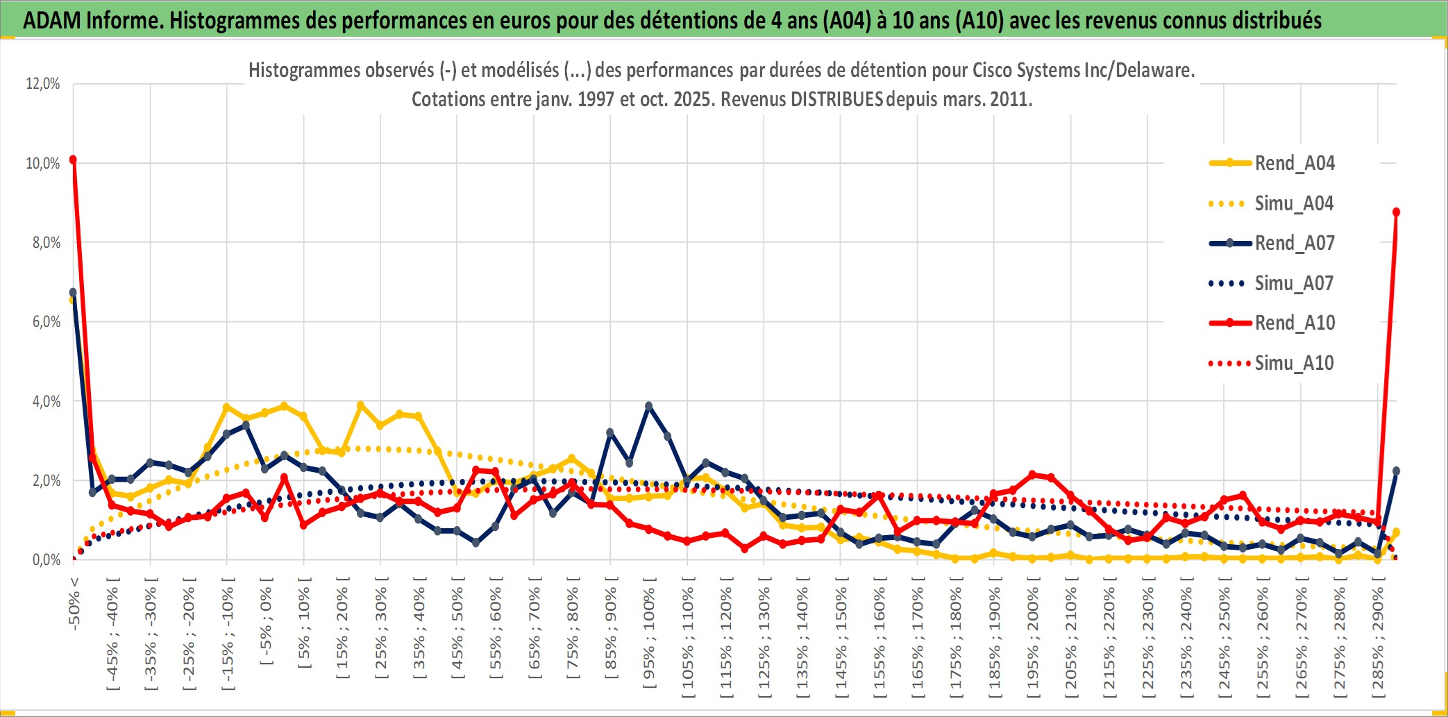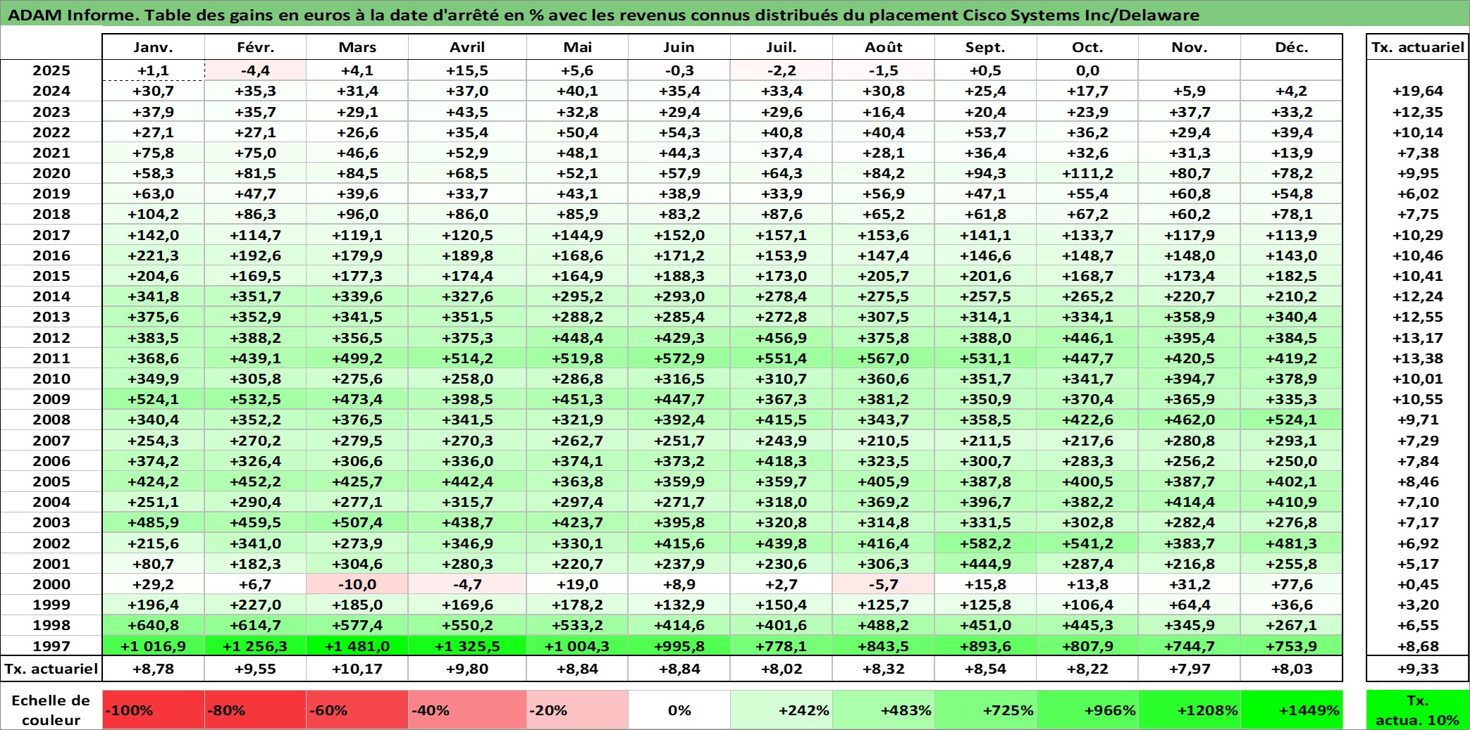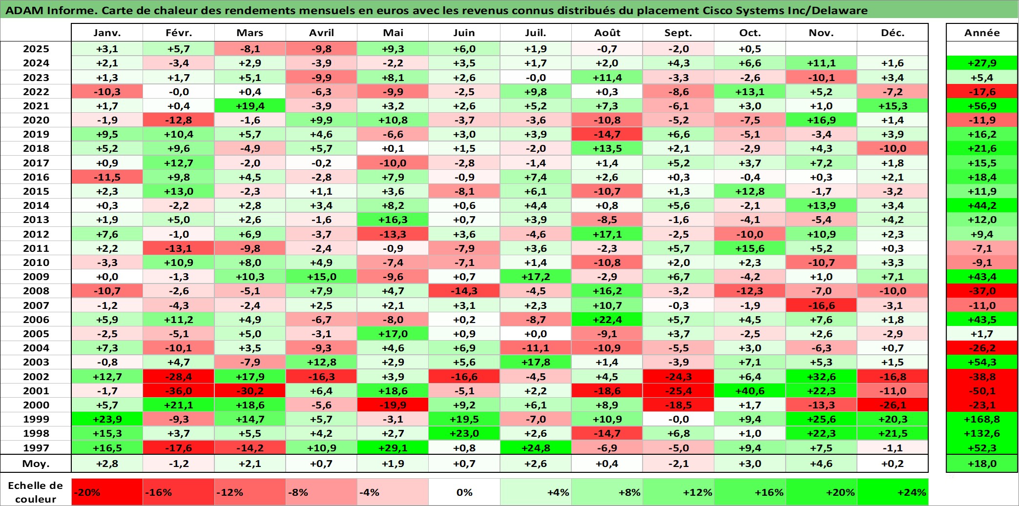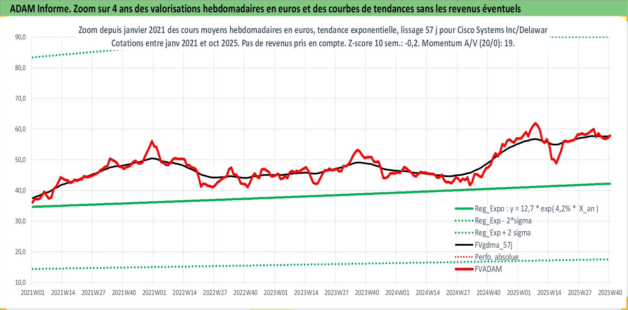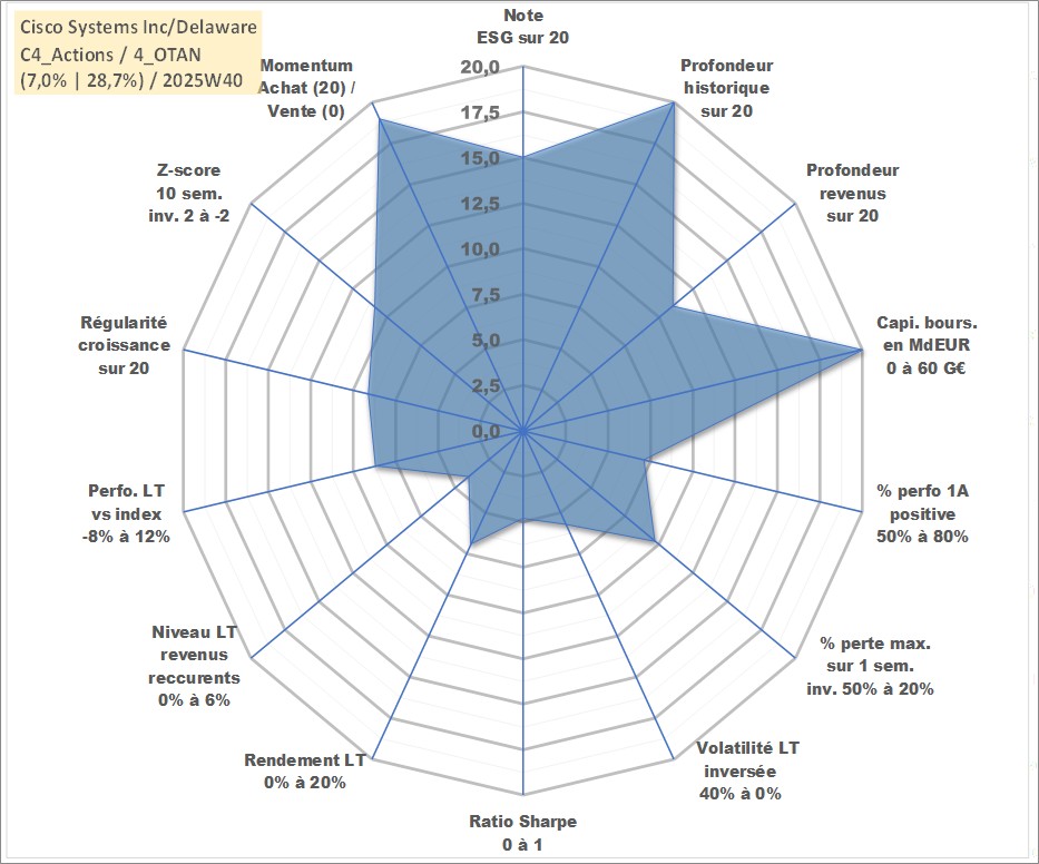 Site dédié aux investisseursPage dédiée sur site financeAnalyse des valorisations hebdomadaires de l'action Cisco Systems Inc/Delaware. Cet actif est cote en USD. Les valorisations sont en contrevaleur EURO et couvrent les semaines 1997W01 a 2025W40. Les revenus de cet actif financier sont pris en compte depuis la semaine 2011W13. La note globale ESG de cet actif est estimee a 15.0 (apres rebasage entre 0 et 20).