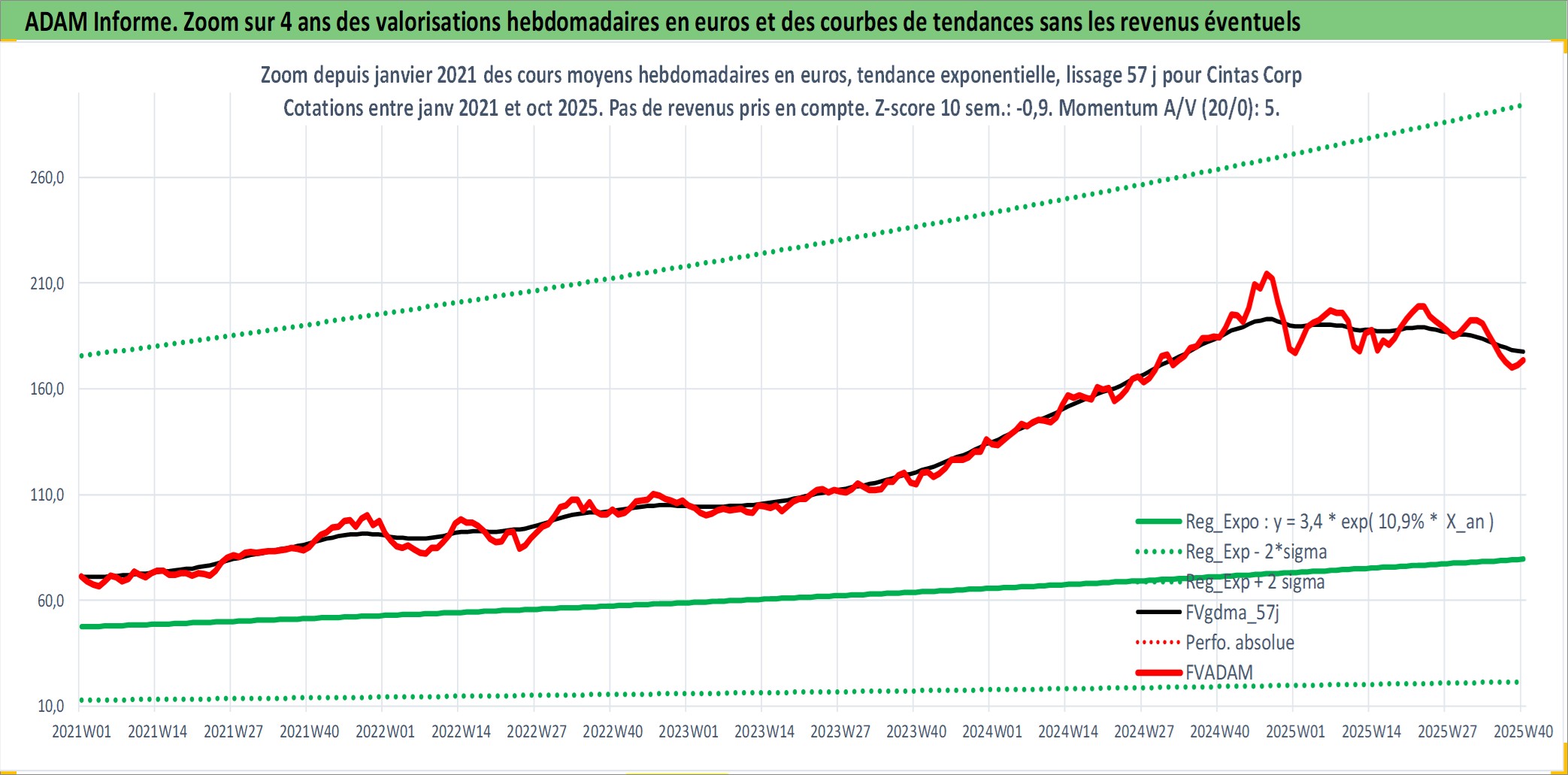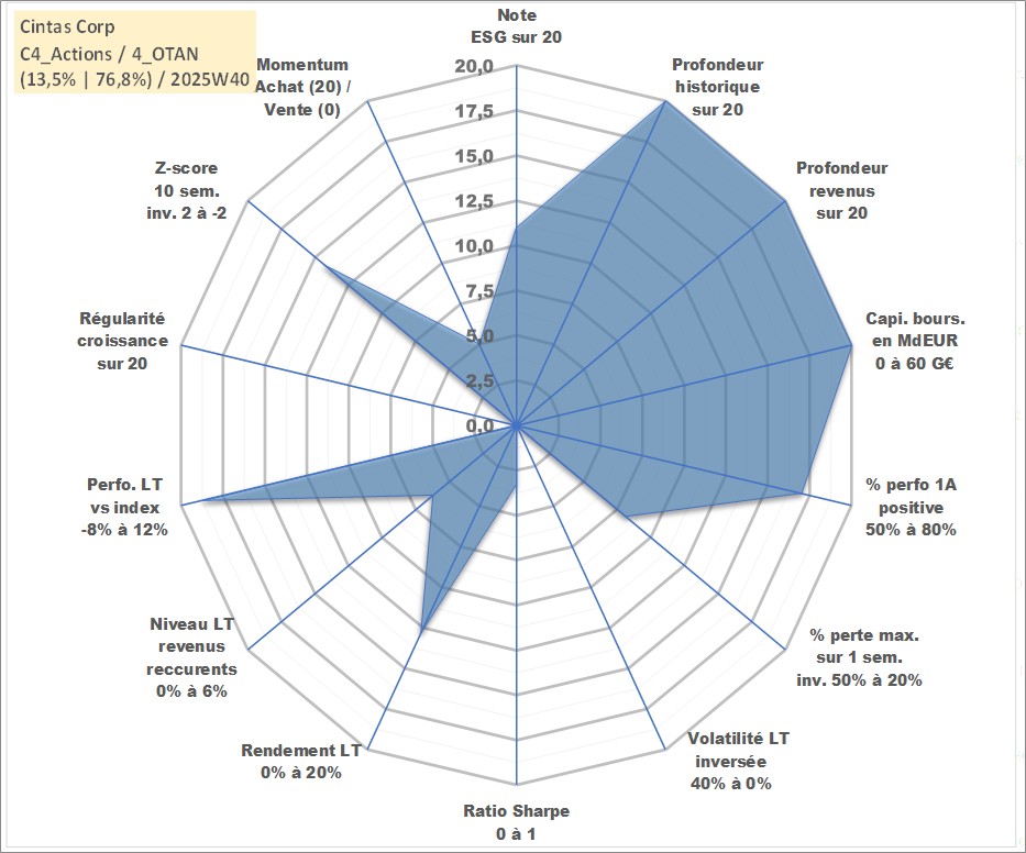 Site dédié aux investisseursPage dédiée sur site financeAnalyse des valorisations hebdomadaires de l'action Cintas Corp. Cet actif est cote en USD. Les valorisations sont en contrevaleur EURO et couvrent les semaines 1997W01 a 2025W40. Les revenus de cet actif financier sont pris en compte depuis la semaine 1997W10. La note globale ESG de cet actif est estimee a 11.0 (apres rebasage entre 0 et 20).
