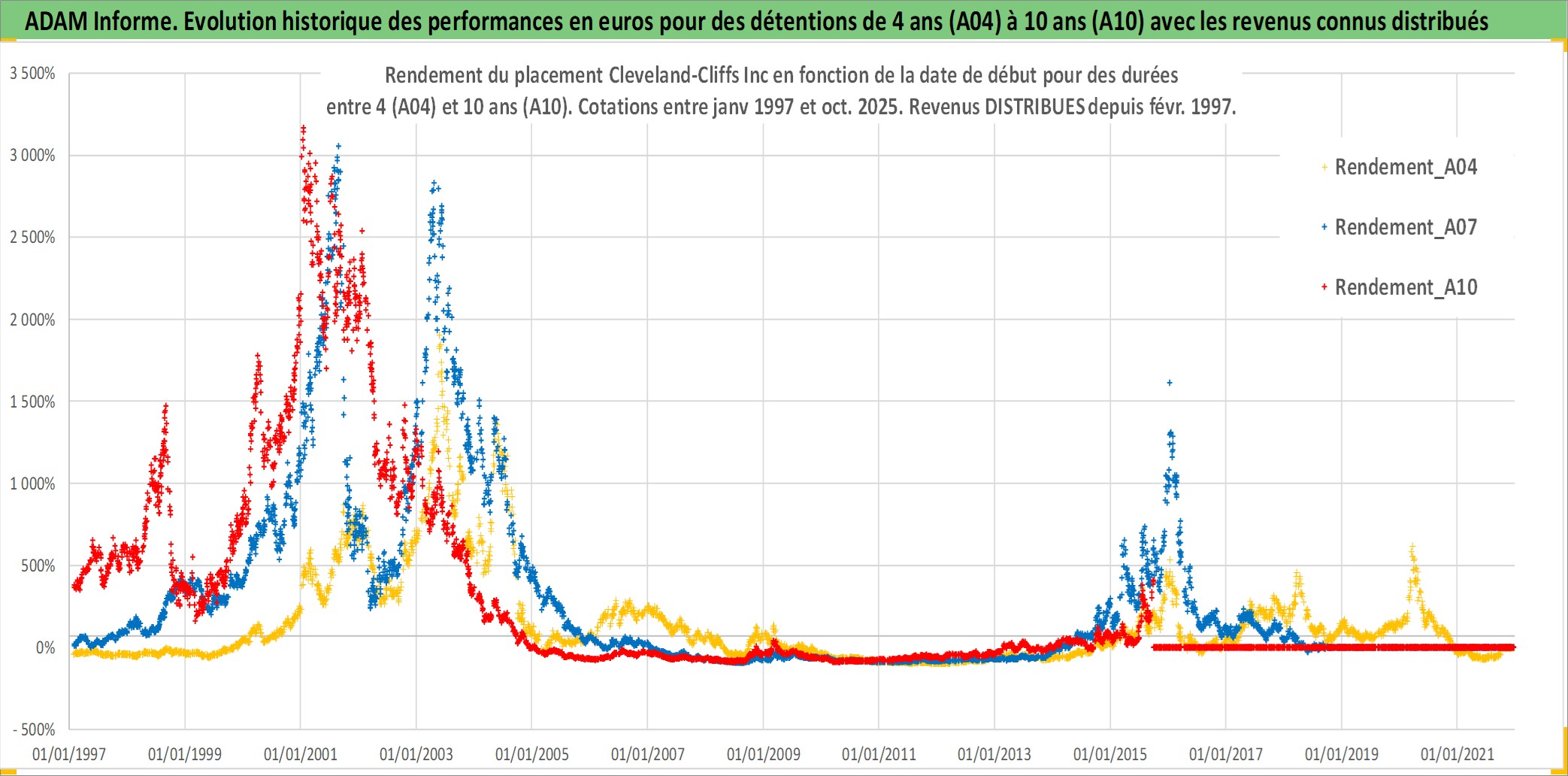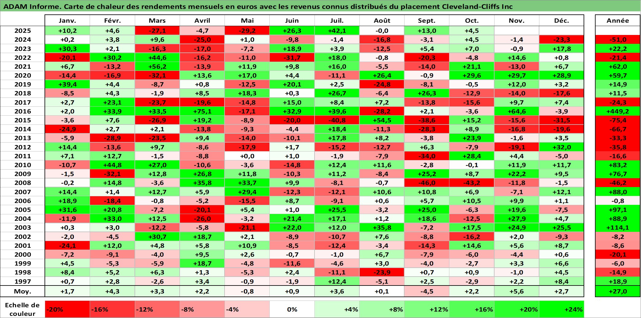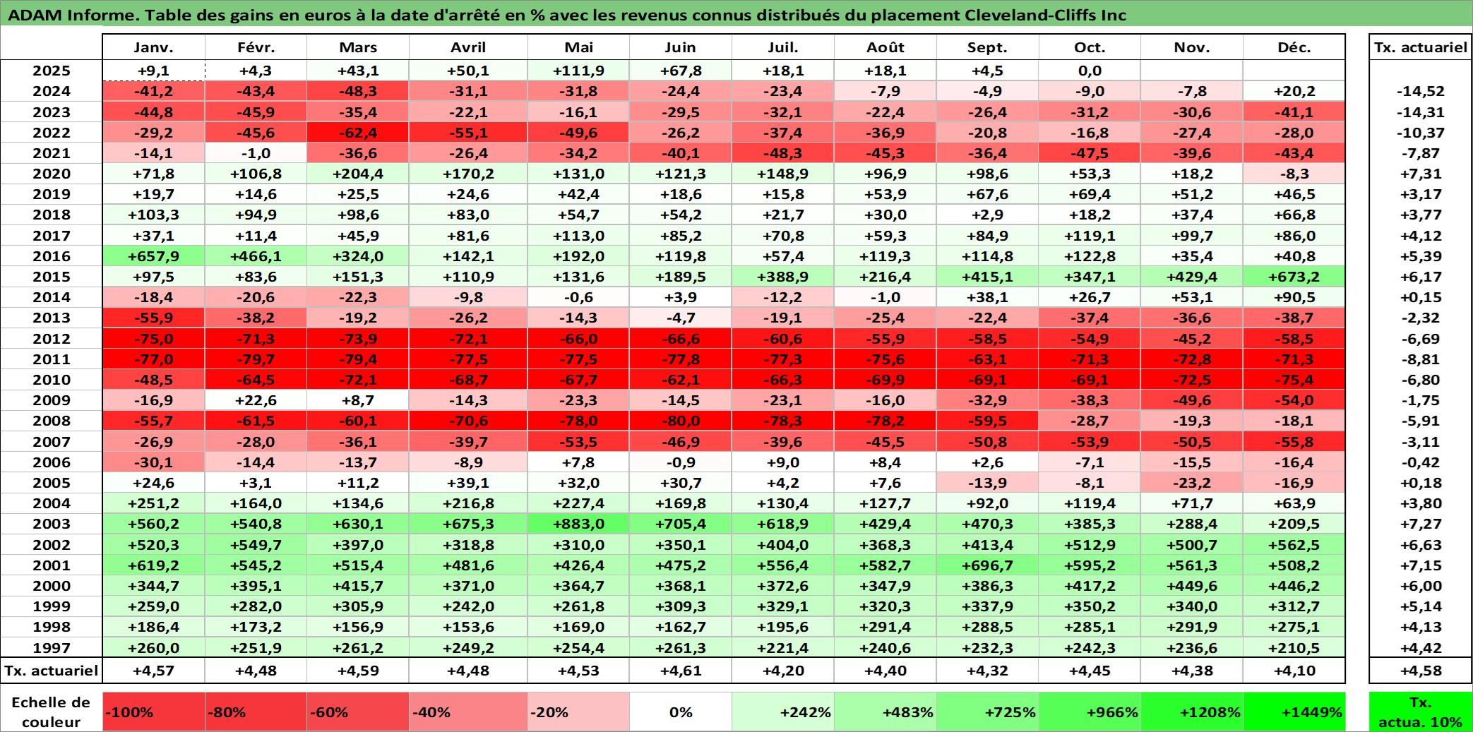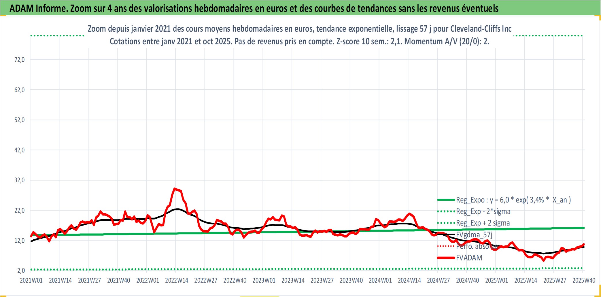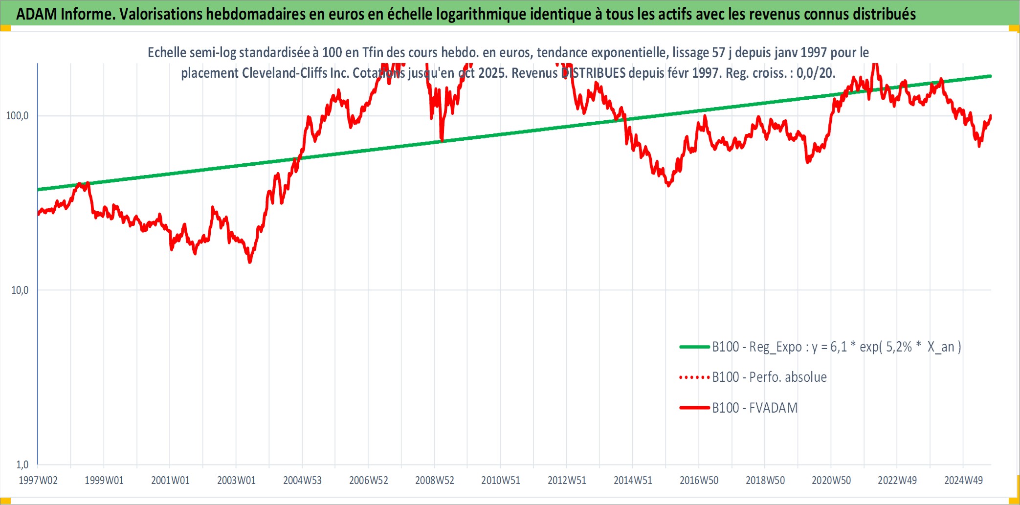 Site dédié aux investisseursPage dédiée sur site financeAnalyse des valorisations hebdomadaires de l'action Cleveland-Cliffs Inc. Cet actif est cote en USD. Les valorisations sont en contrevaleur EURO et couvrent les semaines 1997W01 a 2025W40. Les revenus de cet actif financier sont pris en compte depuis la semaine 1997W08. La note ESG de cet actif n'est pas connue.