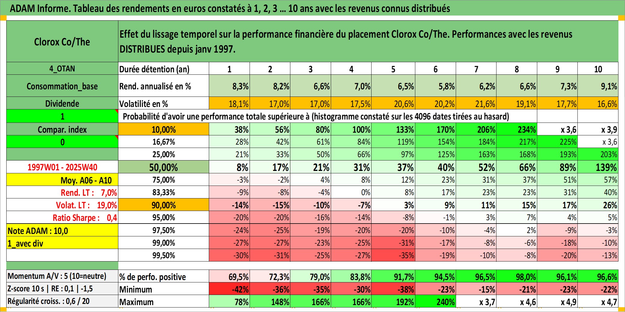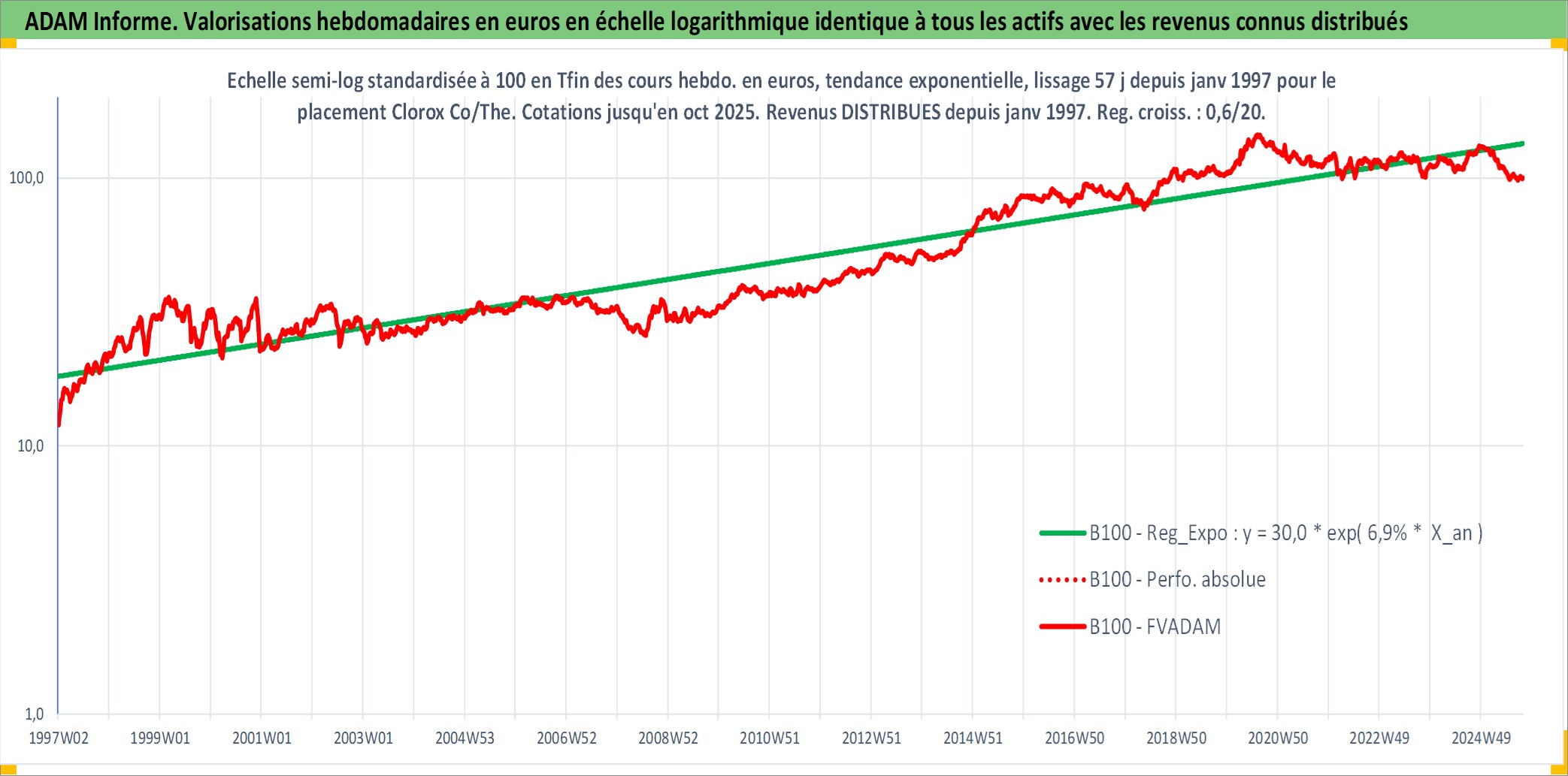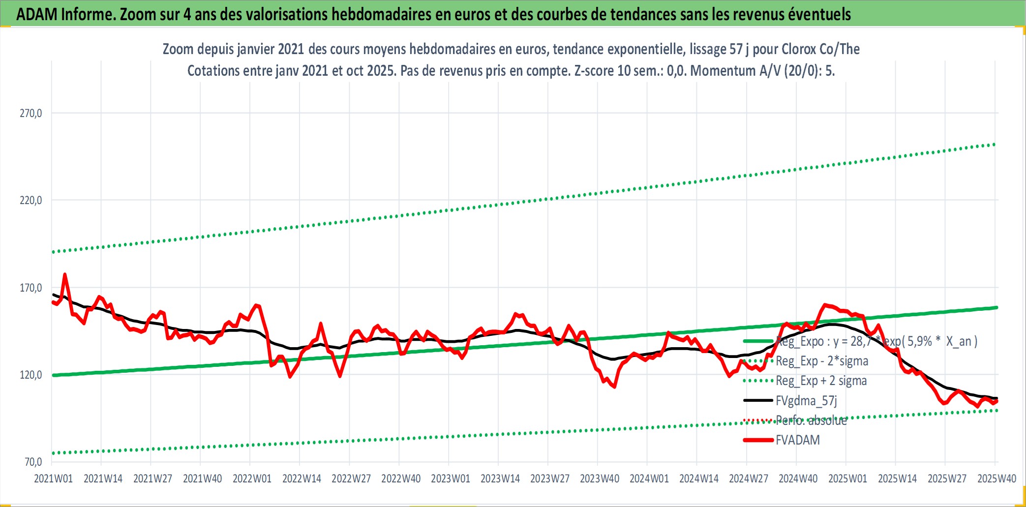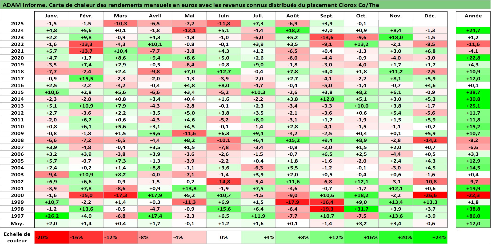 Site dédié aux investisseursPage dédiée sur site financeAnalyse des valorisations hebdomadaires de l'action Clorox Co/The. Cet actif est cote en USD. Les valorisations sont en contrevaleur EURO et couvrent les semaines 1997W01 a 2025W40. Les revenus de cet actif financier sont pris en compte depuis la semaine 1997W05. La note globale ESG de cet actif est estimee a 10.0 (apres rebasage entre 0 et 20).