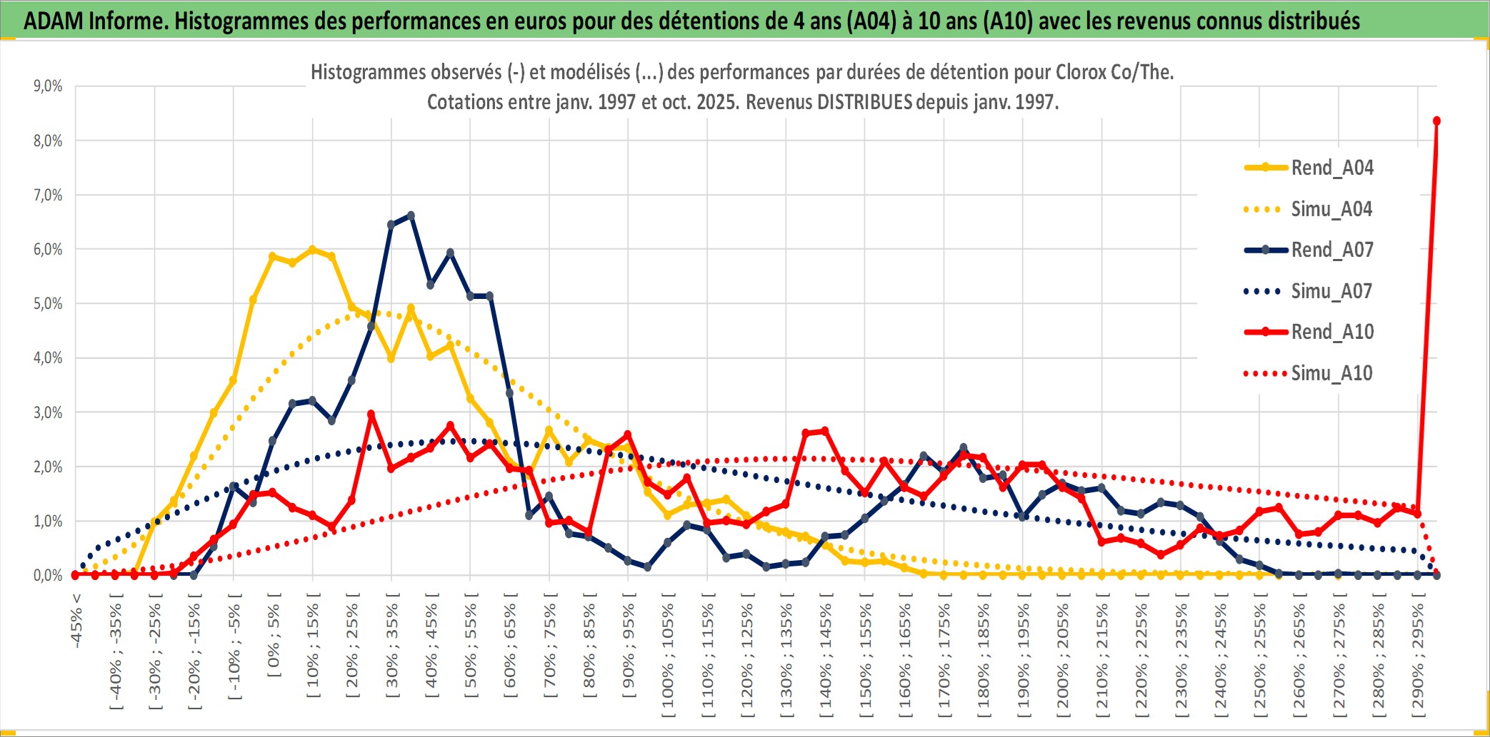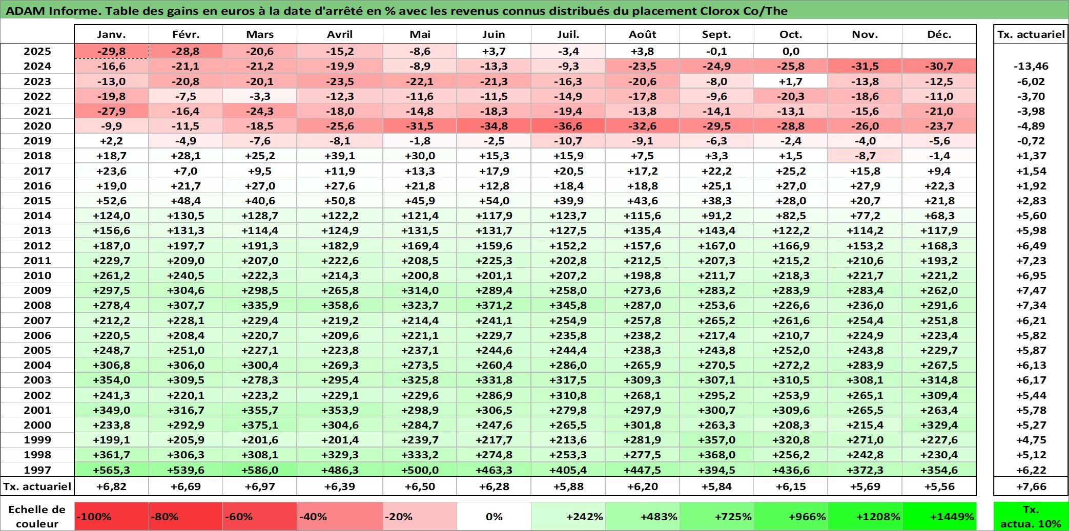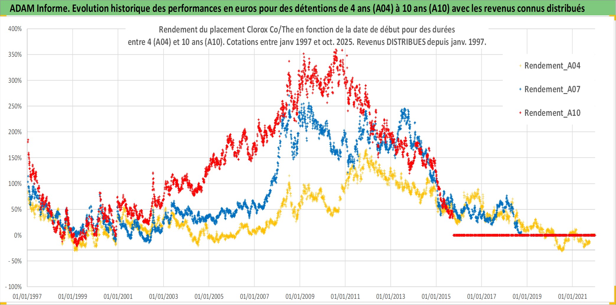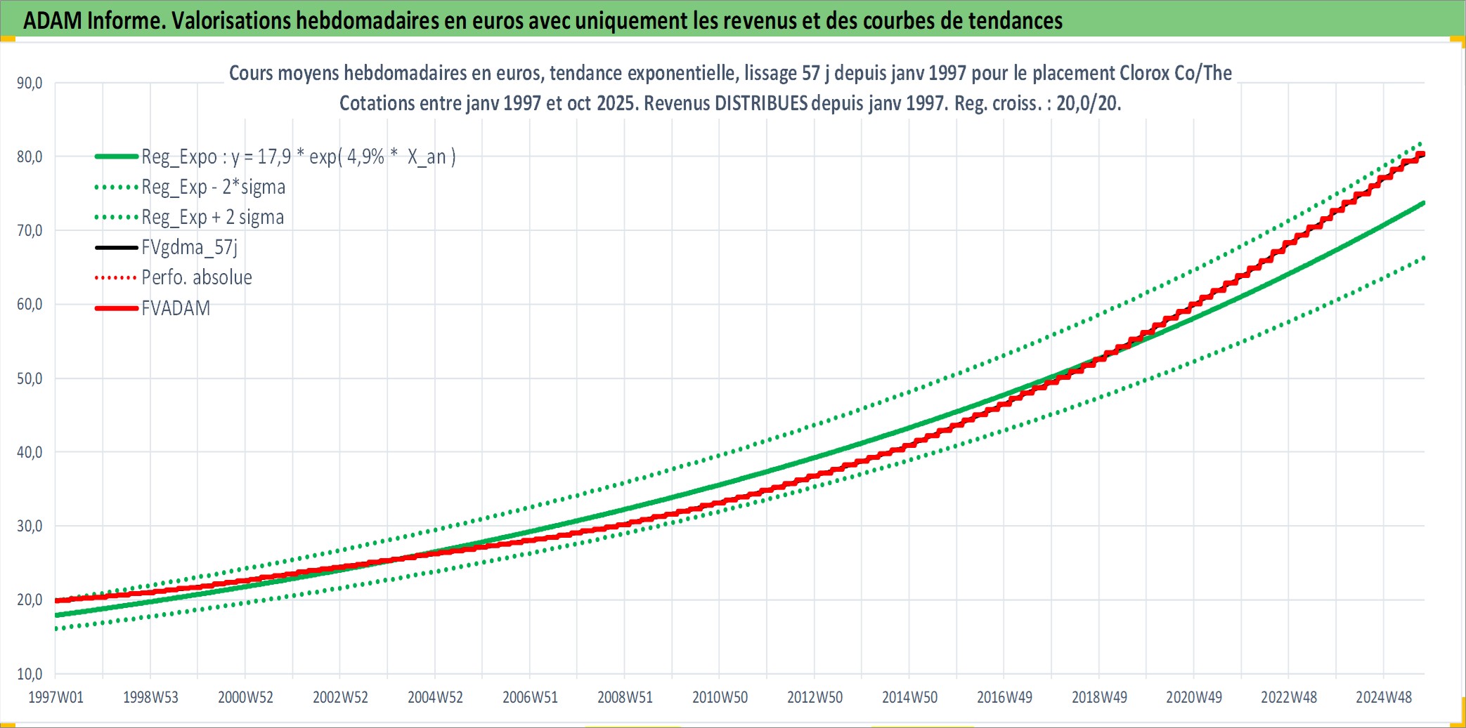 Site dédié aux investisseursPage dédiée sur site financeAnalyse des valorisations hebdomadaires de l'action Clorox Co/The. Cet actif est cote en USD. Les valorisations sont en contrevaleur EURO et couvrent les semaines 1997W01 a 2025W40. Les revenus de cet actif financier sont pris en compte depuis la semaine 1997W05. La note globale ESG de cet actif est estimee a 10.0 (apres rebasage entre 0 et 20).