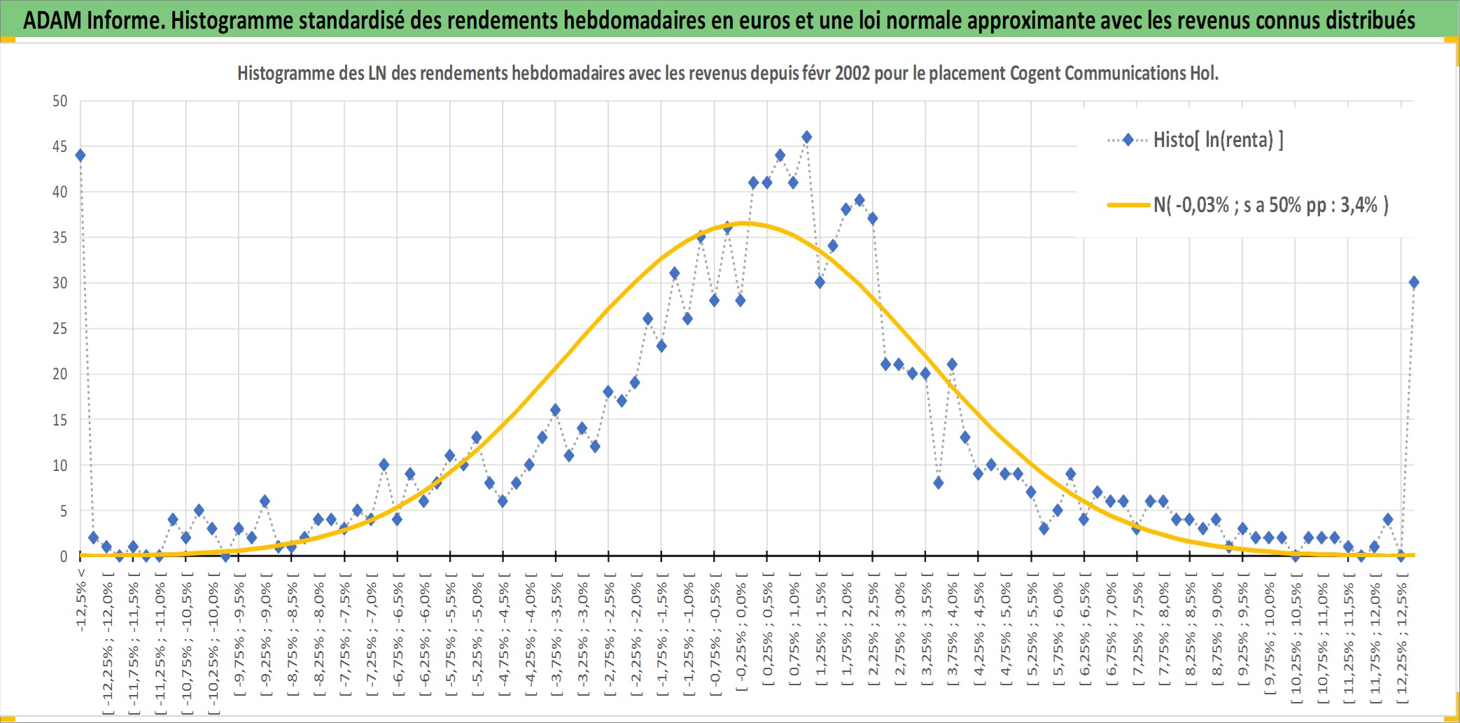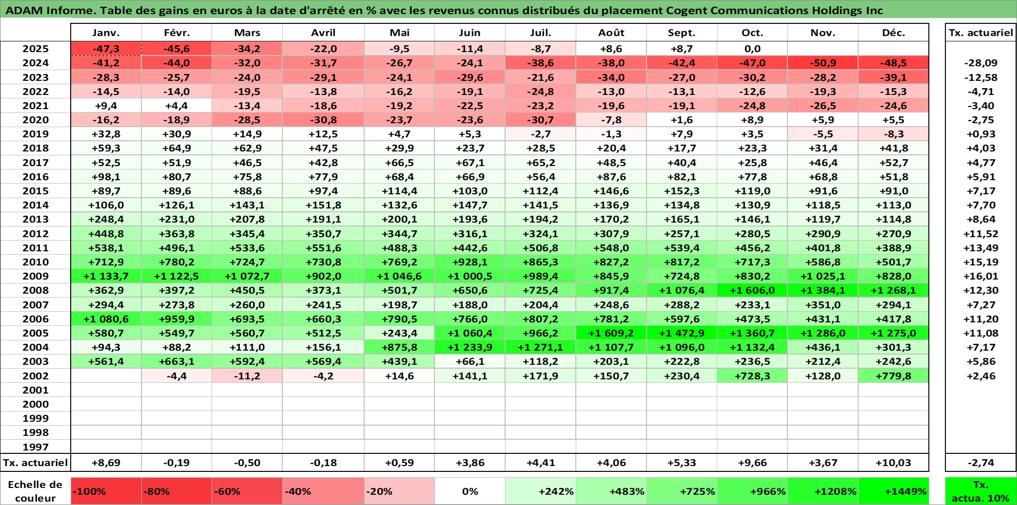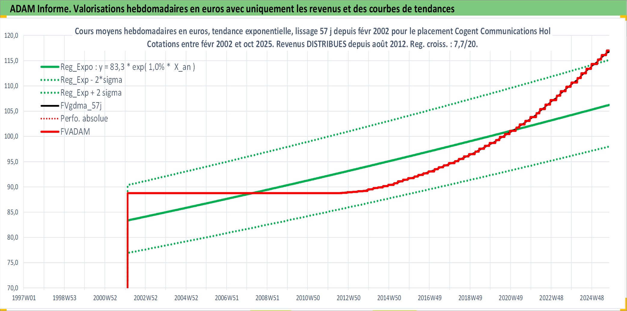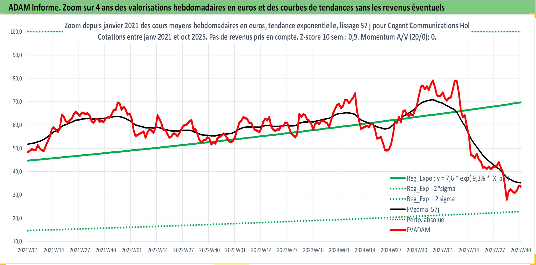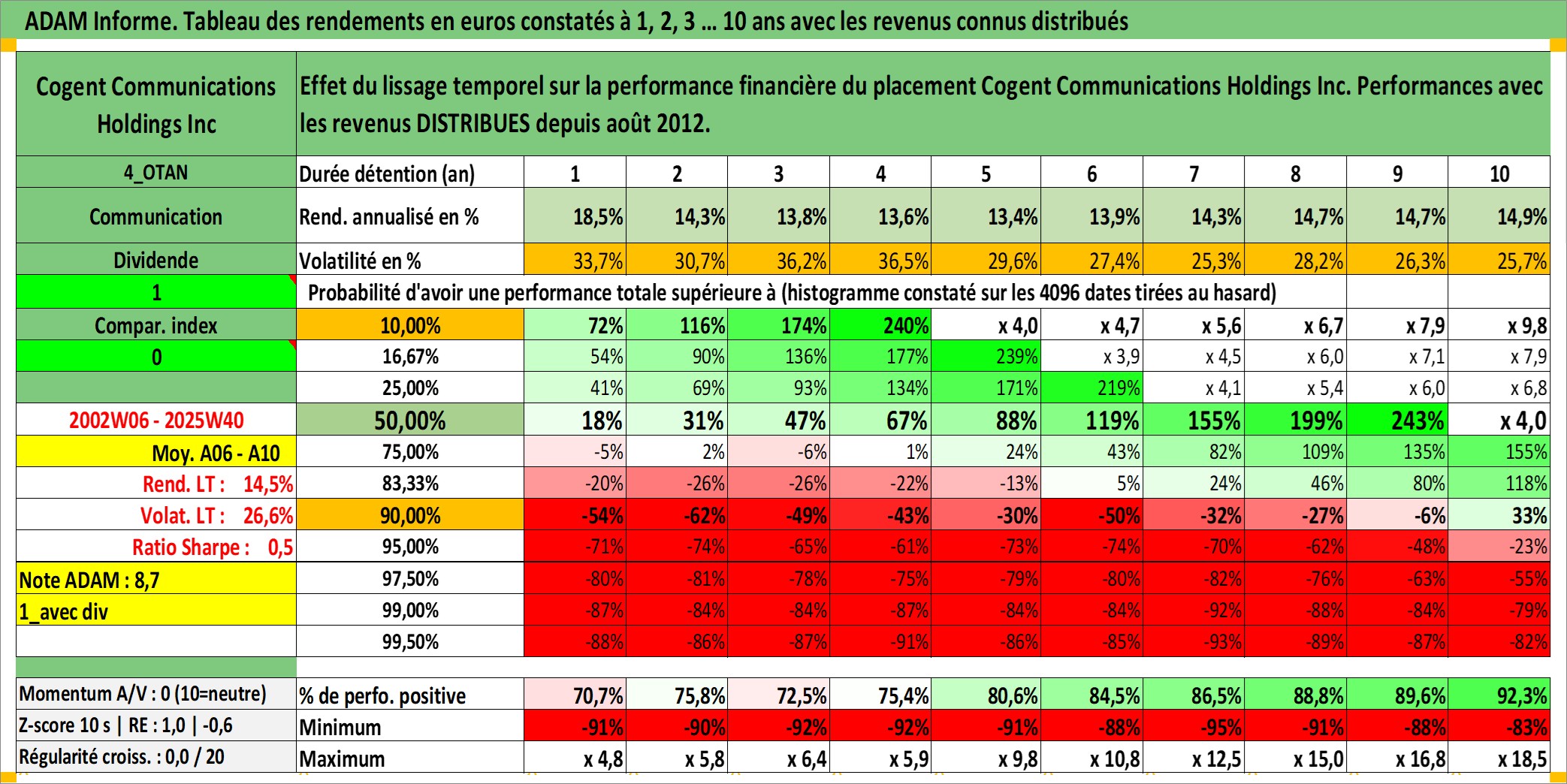 Site dédié aux investisseursPage dédiée sur site financeAnalyse des valorisations hebdomadaires de l'action Cogent Communications Holdings Inc. Cet actif est cote en USD. Les valorisations sont en contrevaleur EURO et couvrent les semaines 2002W06 a 2025W40. Les revenus de cet actif financier sont pris en compte depuis la semaine 2012W34. La note ESG de cet actif n'est pas connue.
