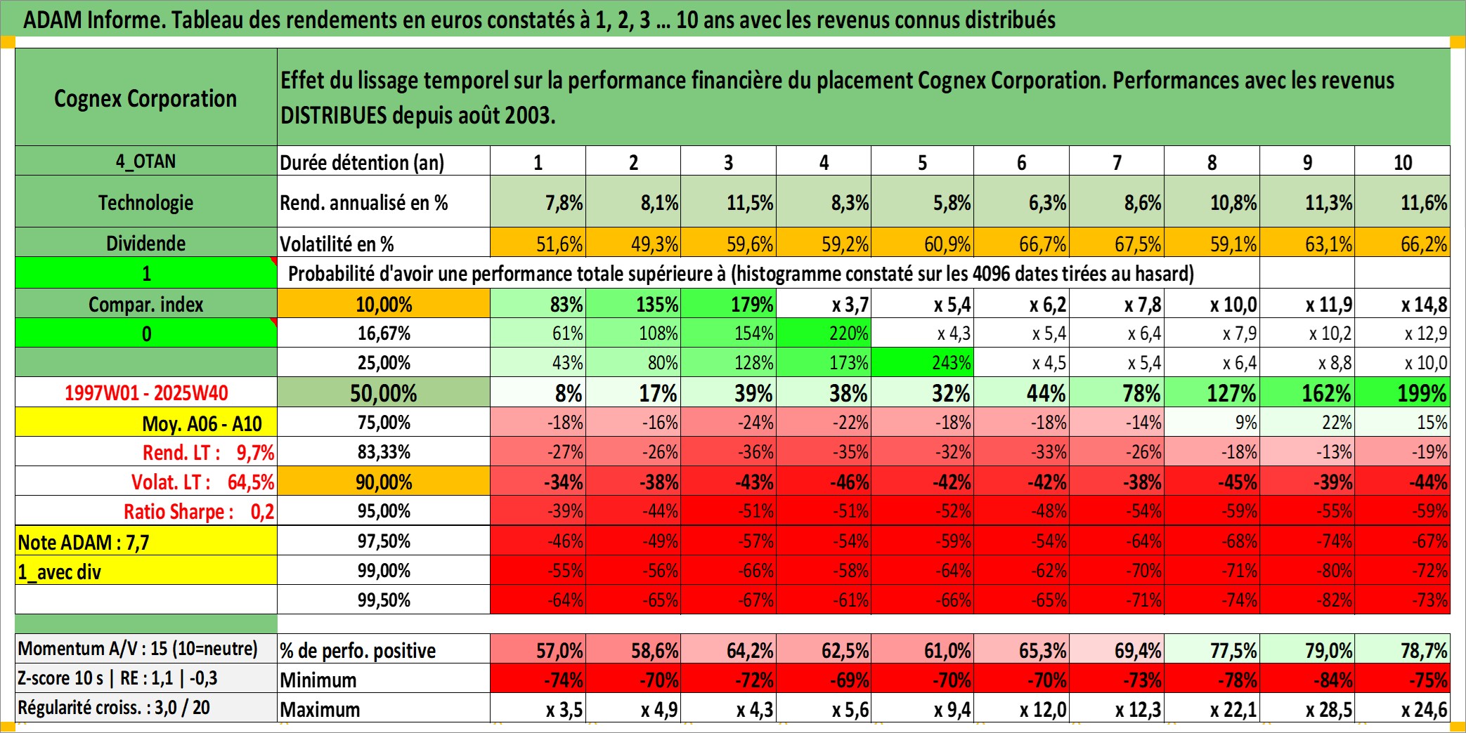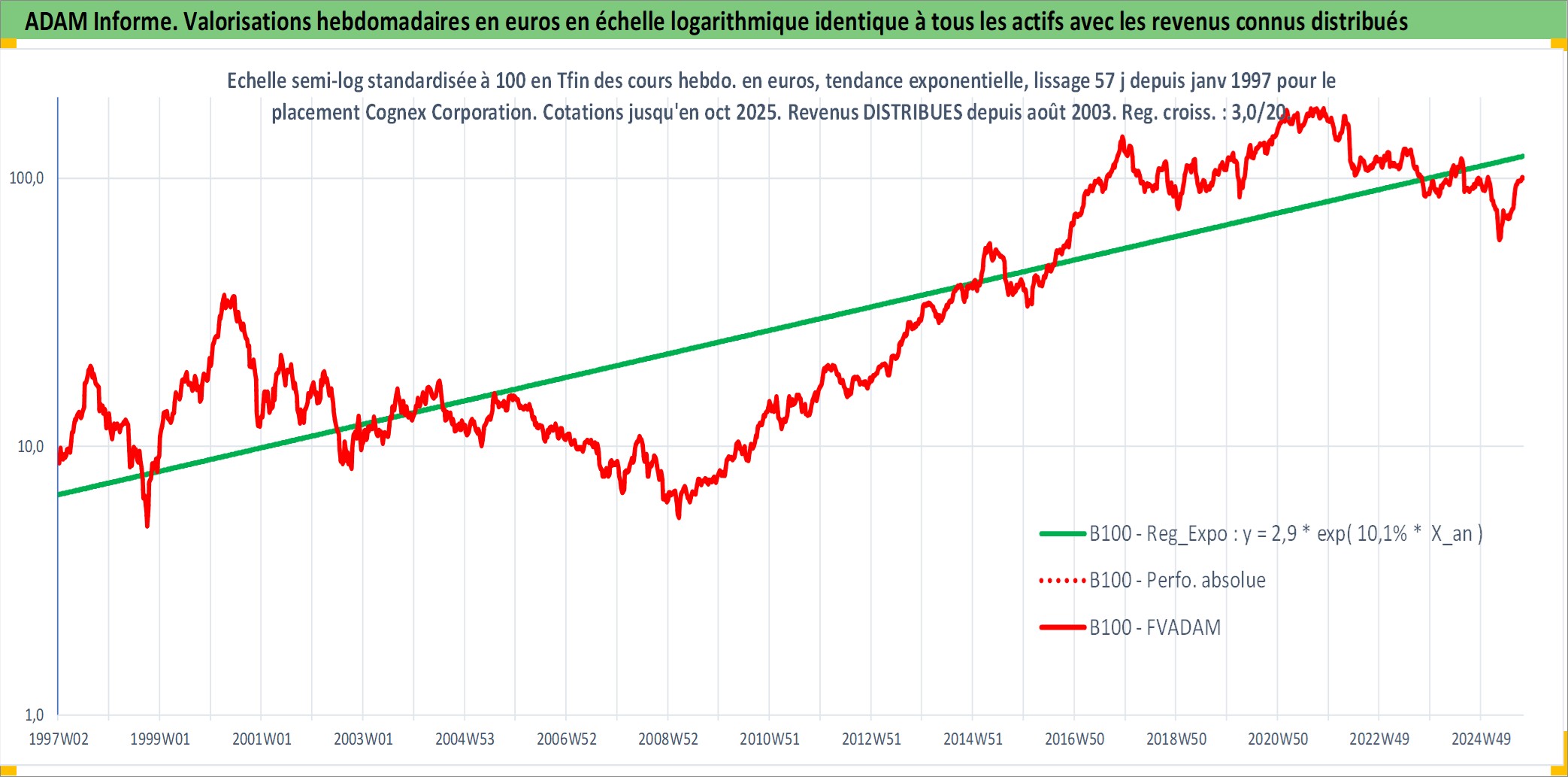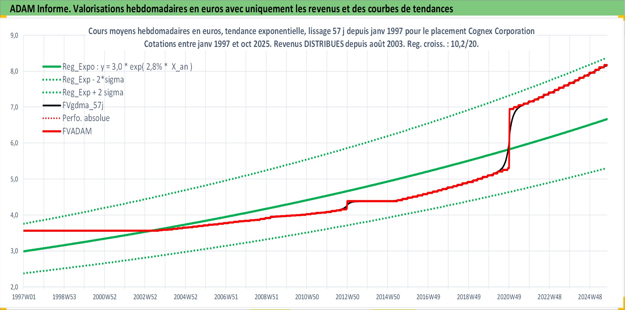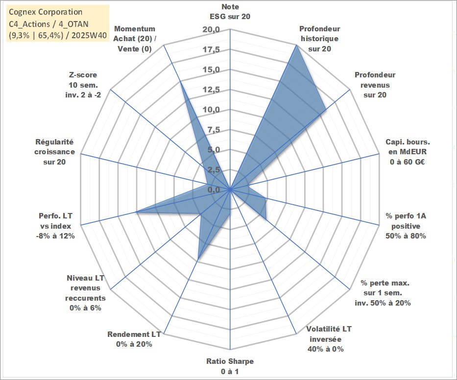 Site dédié aux investisseursPage dédiée sur site financeAnalyse des valorisations hebdomadaires de l'action Cognex Corporation. Cet actif est cote en USD. Les valorisations sont en contrevaleur EURO et couvrent les semaines 1997W01 a 2025W40. Les revenus de cet actif financier sont pris en compte depuis la semaine 2003W35. La note ESG de cet actif n'est pas connue.