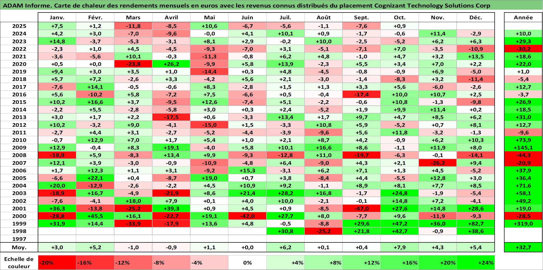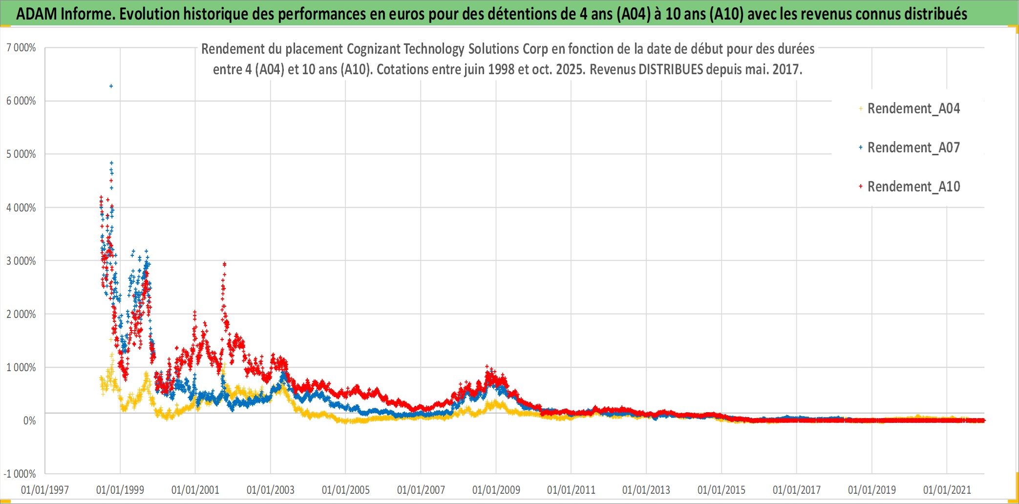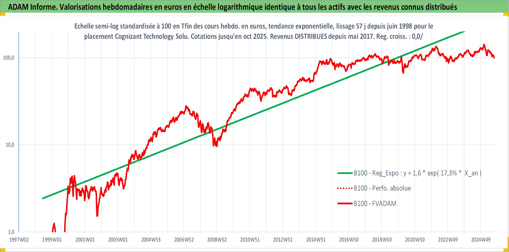 Site dédié aux investisseursPage dédiée sur site financeAnalyse des valorisations hebdomadaires de l'action Cognizant Technology Solutions Corp. Cet actif est cote en USD. Les valorisations sont en contrevaleur EURO et couvrent les semaines 1998W25 a 2025W40. Les revenus de cet actif financier sont pris en compte depuis la semaine 2017W20. La note globale ESG de cet actif est estimee a 14.0 (apres rebasage entre 0 et 20).