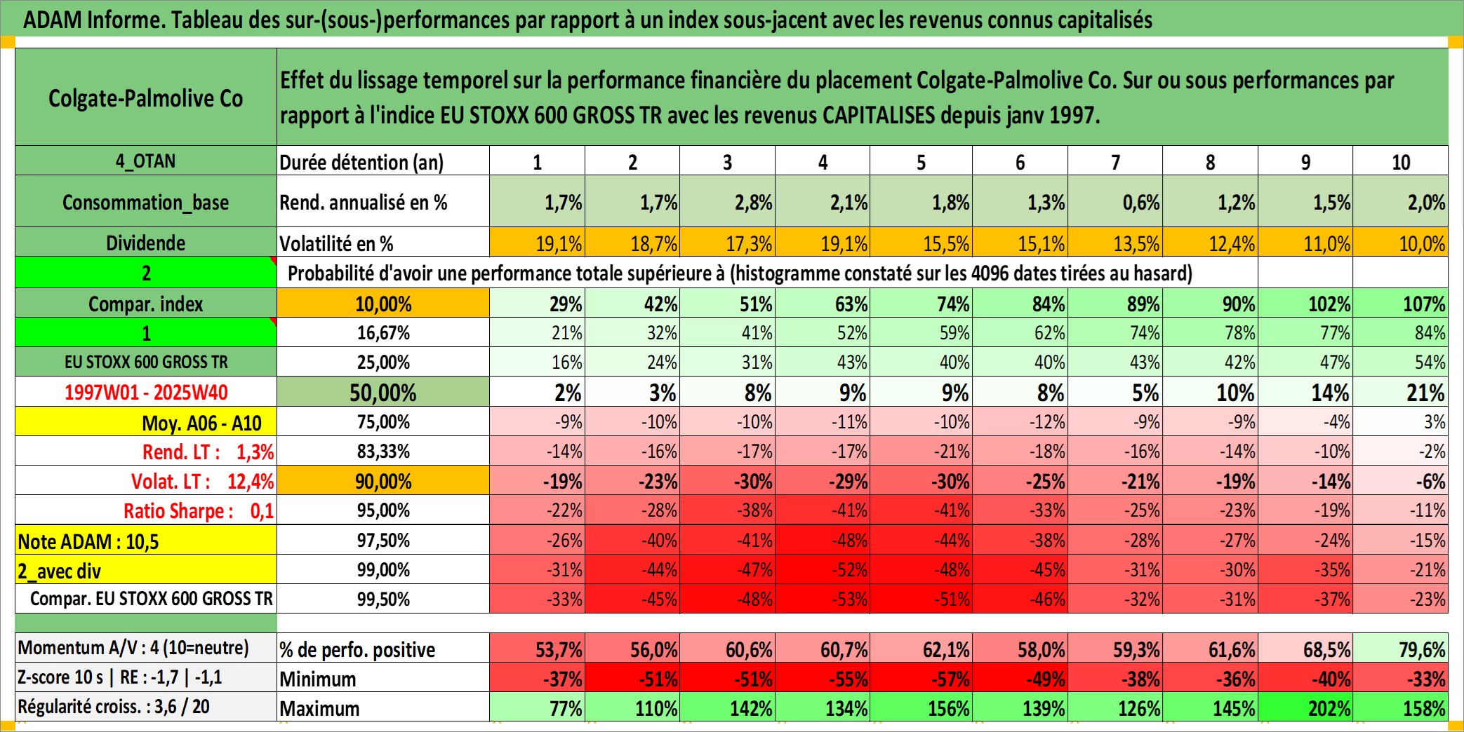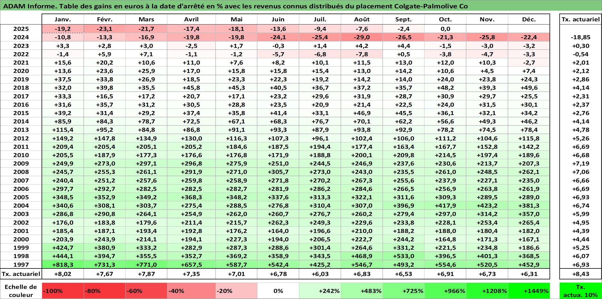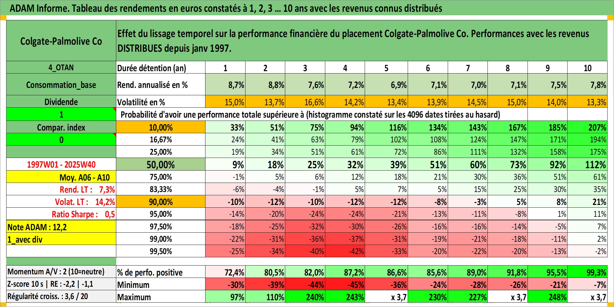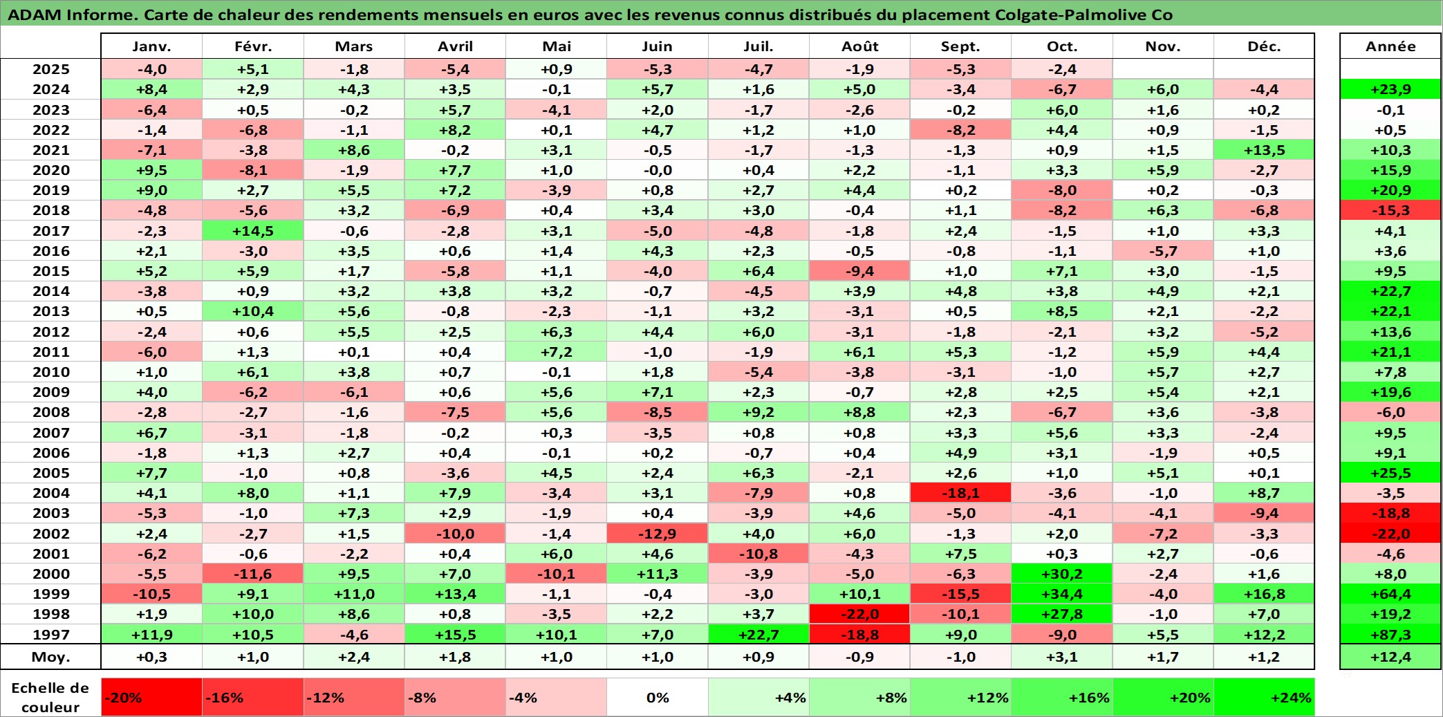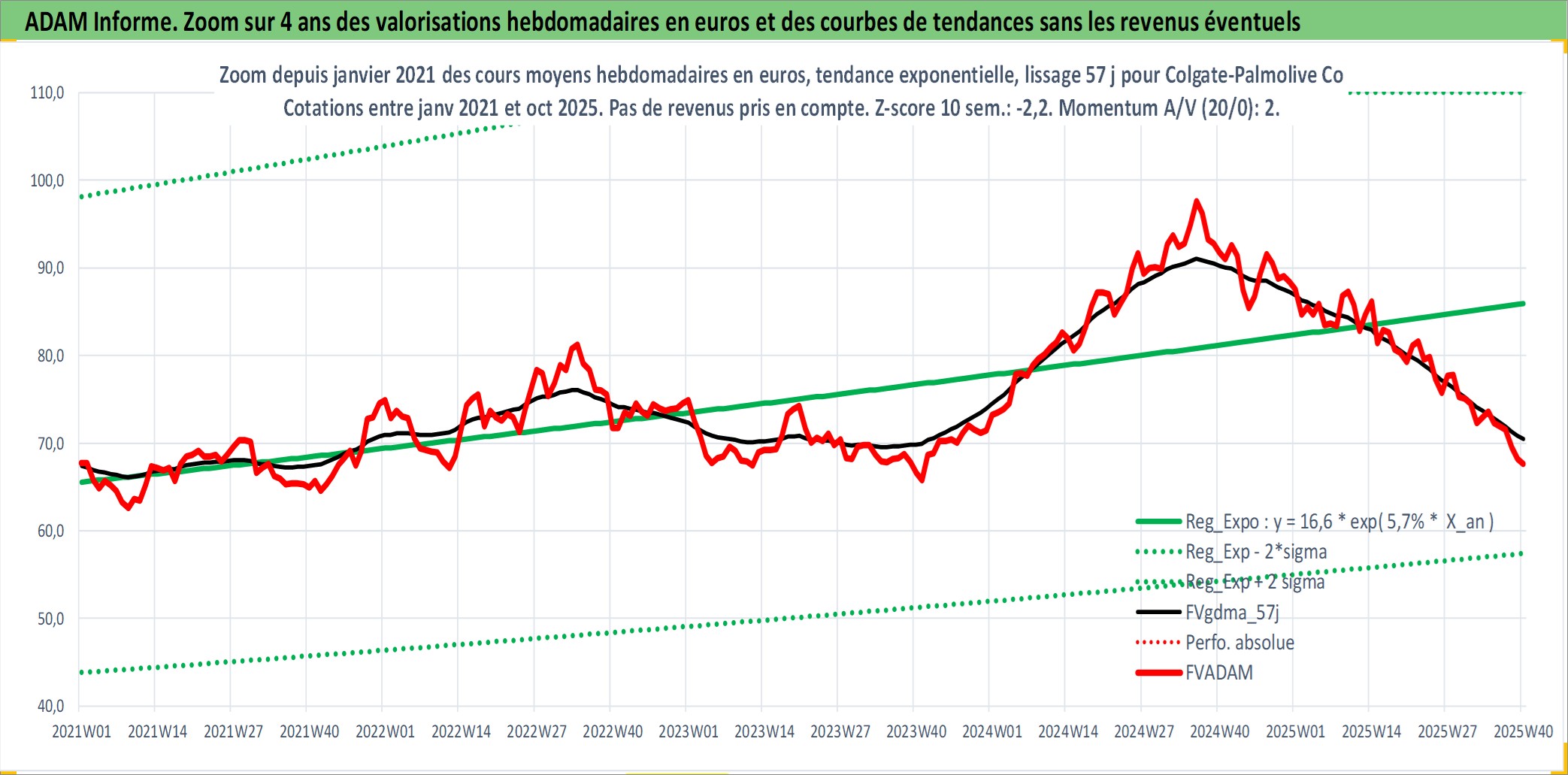 Site dédié aux investisseursPage dédiée sur site financeAnalyse des valorisations hebdomadaires de l'action Colgate-Palmolive Co. Cet actif est cote en USD. Les valorisations sont en contrevaleur EURO et couvrent les semaines 1997W01 a 2025W40. Les revenus de cet actif financier sont pris en compte depuis la semaine 1997W04. La note globale ESG de cet actif est estimee a 9.0 (apres rebasage entre 0 et 20).