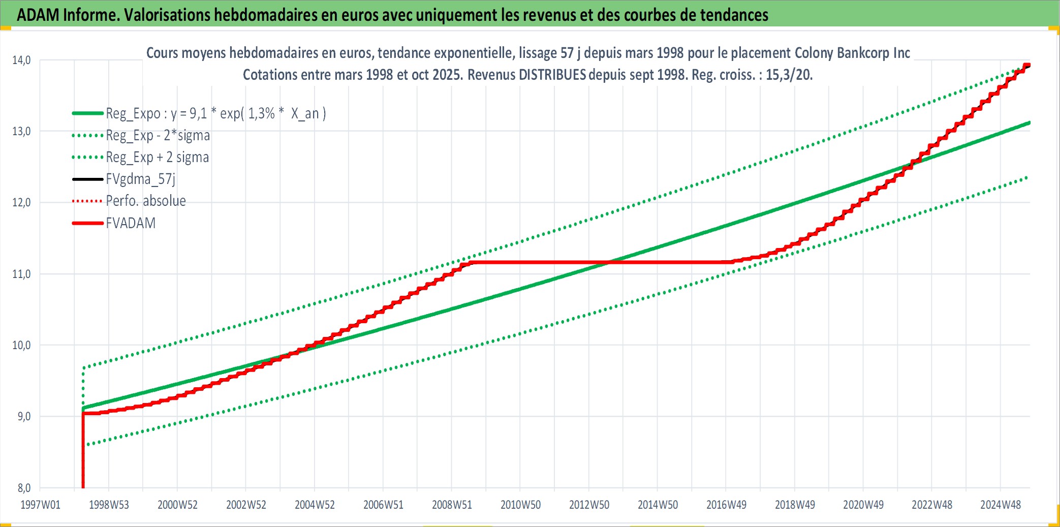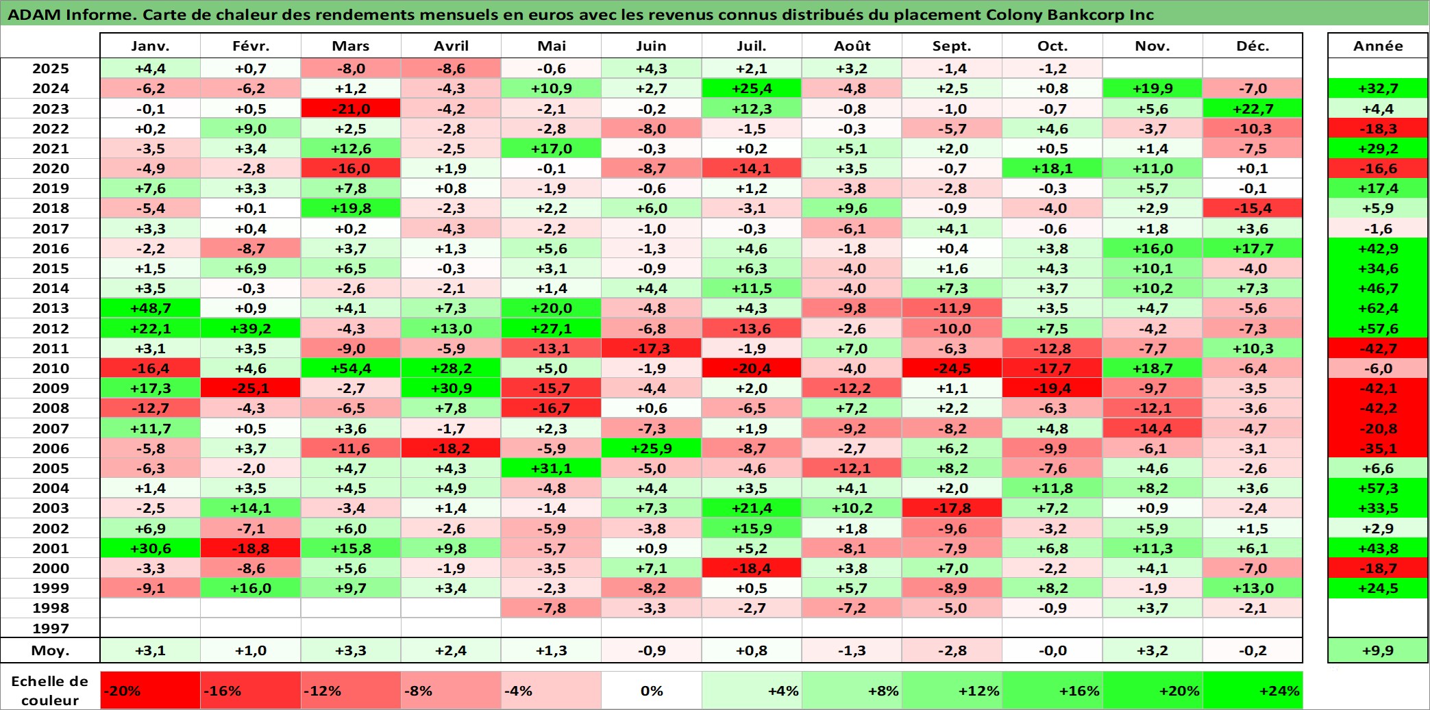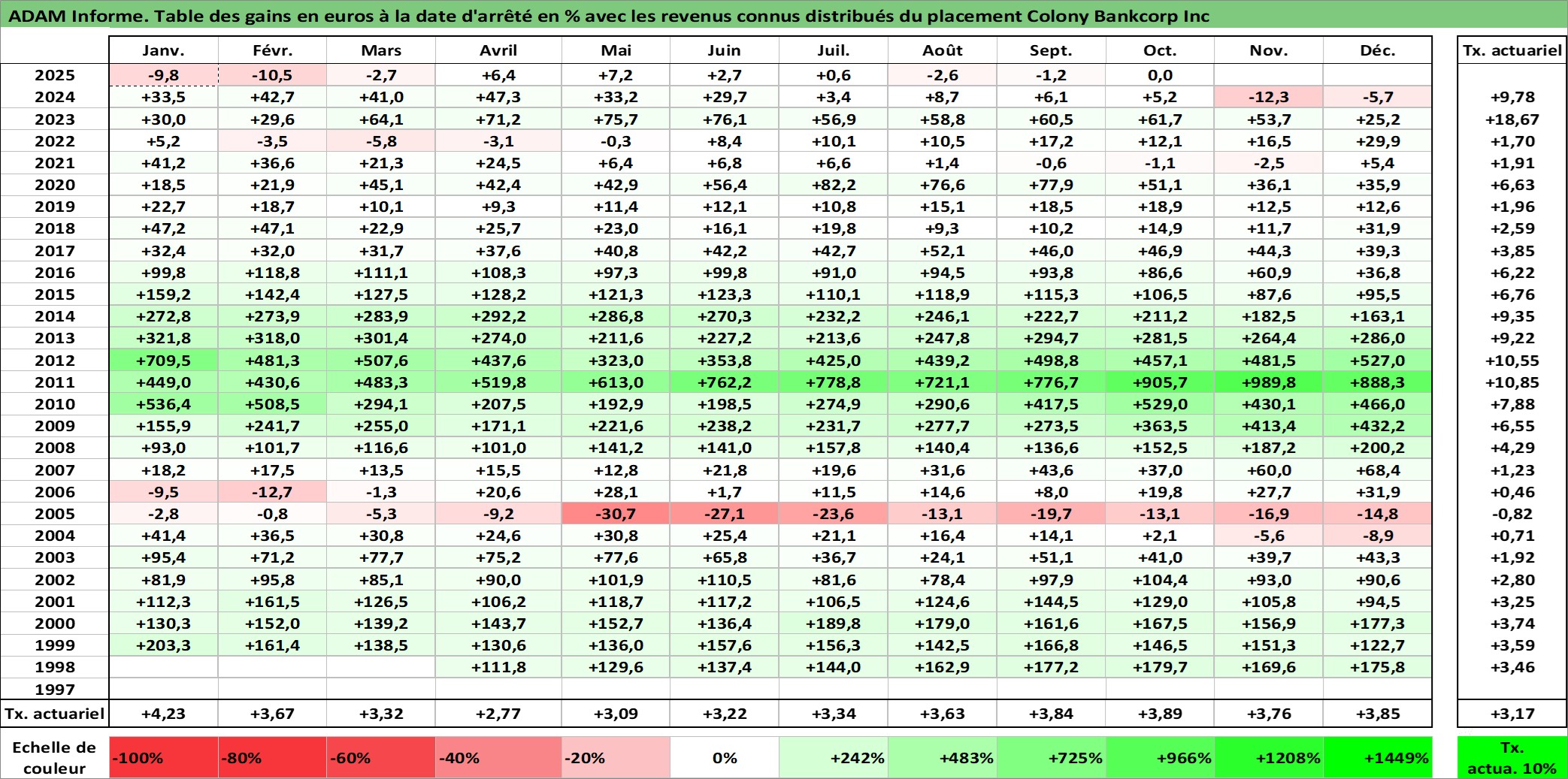 Site dédié aux investisseursPage dédiée sur site financeAnalyse des valorisations hebdomadaires de l'action Colony Bankcorp Inc. Cet actif est cote en USD. Les valorisations sont en contrevaleur EURO et couvrent les semaines 1998W14 a 2025W40. Les revenus de cet actif financier sont pris en compte depuis la semaine 1998W40. La note ESG de cet actif n'est pas connue.