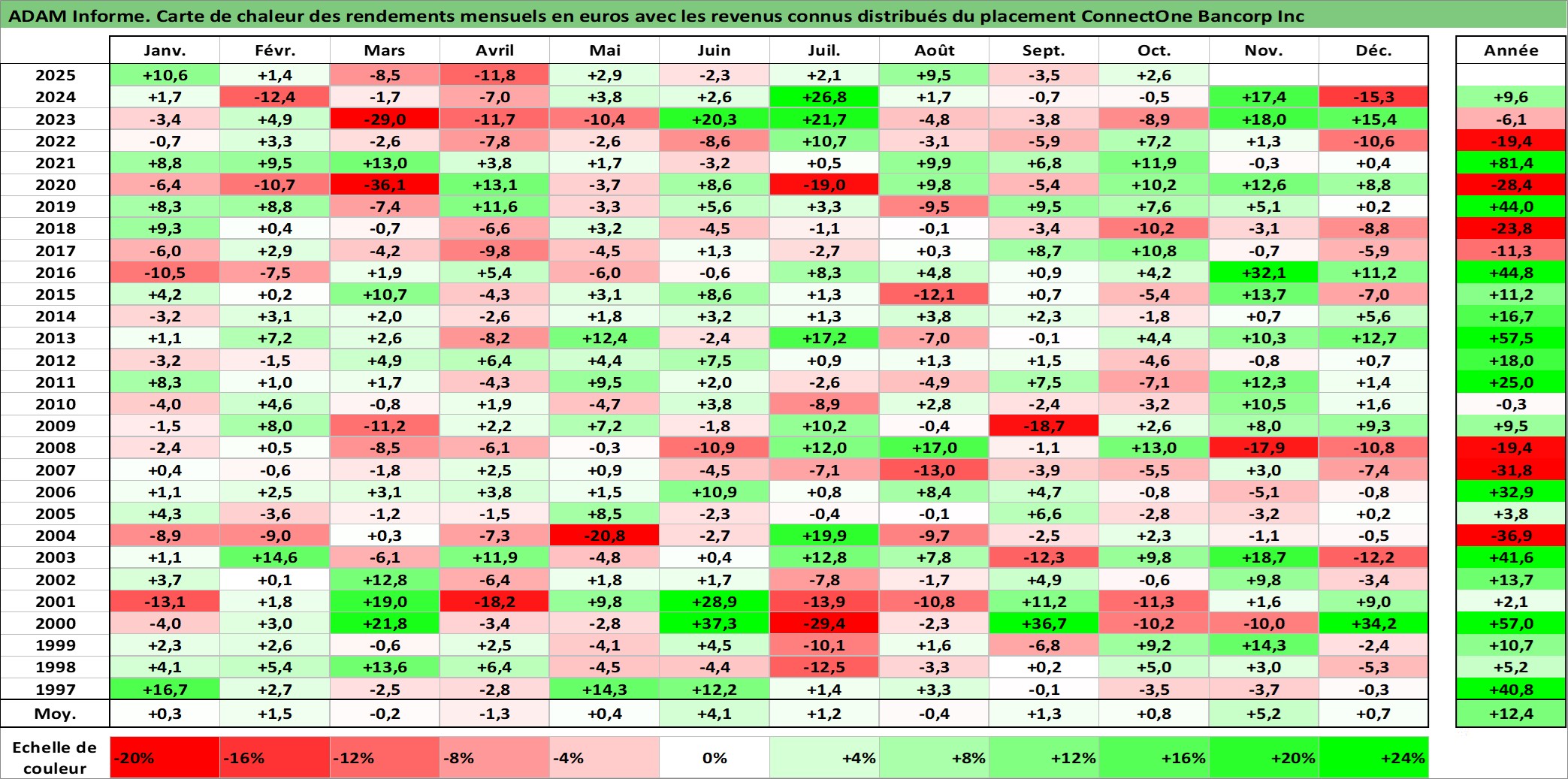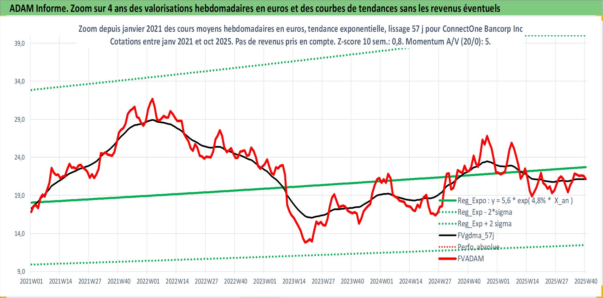 Site dédié aux investisseursPage dédiée sur site financeAnalyse des valorisations hebdomadaires de l'action ConnectOne Bancorp Inc. Cet actif est cote en USD. Les valorisations sont en contrevaleur EURO et couvrent les semaines 1997W01 a 2025W40. Les revenus de cet actif financier sont pris en compte depuis la semaine 1997W03. La note ESG de cet actif n'est pas connue.