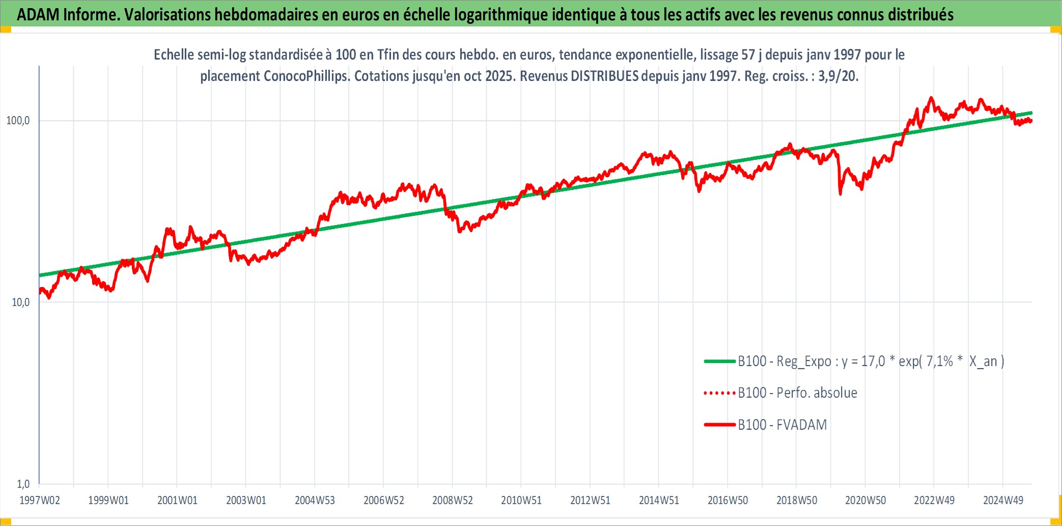 Site dédié aux investisseursPage dédiée sur site financeAnalyse des valorisations hebdomadaires de l'action ConocoPhillips. Cet actif est cote en USD. Les valorisations sont en contrevaleur EURO et couvrent les semaines 1997W01 a 2025W40. Les revenus de cet actif financier sont pris en compte depuis la semaine 1997W05. La note globale ESG de cet actif est estimee a 3.0 (apres rebasage entre 0 et 20).