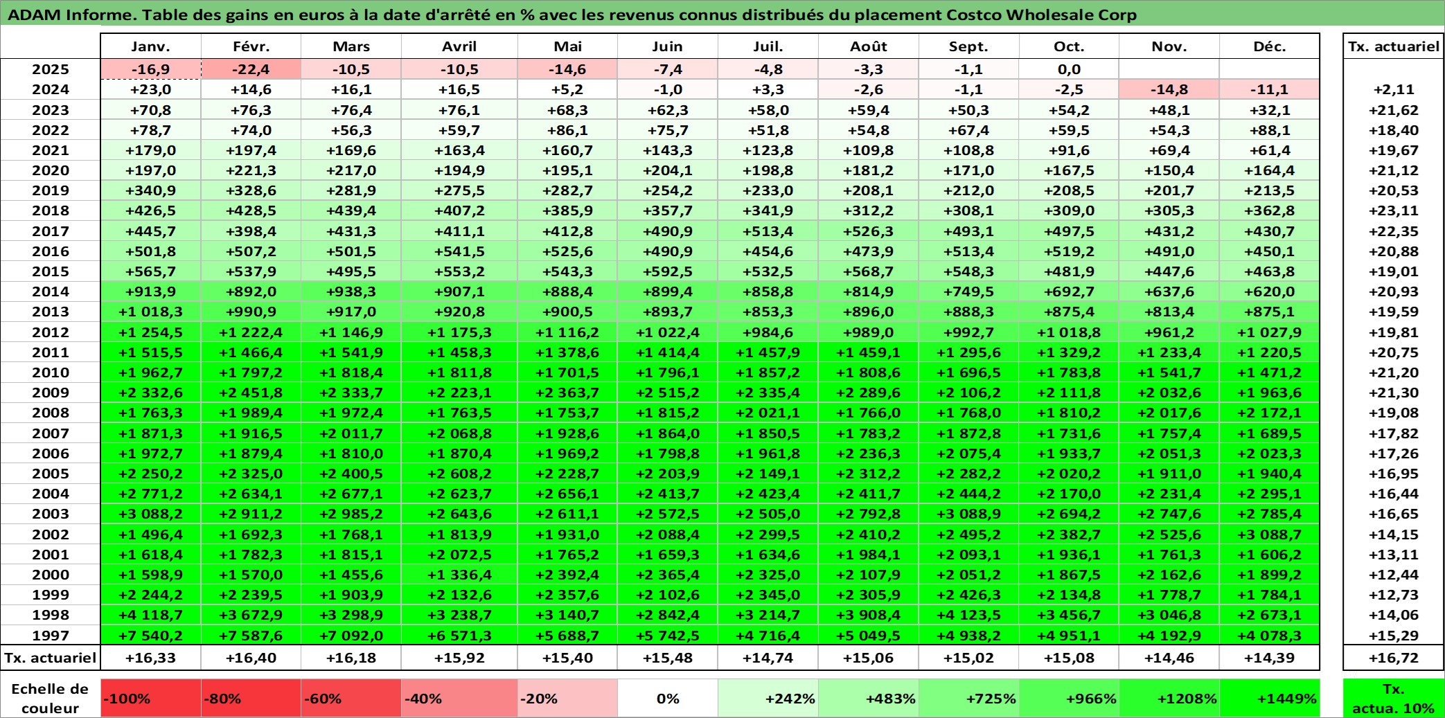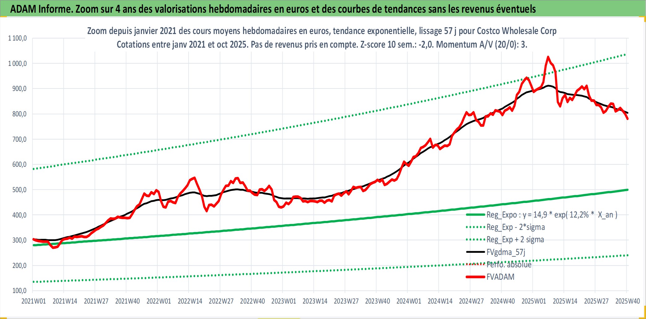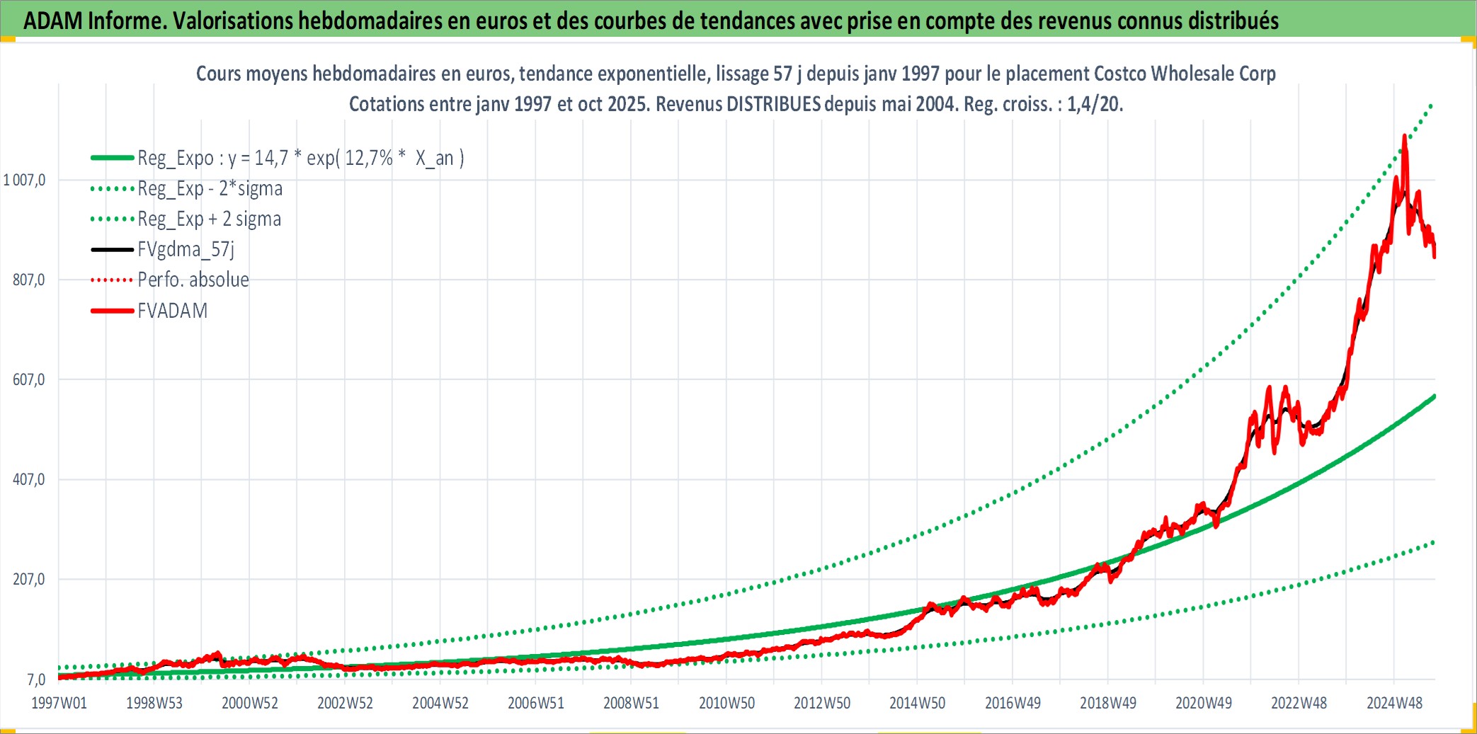 Site dédié aux investisseursPage dédiée sur site financeAnalyse des valorisations hebdomadaires de l'action Costco Wholesale Corp. Cet actif est cote en USD. Les valorisations sont en contrevaleur EURO et couvrent les semaines 1997W01 a 2025W40. Les revenus de cet actif financier sont pris en compte depuis la semaine 2004W19. La note globale ESG de cet actif est estimee a 8.0 (apres rebasage entre 0 et 20).