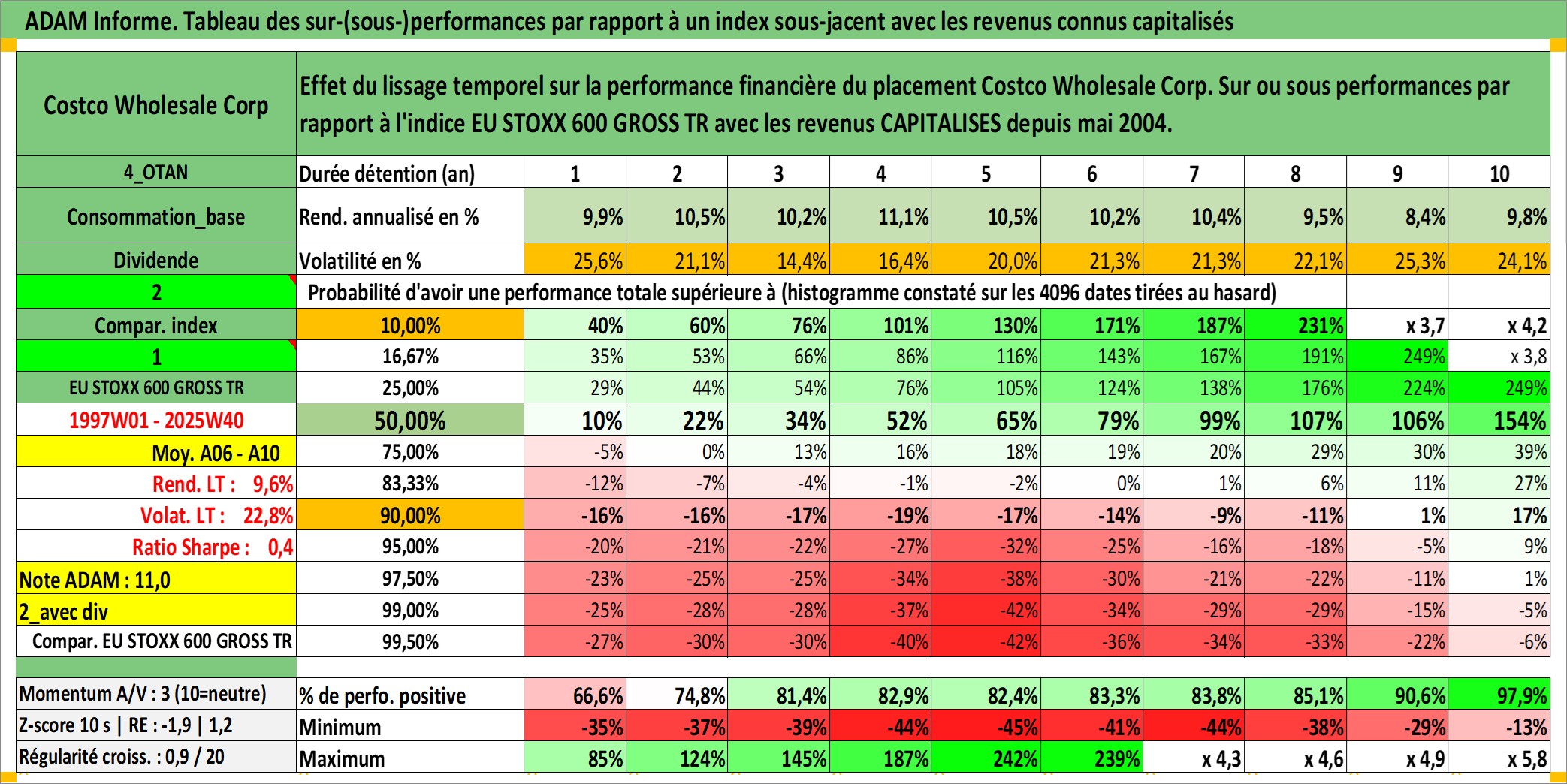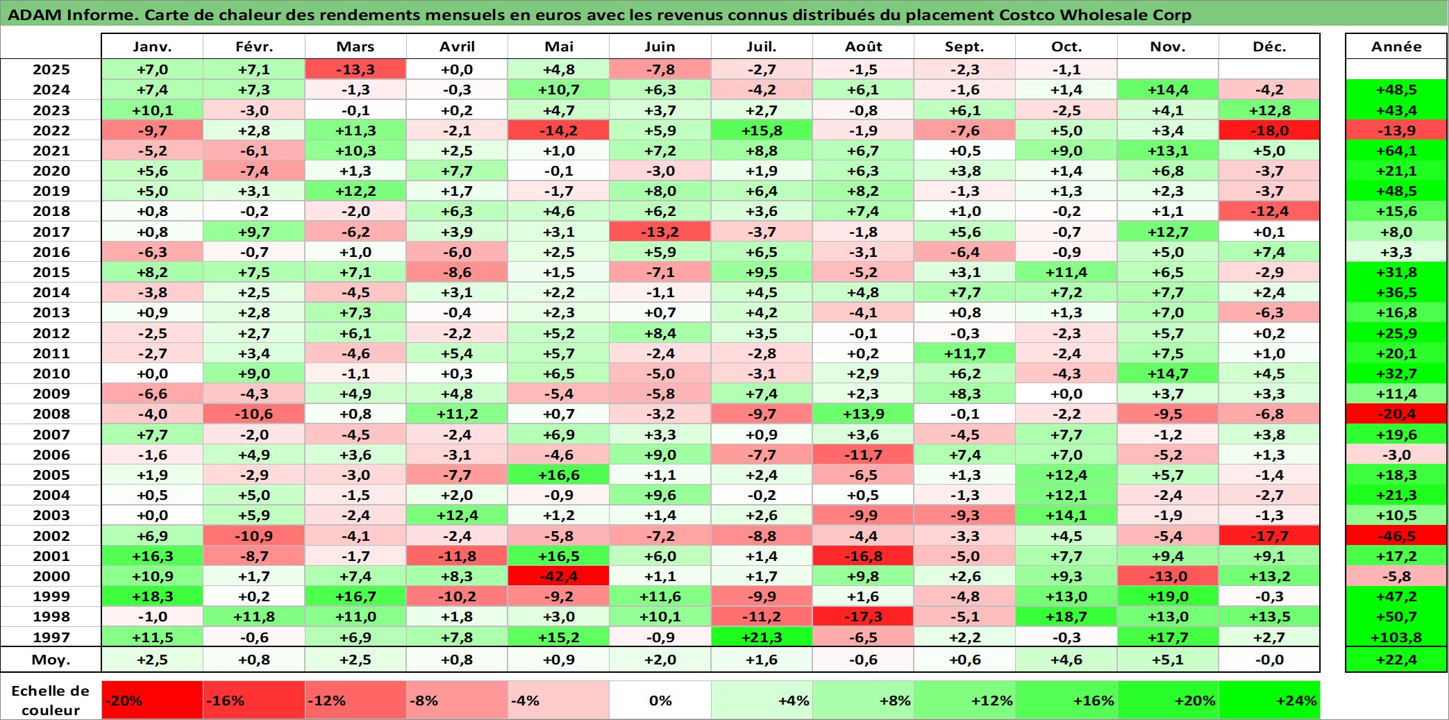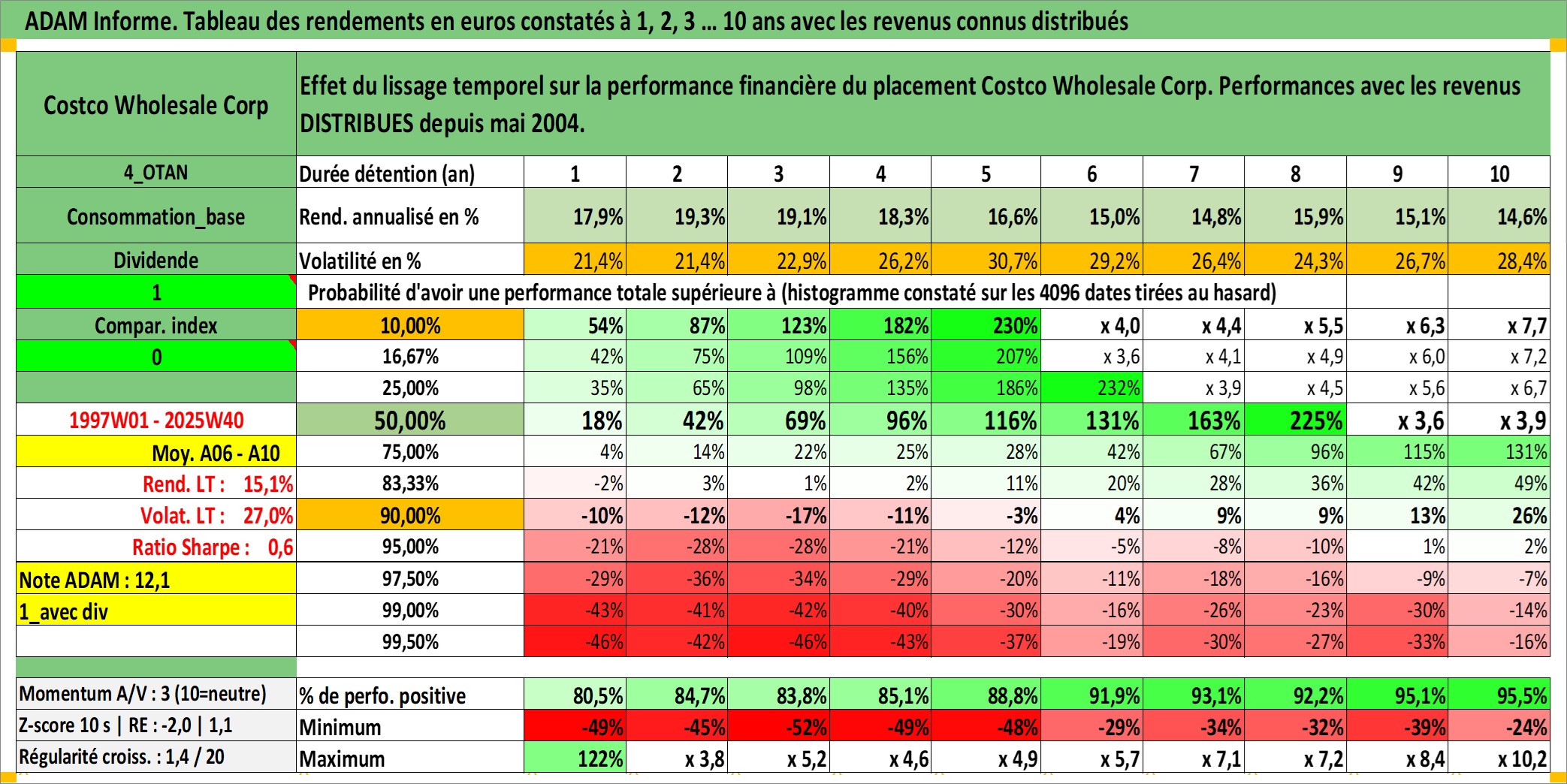 Site dédié aux investisseursPage dédiée sur site financeAnalyse des valorisations hebdomadaires de l'action Costco Wholesale Corp. Cet actif est cote en USD. Les valorisations sont en contrevaleur EURO et couvrent les semaines 1997W01 a 2025W40. Les revenus de cet actif financier sont pris en compte depuis la semaine 2004W19. La note globale ESG de cet actif est estimee a 8.0 (apres rebasage entre 0 et 20).
