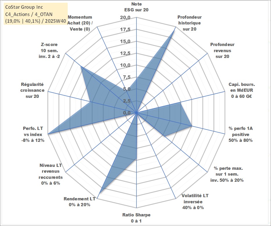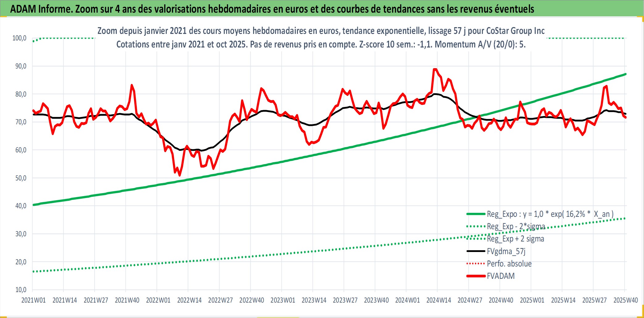 Site dédié aux investisseursPage dédiée sur site financeAnalyse des valorisations hebdomadaires de l'action CoStar Group Inc. Cet actif est cote en USD. Les valorisations sont en contrevaleur EURO et couvrent les semaines 1998W27 a 2025W40. Les revenus de cet actif financier ne sont pas connus car non existants ou non disponibles sur le site Yahoo Finance. La note globale ESG de cet actif est estimee a 7.0 (apres rebasage entre 0 et 20).