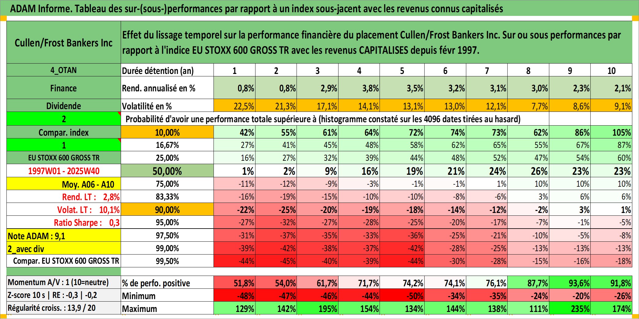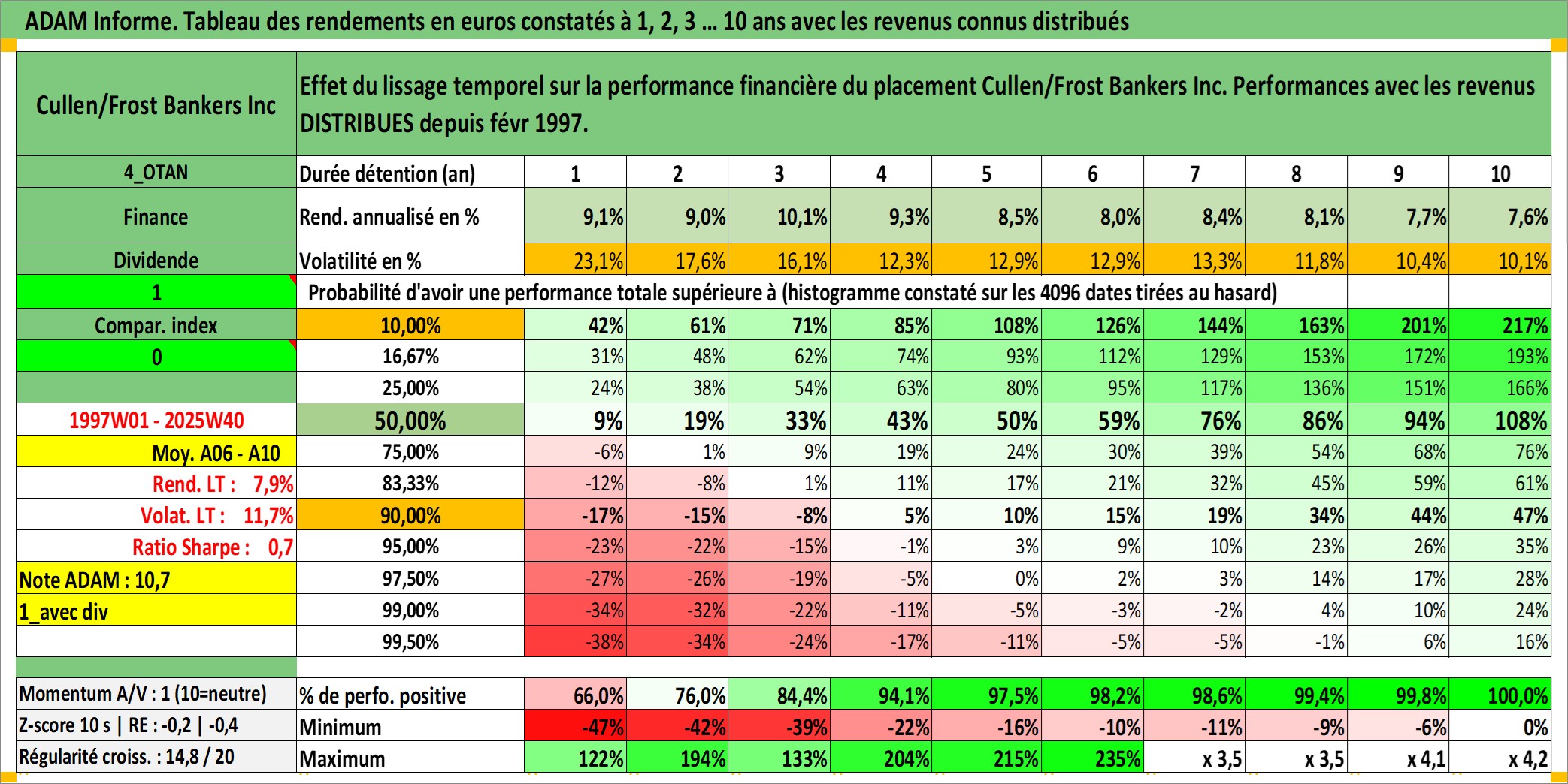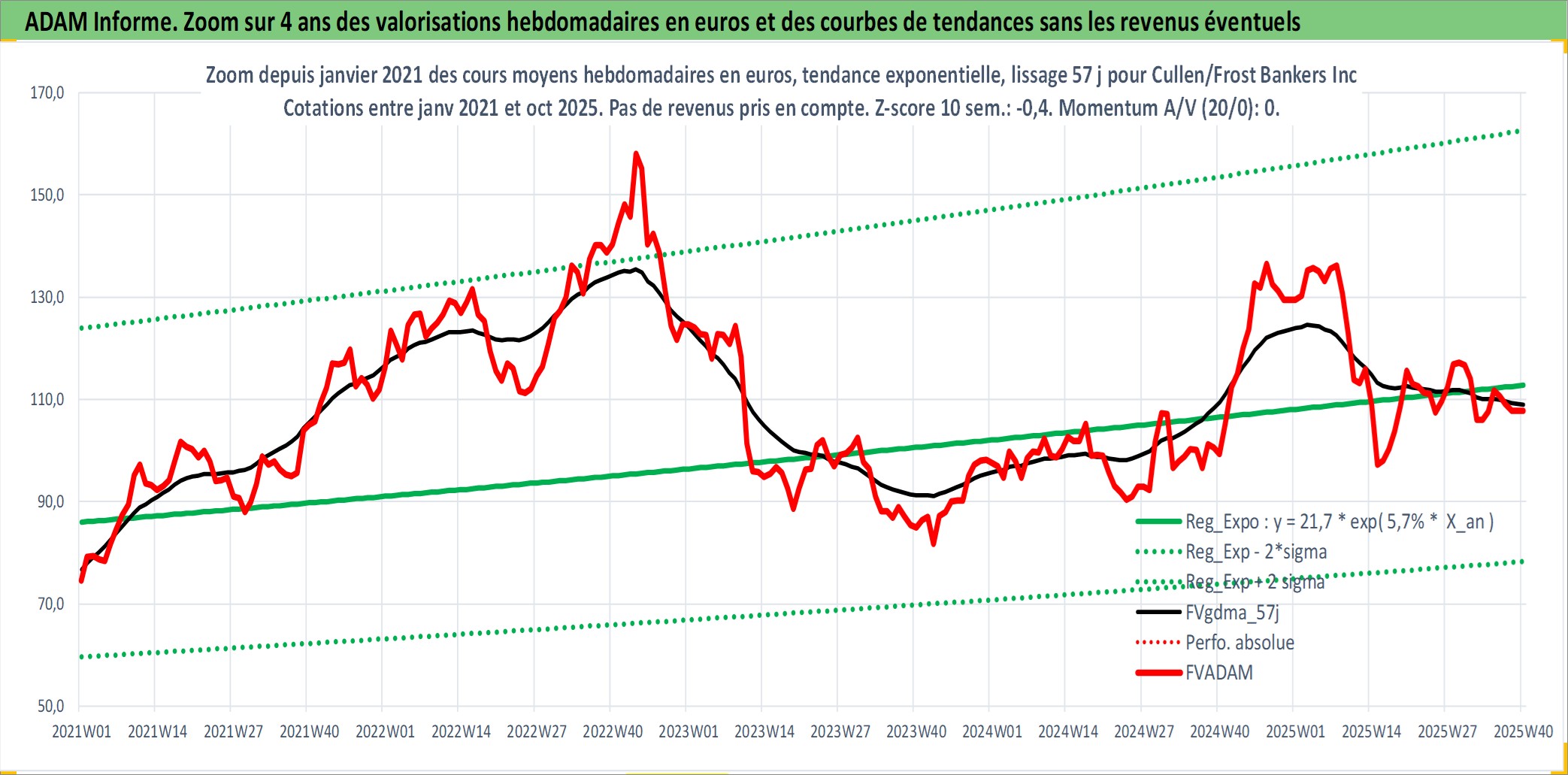 Site dédié aux investisseursPage dédiée sur site financeAnalyse des valorisations hebdomadaires de l'action Cullen/Frost Bankers Inc. Cet actif est cote en USD. Les valorisations sont en contrevaleur EURO et couvrent les semaines 1997W01 a 2025W40. Les revenus de cet actif financier sont pris en compte depuis la semaine 1997W09. La note globale ESG de cet actif est estimee a 5.0 (apres rebasage entre 0 et 20).