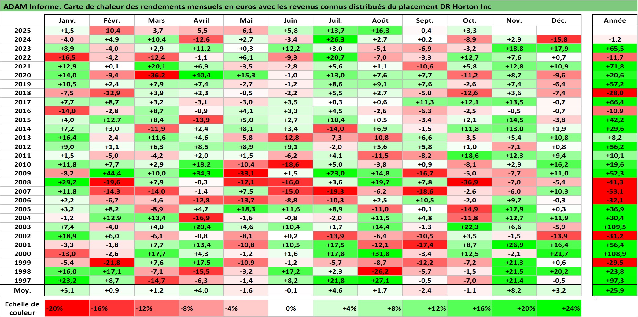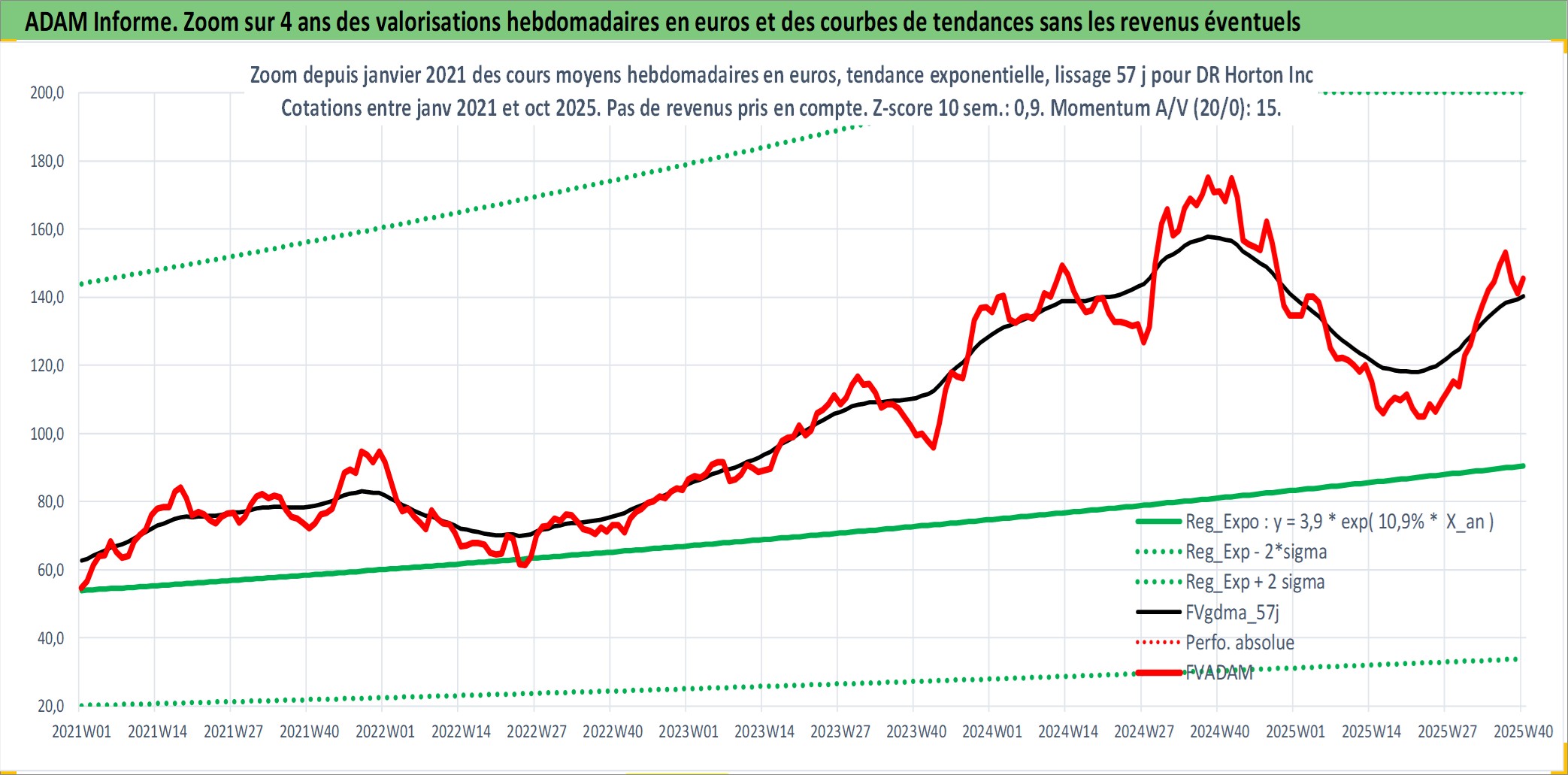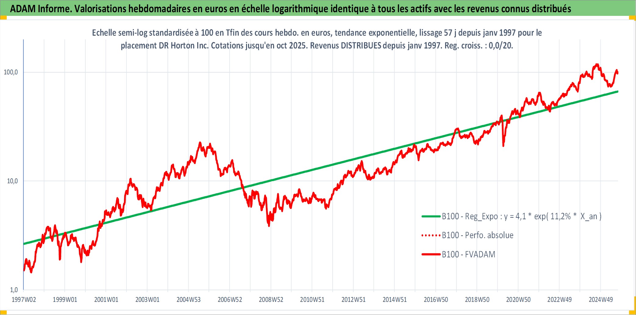 Site dédié aux investisseursPage dédiée sur site financeAnalyse des valorisations hebdomadaires de l'action DR Horton Inc. Cet actif est cote en USD. Les valorisations sont en contrevaleur EURO et couvrent les semaines 1997W01 a 2025W40. Les revenus de cet actif financier sont pris en compte depuis la semaine 1997W05. La note globale ESG de cet actif est estimee a 9.0 (apres rebasage entre 0 et 20).