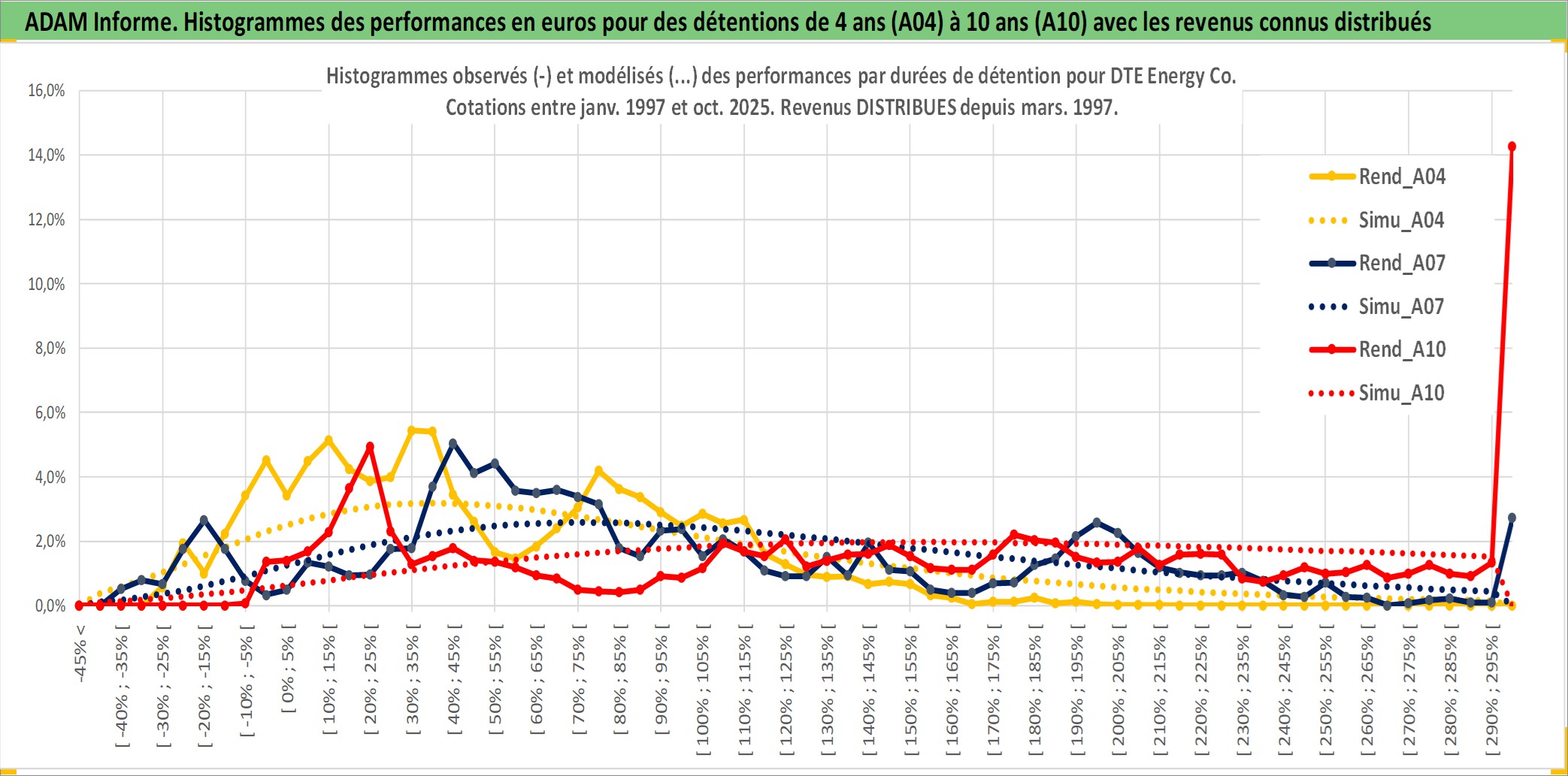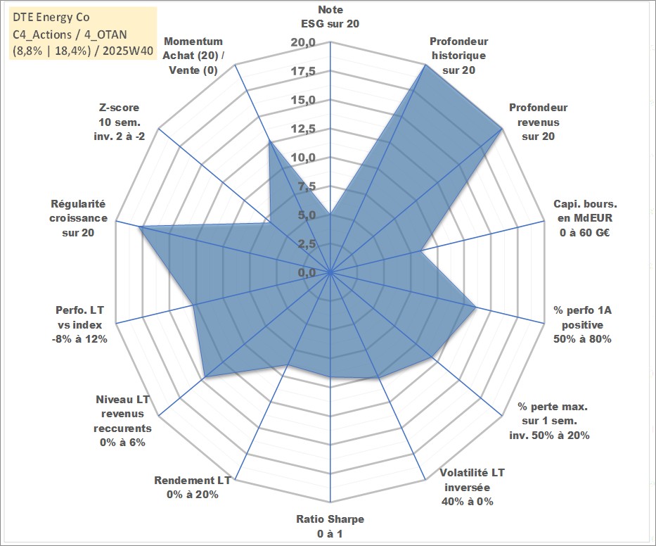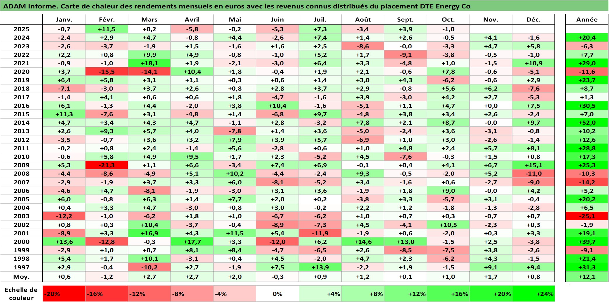 Site dédié aux investisseursPage dédiée sur site financeAnalyse des valorisations hebdomadaires de l'action DTE Energy Co. Cet actif est cote en USD. Les valorisations sont en contrevaleur EURO et couvrent les semaines 1997W01 a 2025W40. Les revenus de cet actif financier sont pris en compte depuis la semaine 1997W12. La note globale ESG de cet actif est estimee a 5.0 (apres rebasage entre 0 et 20).