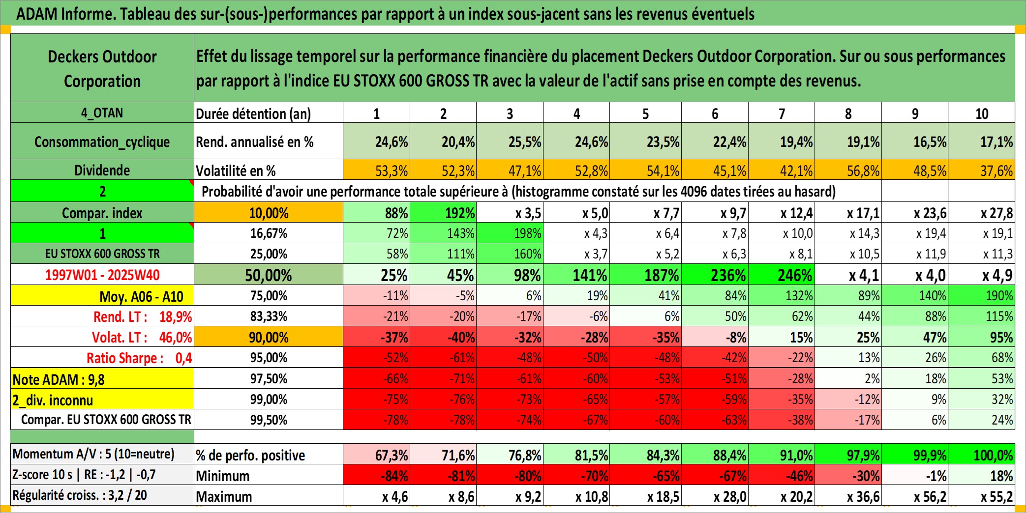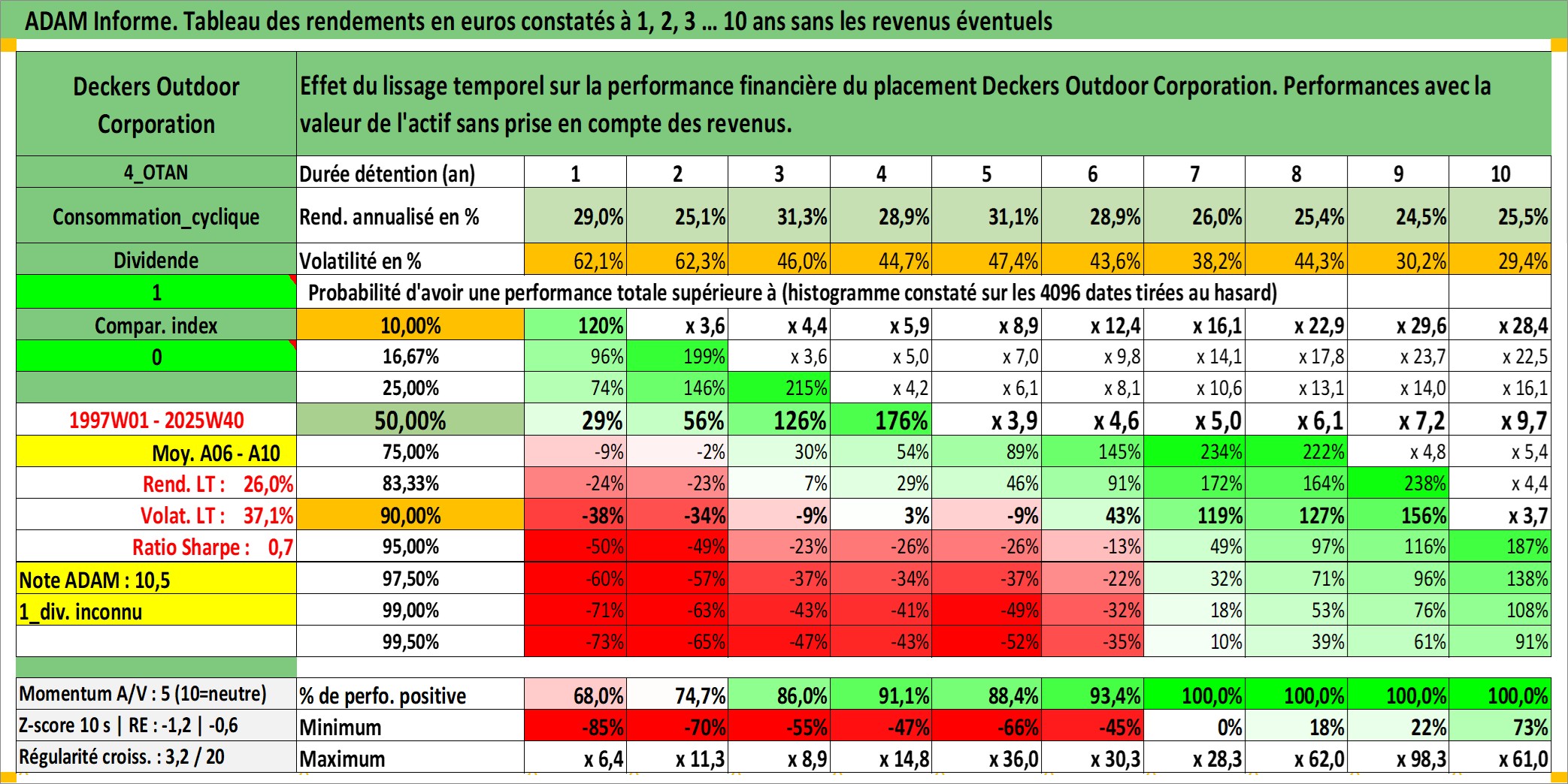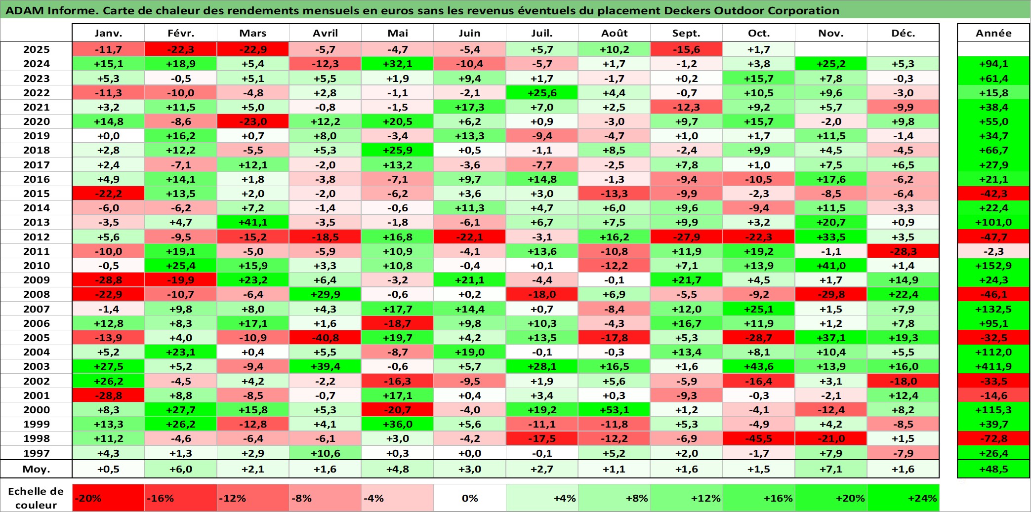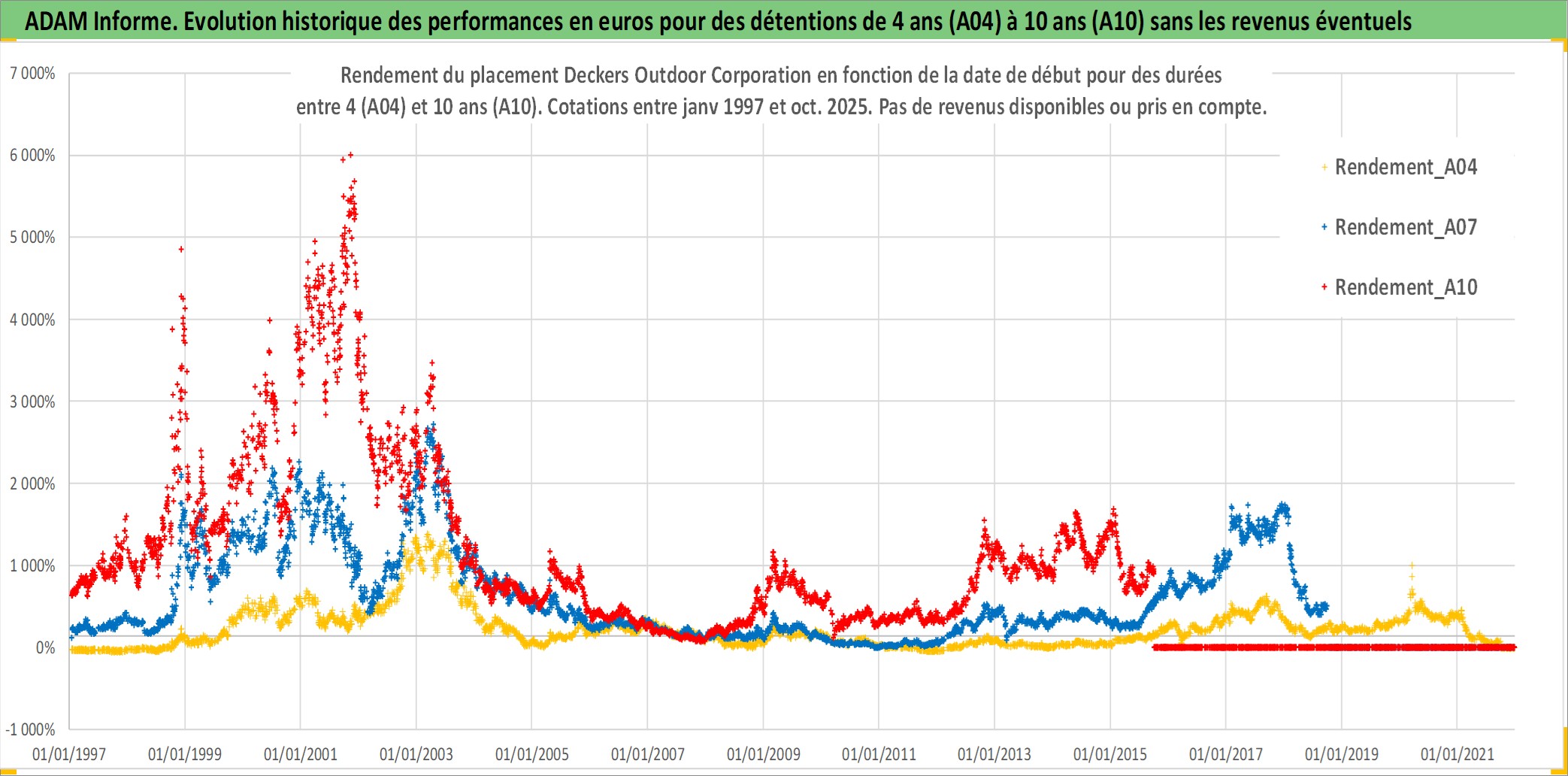 Site dédié aux investisseursPage dédiée sur site financeAnalyse des valorisations hebdomadaires de l'action Deckers Outdoor Corporation. Cet actif est cote en USD. Les valorisations sont en contrevaleur EURO et couvrent les semaines 1997W01 a 2025W40. Les revenus de cet actif financier ne sont pas connus car non existants ou non disponibles sur le site Yahoo Finance. La note ESG de cet actif n'est pas connue.