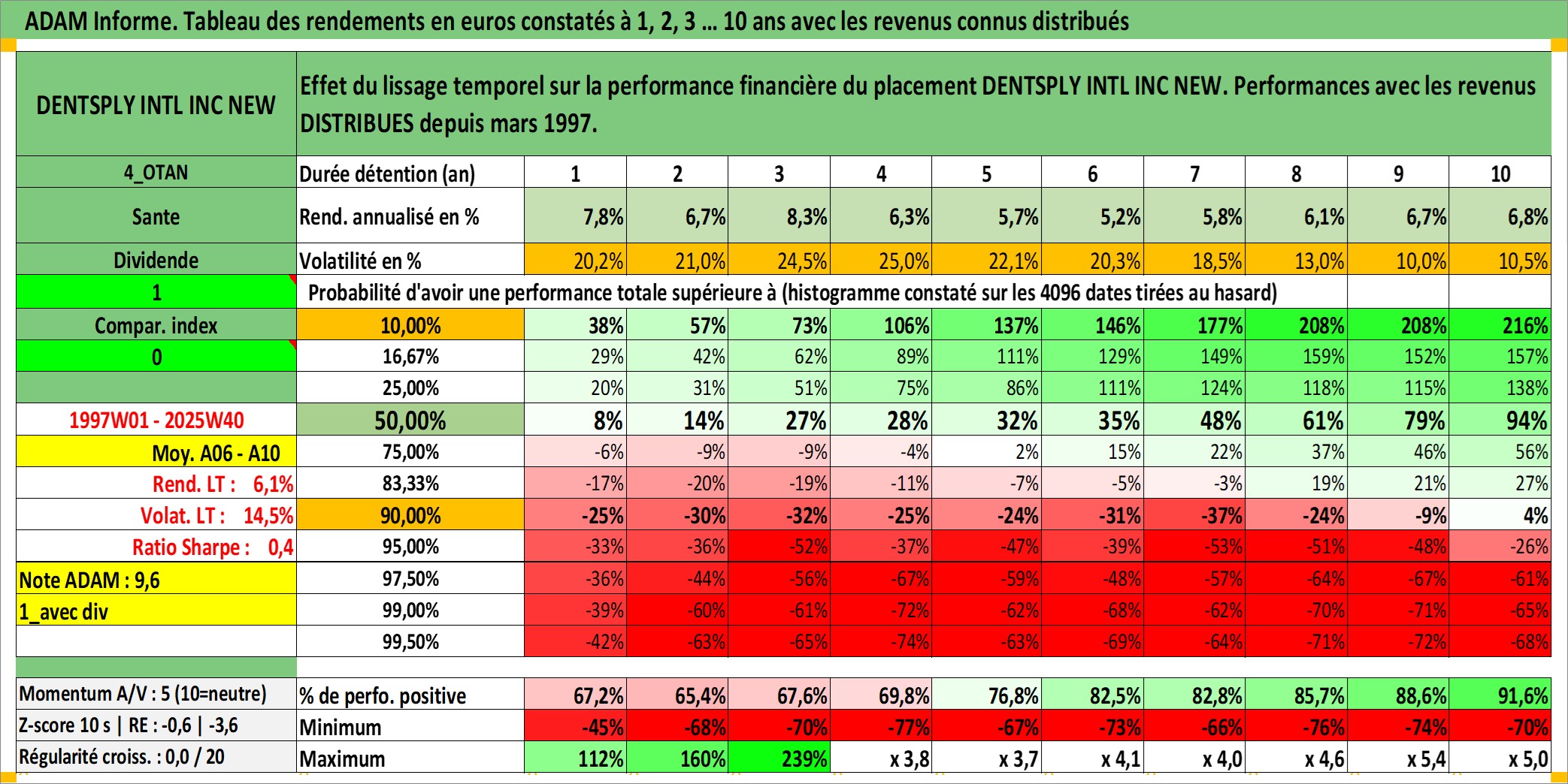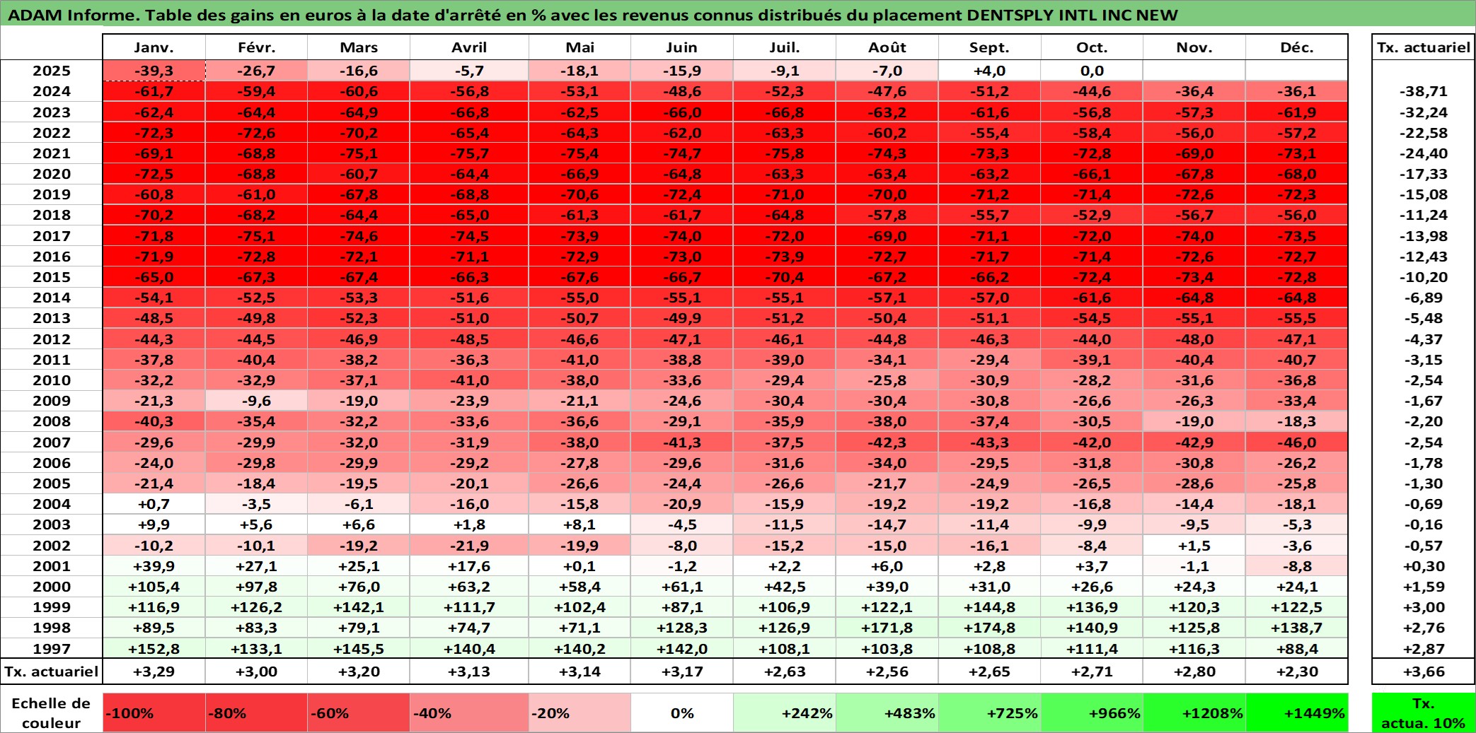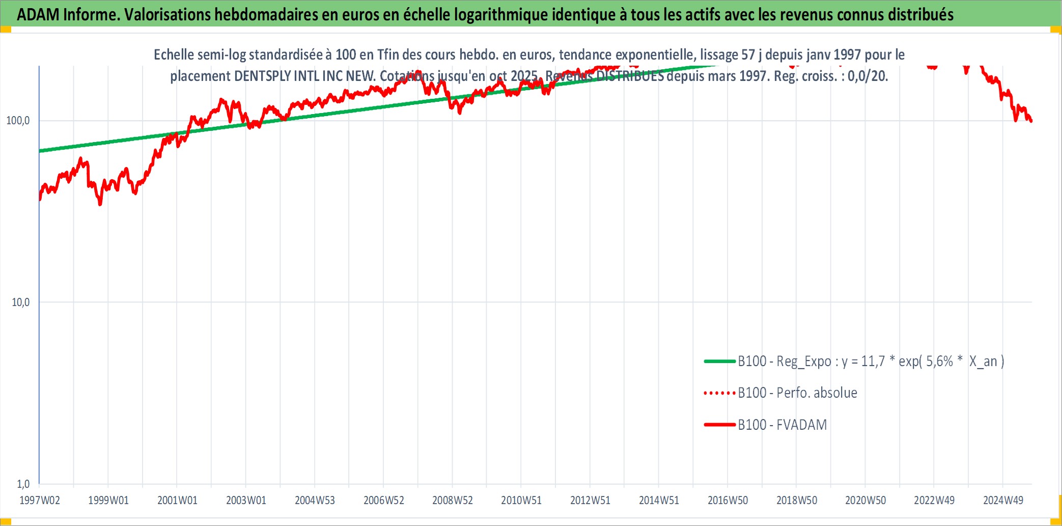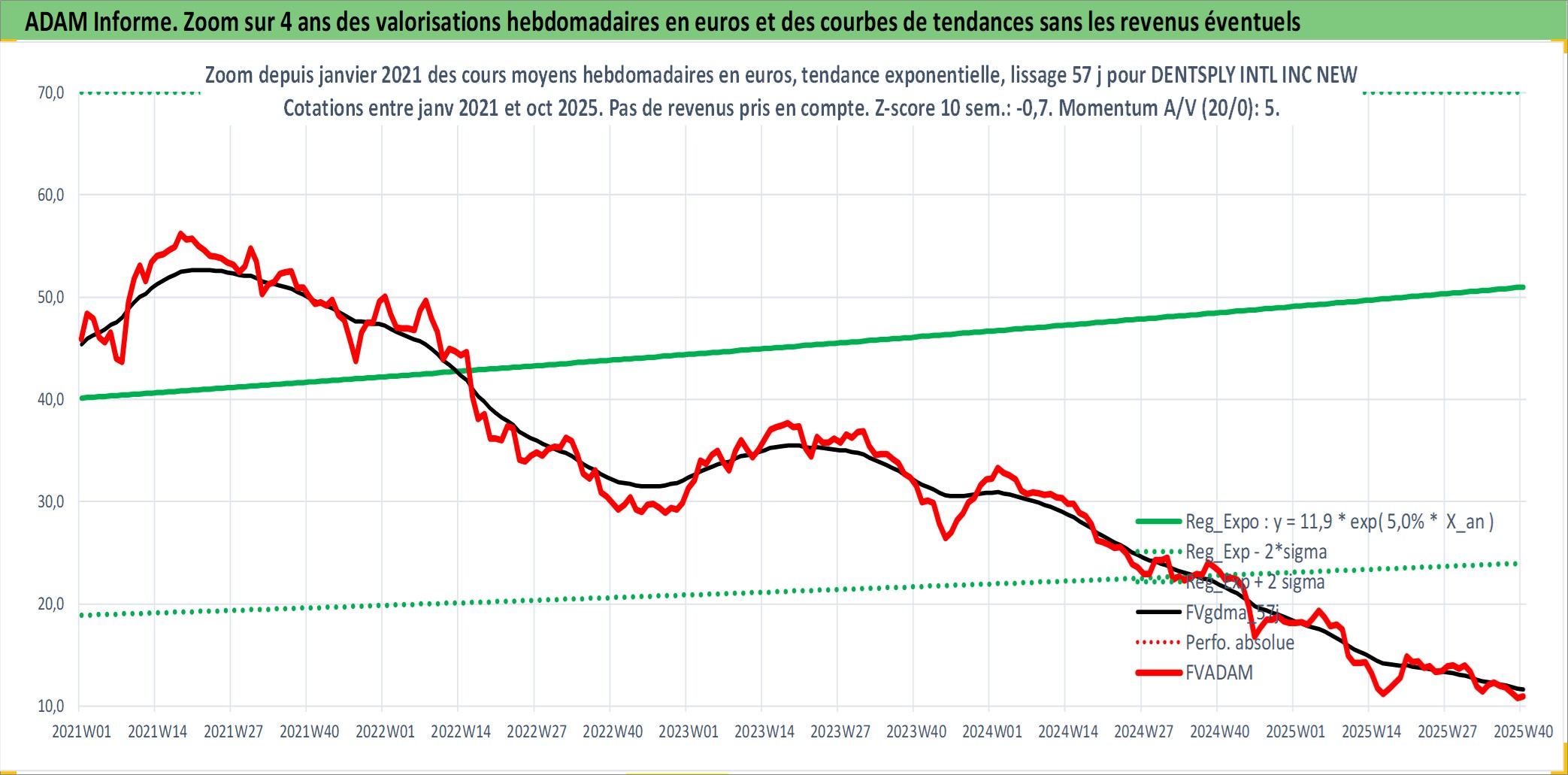 Site dédié aux investisseursPage dédiée sur site financeAnalyse des valorisations hebdomadaires de l'action DENTSPLY INTL INC NEW. Cet actif est cote en USD. Les valorisations sont en contrevaleur EURO et couvrent les semaines 1997W01 a 2025W40. Les revenus de cet actif financier sont pris en compte depuis la semaine 1997W13. La note globale ESG de cet actif est estimee a 13.0 (apres rebasage entre 0 et 20).