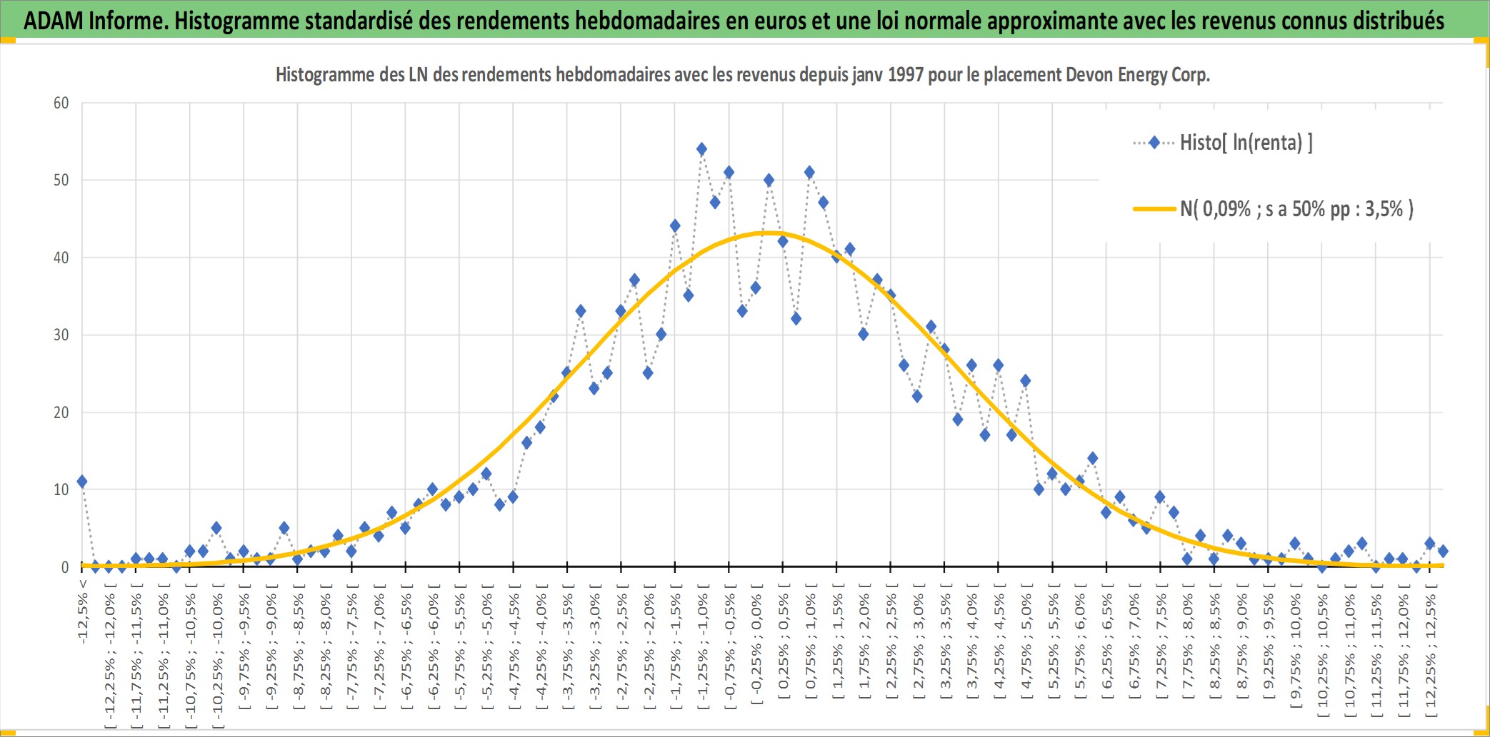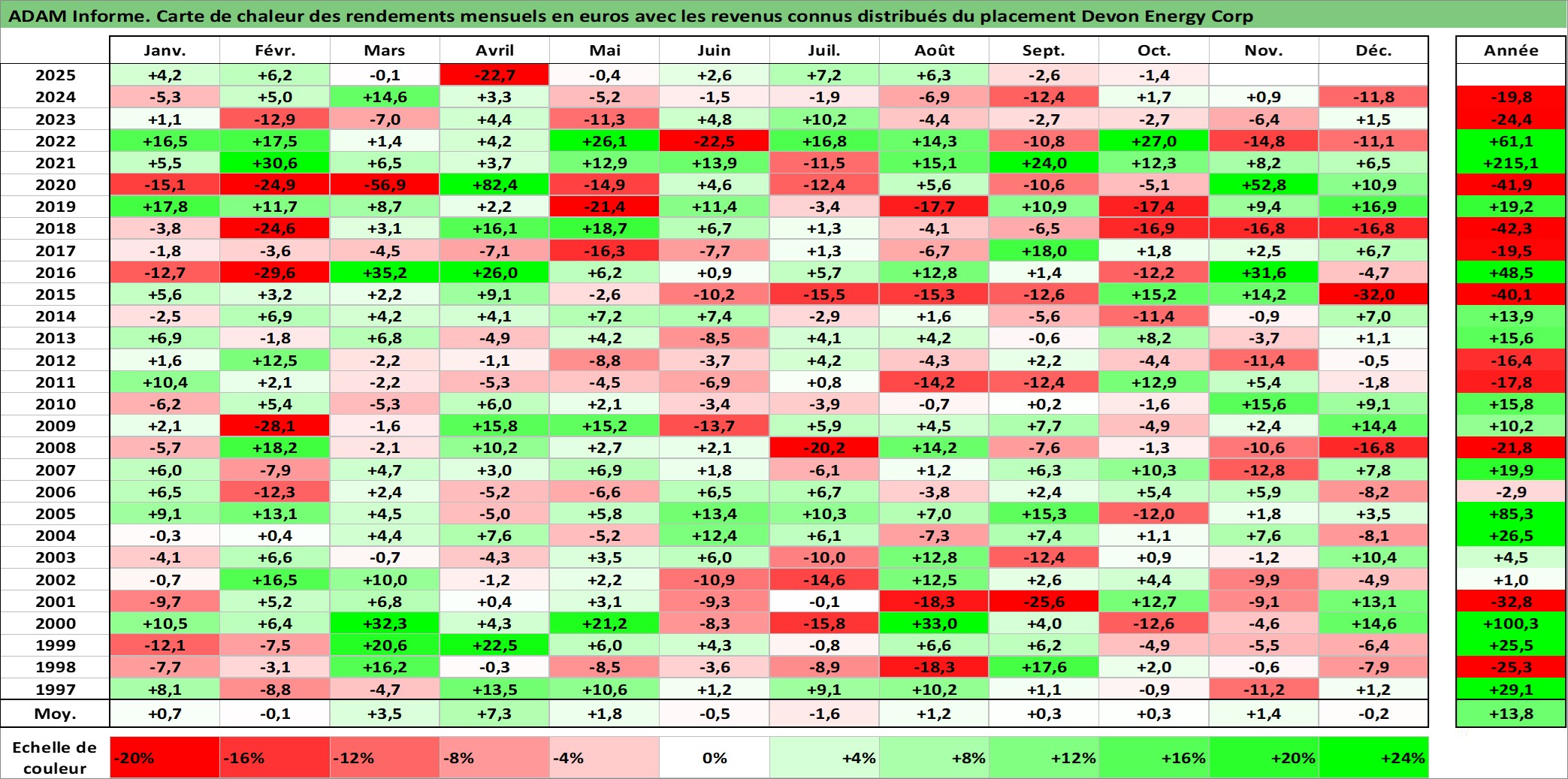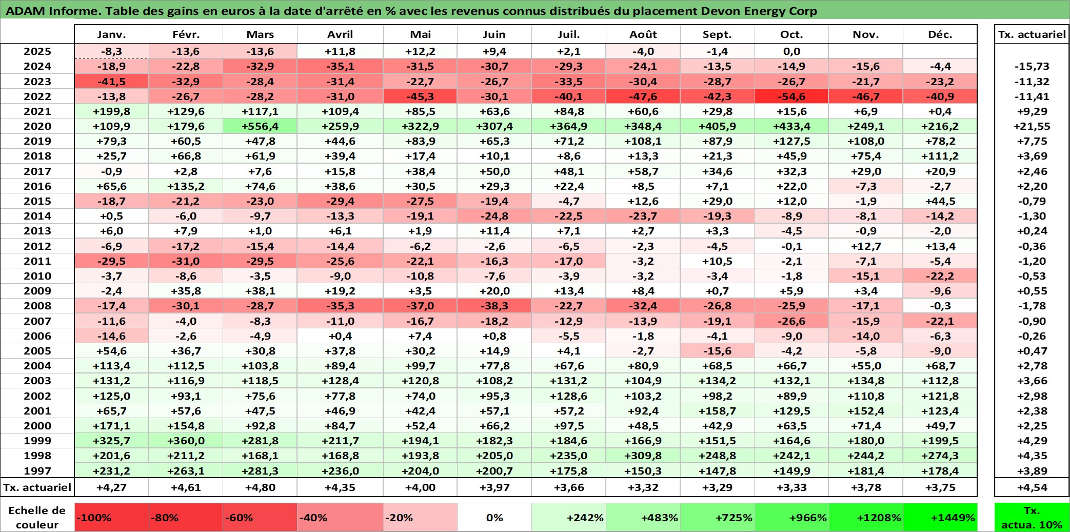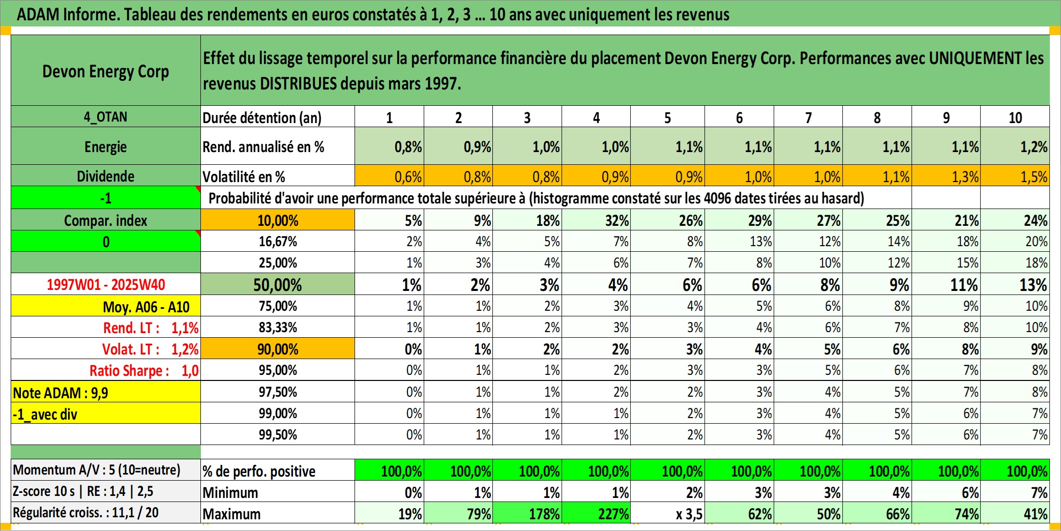 Site dédié aux investisseursPage dédiée sur site financeAnalyse des valorisations hebdomadaires de l'action Devon Energy Corp. Cet actif est cote en USD. Les valorisations sont en contrevaleur EURO et couvrent les semaines 1997W01 a 2025W40. Les revenus de cet actif financier sont pris en compte depuis la semaine 1997W11. La note globale ESG de cet actif est estimee a 3.0 (apres rebasage entre 0 et 20).