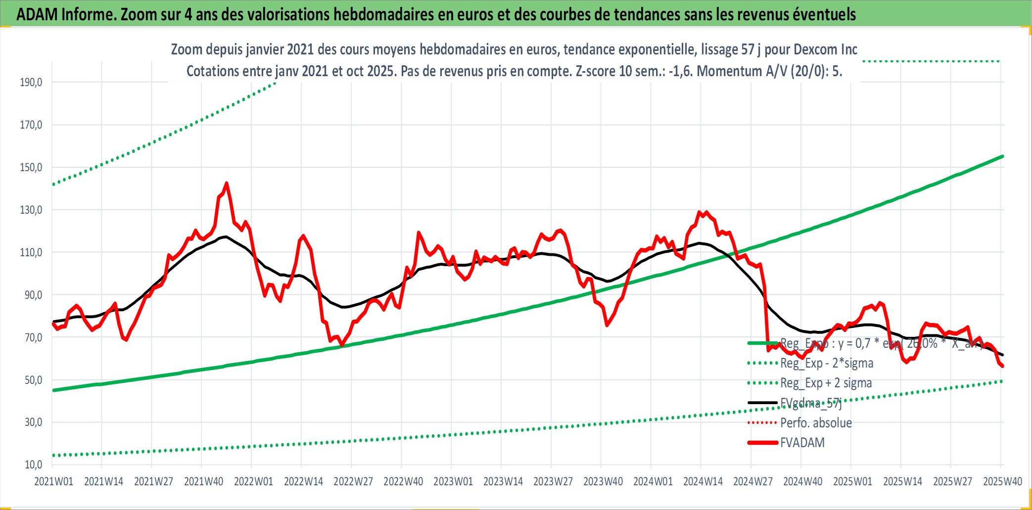 Site dédié aux investisseursPage dédiée sur site financeAnalyse des valorisations hebdomadaires de l'action Dexcom Inc. Cet actif est cote en USD. Les valorisations sont en contrevaleur EURO et couvrent les semaines 2005W15 a 2025W40. Les revenus de cet actif financier ne sont pas connus car non existants ou non disponibles sur le site Yahoo Finance. La note globale ESG de cet actif est estimee a 8.0 (apres rebasage entre 0 et 20).