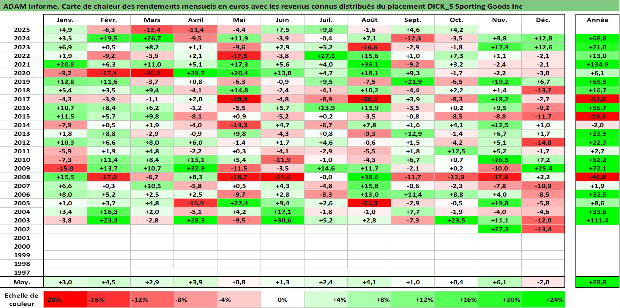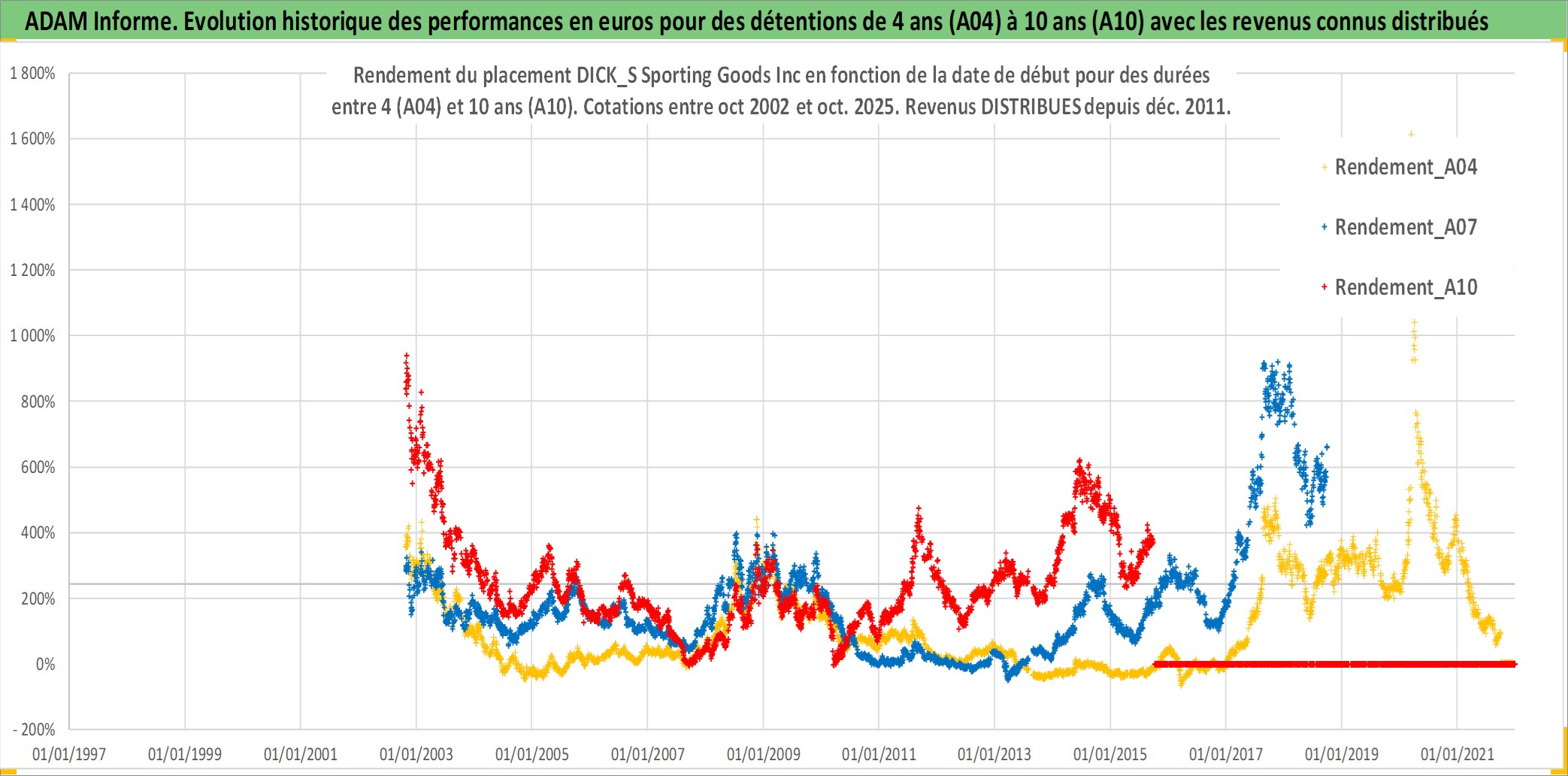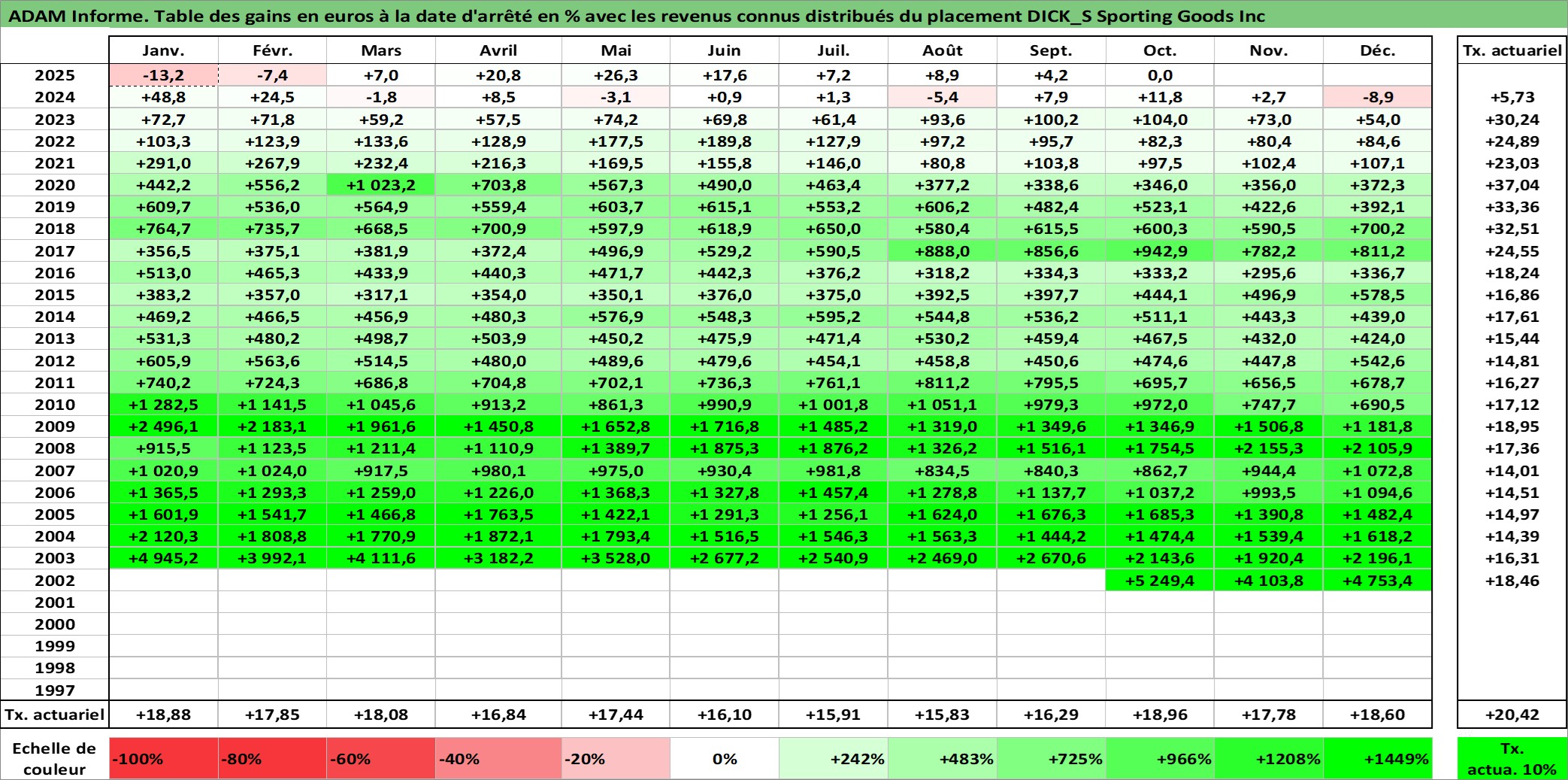 Site dédié aux investisseursPage dédiée sur site financeAnalyse des valorisations hebdomadaires de l'action DICK_S Sporting Goods Inc. Cet actif est cote en USD. Les valorisations sont en contrevaleur EURO et couvrent les semaines 2002W42 a 2025W40. Les revenus de cet actif financier sont pris en compte depuis la semaine 2011W49. La note globale ESG de cet actif est estimee a 13.0 (apres rebasage entre 0 et 20).