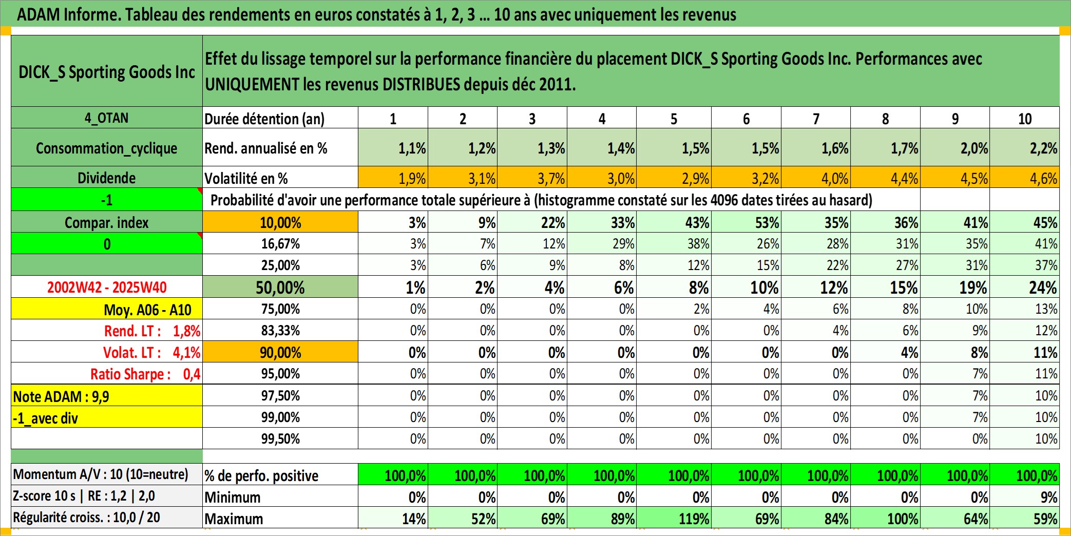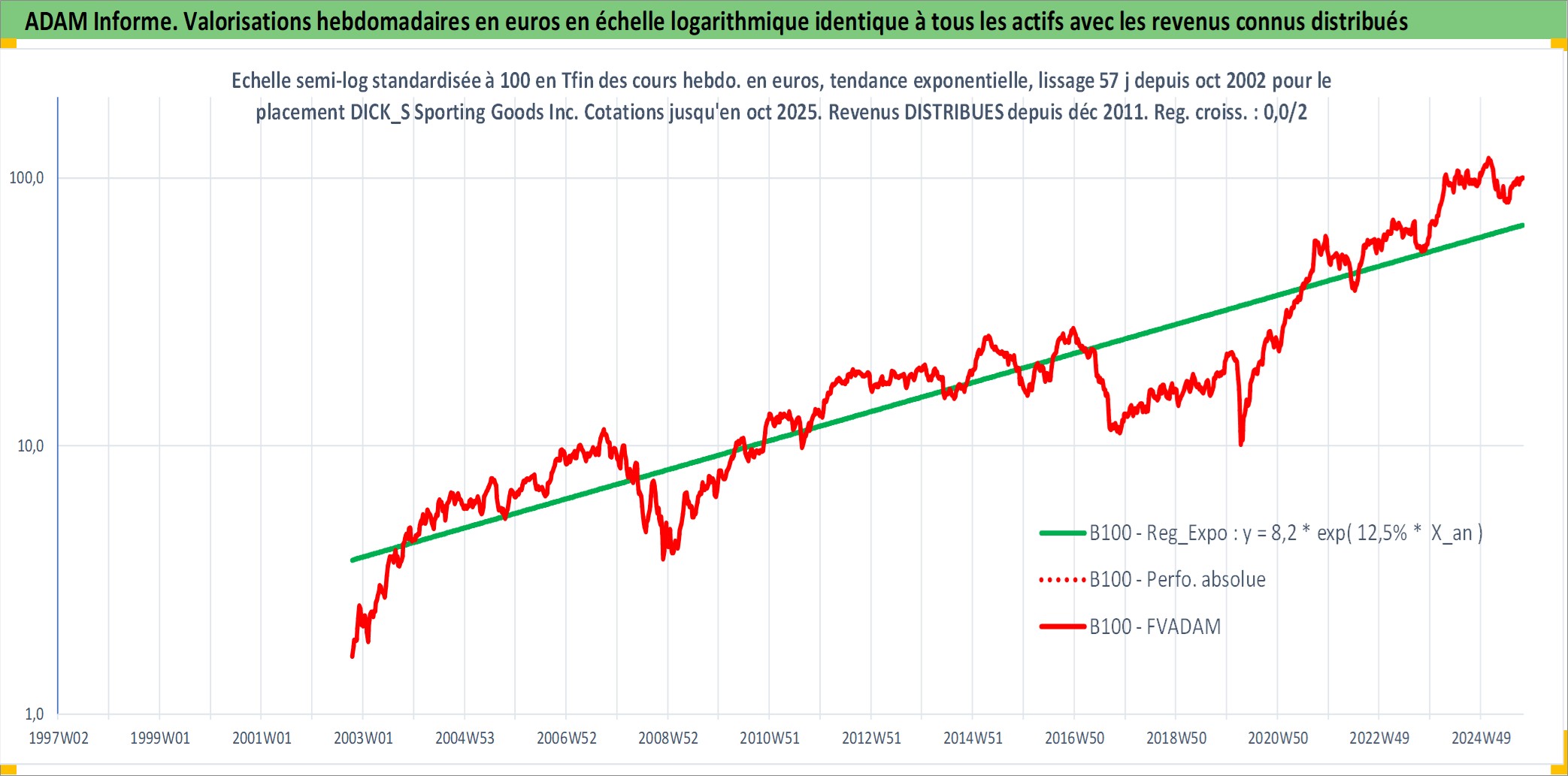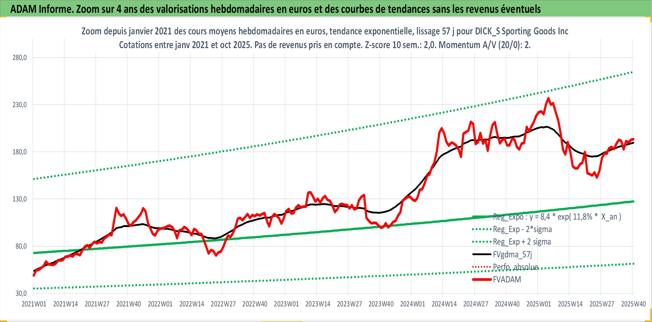 Site dédié aux investisseursPage dédiée sur site financeAnalyse des valorisations hebdomadaires de l'action DICK_S Sporting Goods Inc. Cet actif est cote en USD. Les valorisations sont en contrevaleur EURO et couvrent les semaines 2002W42 a 2025W40. Les revenus de cet actif financier sont pris en compte depuis la semaine 2011W49. La note globale ESG de cet actif est estimee a 13.0 (apres rebasage entre 0 et 20).
