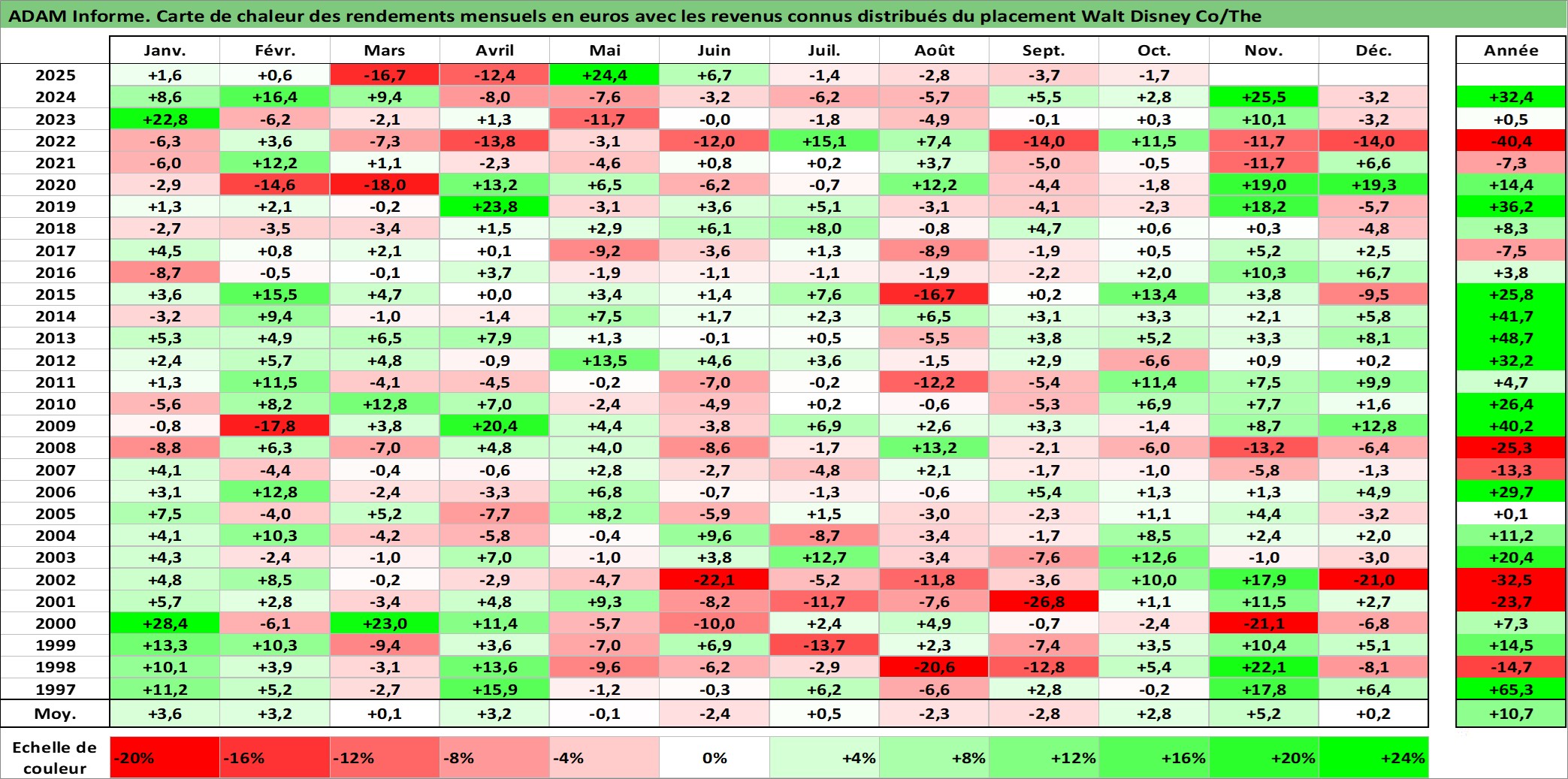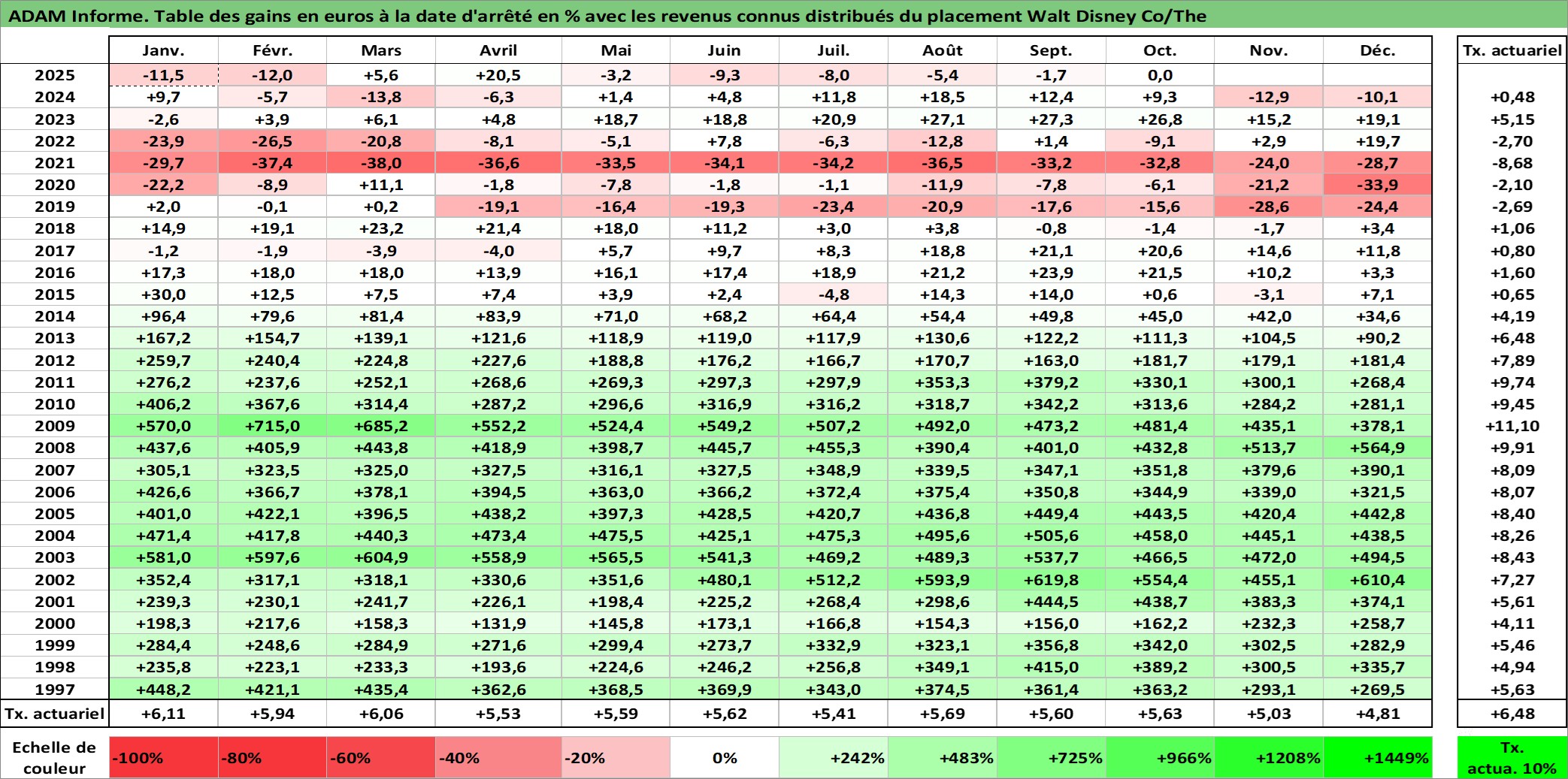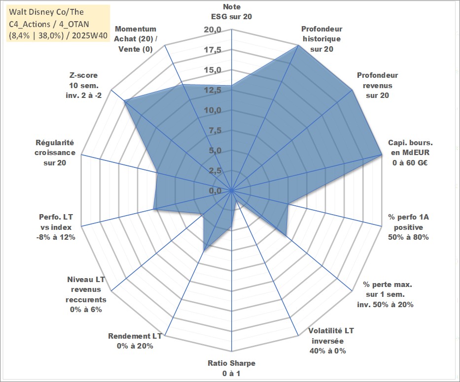 Site dédié aux investisseursPage dédiée sur site financeAnalyse des valorisations hebdomadaires de l'action Walt Disney Co/The. Cet actif est cote en USD. Les valorisations sont en contrevaleur EURO et couvrent les semaines 1997W01 a 2025W40. Les revenus de cet actif financier sont pris en compte depuis la semaine 1997W02. La note globale ESG de cet actif est estimee a 13.0 (apres rebasage entre 0 et 20).