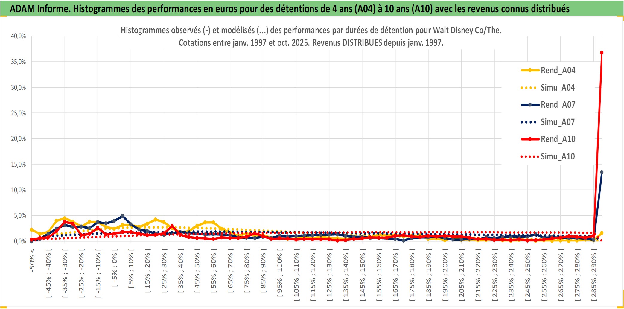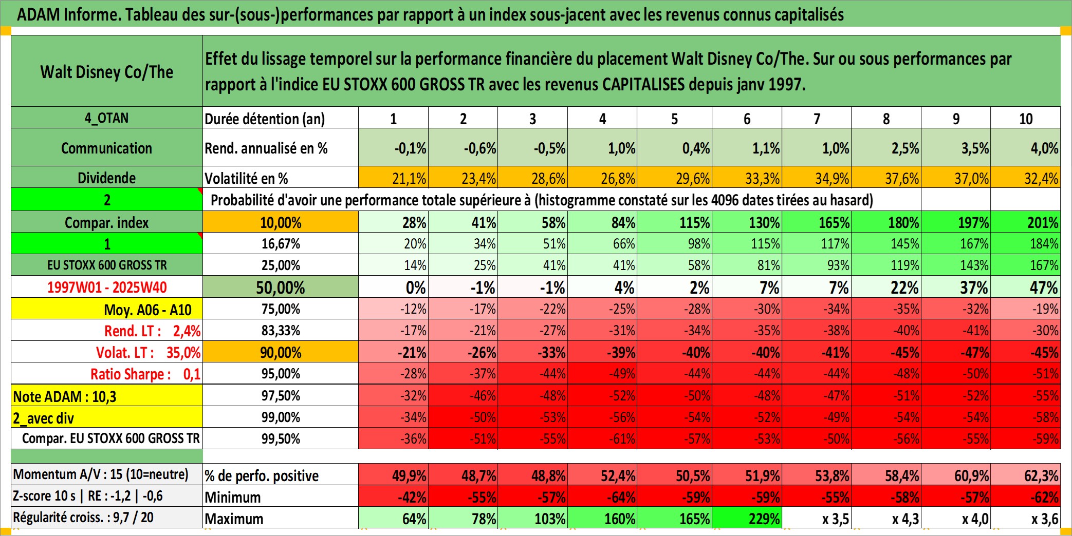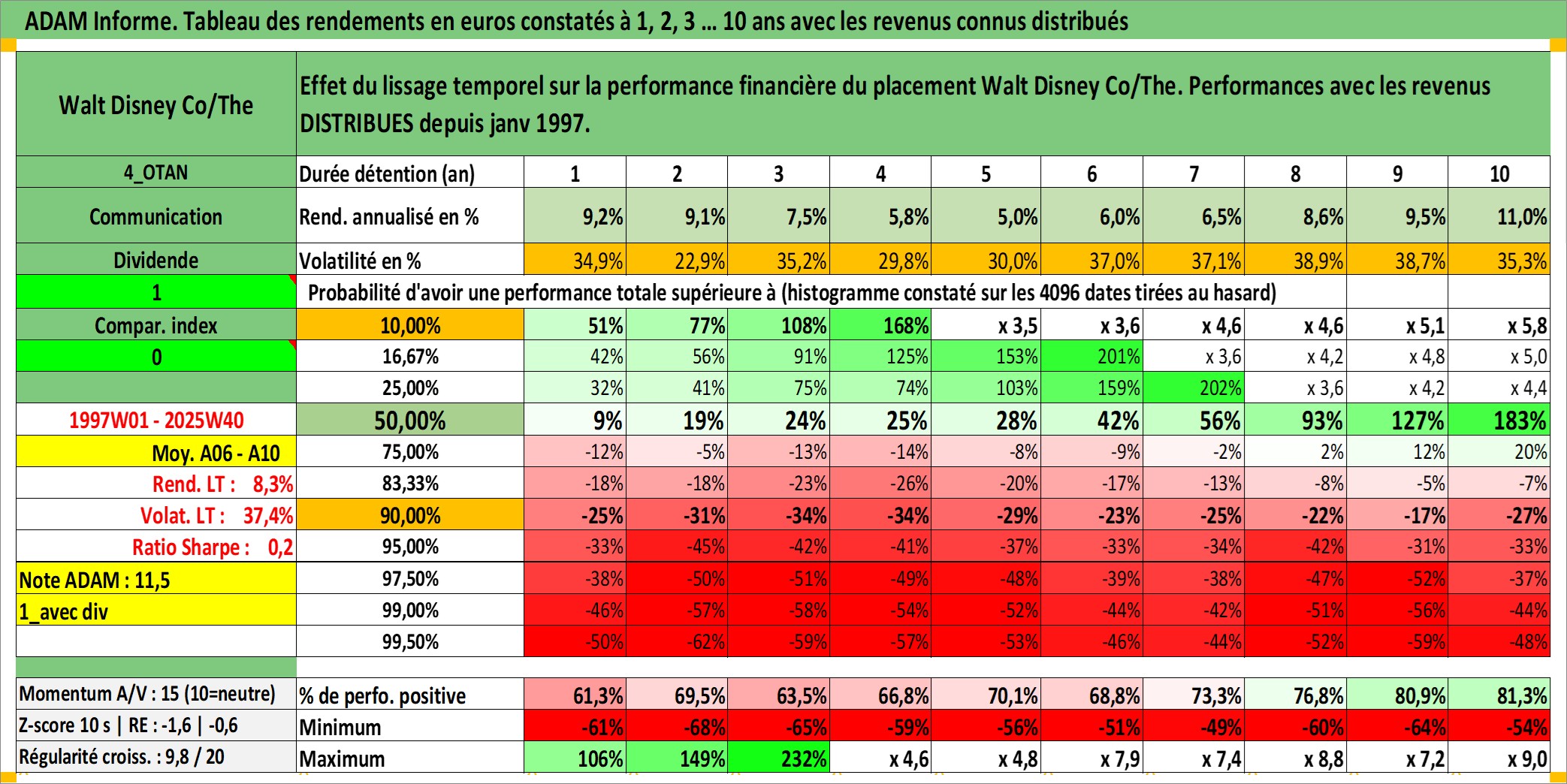 Site dédié aux investisseursPage dédiée sur site financeAnalyse des valorisations hebdomadaires de l'action Walt Disney Co/The. Cet actif est cote en USD. Les valorisations sont en contrevaleur EURO et couvrent les semaines 1997W01 a 2025W40. Les revenus de cet actif financier sont pris en compte depuis la semaine 1997W02. La note globale ESG de cet actif est estimee a 13.0 (apres rebasage entre 0 et 20).