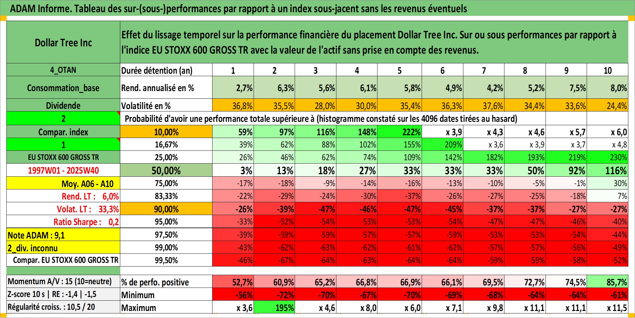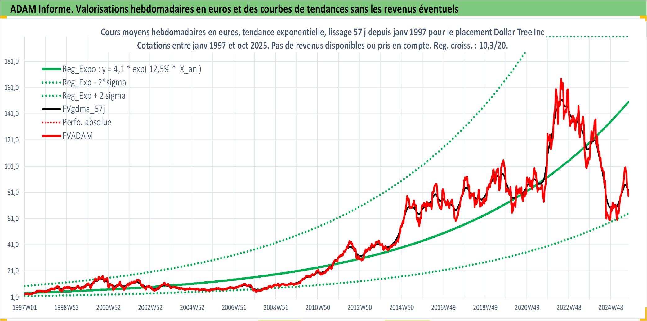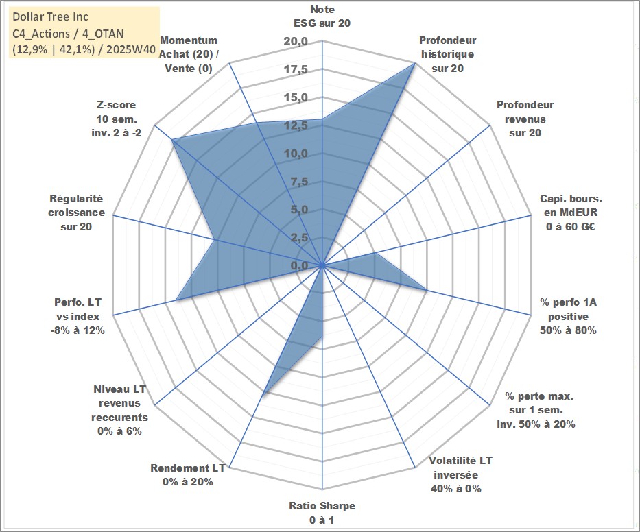 Site dédié aux investisseursPage dédiée sur site financeAnalyse des valorisations hebdomadaires de l'action Dollar Tree Inc. Cet actif est cote en USD. Les valorisations sont en contrevaleur EURO et couvrent les semaines 1997W01 a 2025W40. Les revenus de cet actif financier ne sont pas connus car non existants ou non disponibles sur le site Yahoo Finance. La note globale ESG de cet actif est estimee a 13.0 (apres rebasage entre 0 et 20).