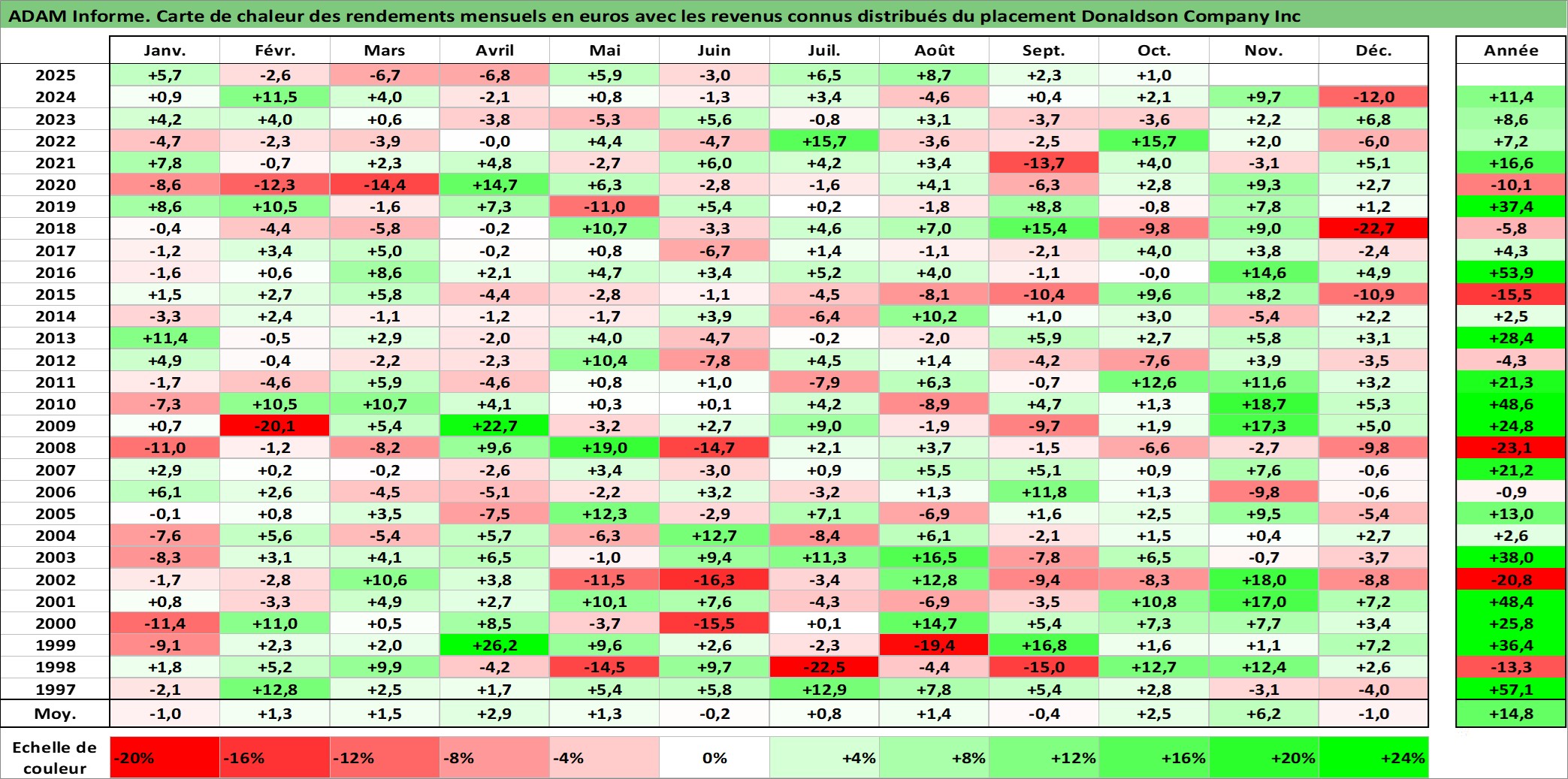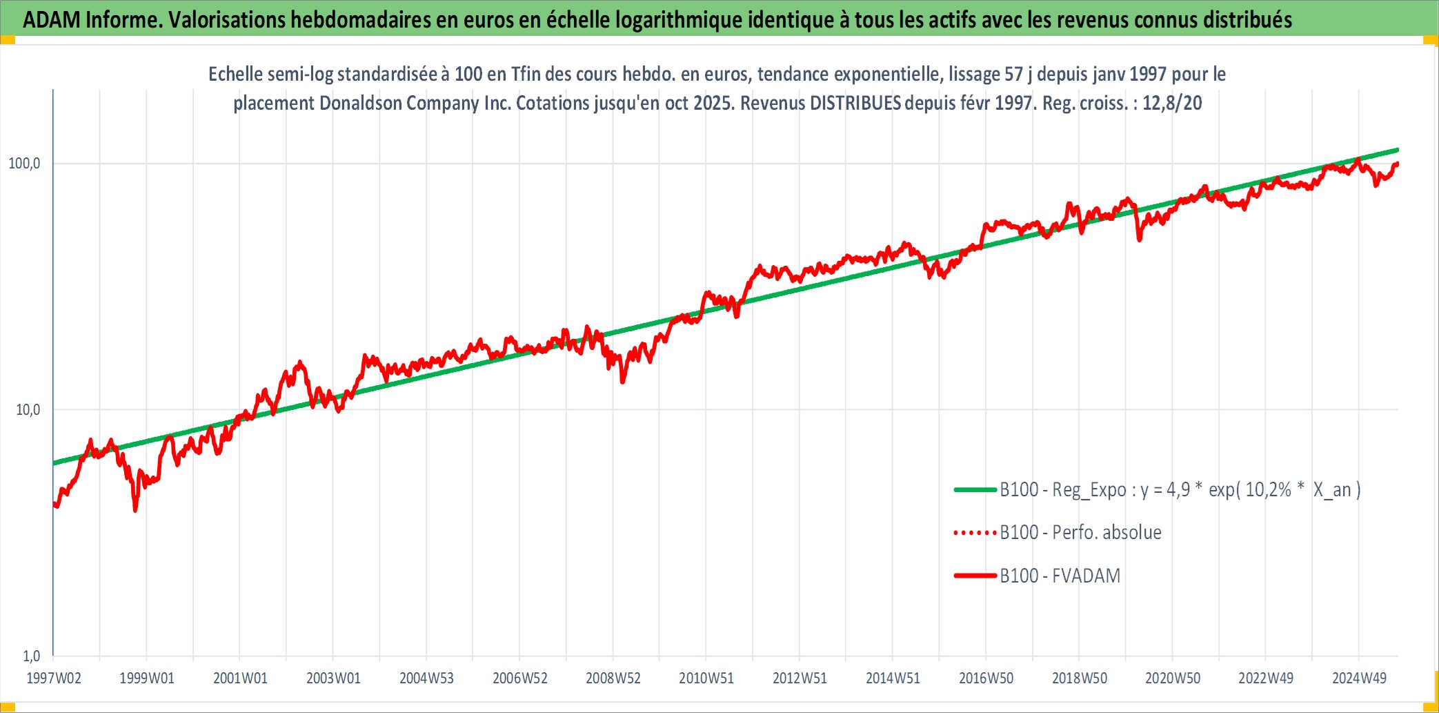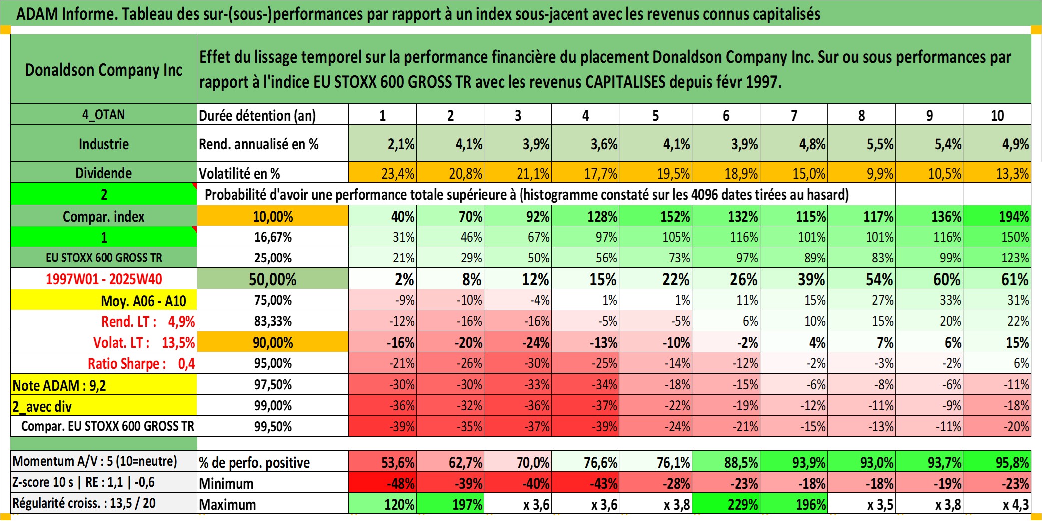 Site dédié aux investisseursPage dédiée sur site financeAnalyse des valorisations hebdomadaires de l'action Donaldson Company Inc. Cet actif est cote en USD. Les valorisations sont en contrevaleur EURO et couvrent les semaines 1997W01 a 2025W40. Les revenus de cet actif financier sont pris en compte depuis la semaine 1997W09. La note globale ESG de cet actif est estimee a 4.0 (apres rebasage entre 0 et 20).