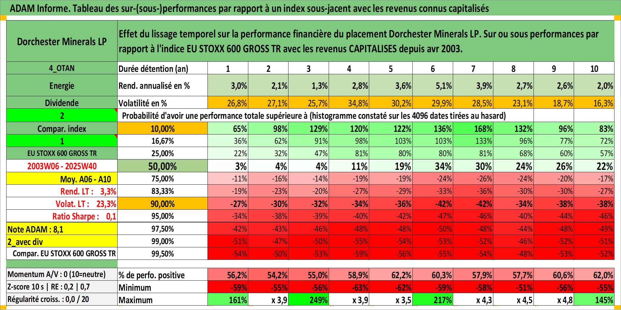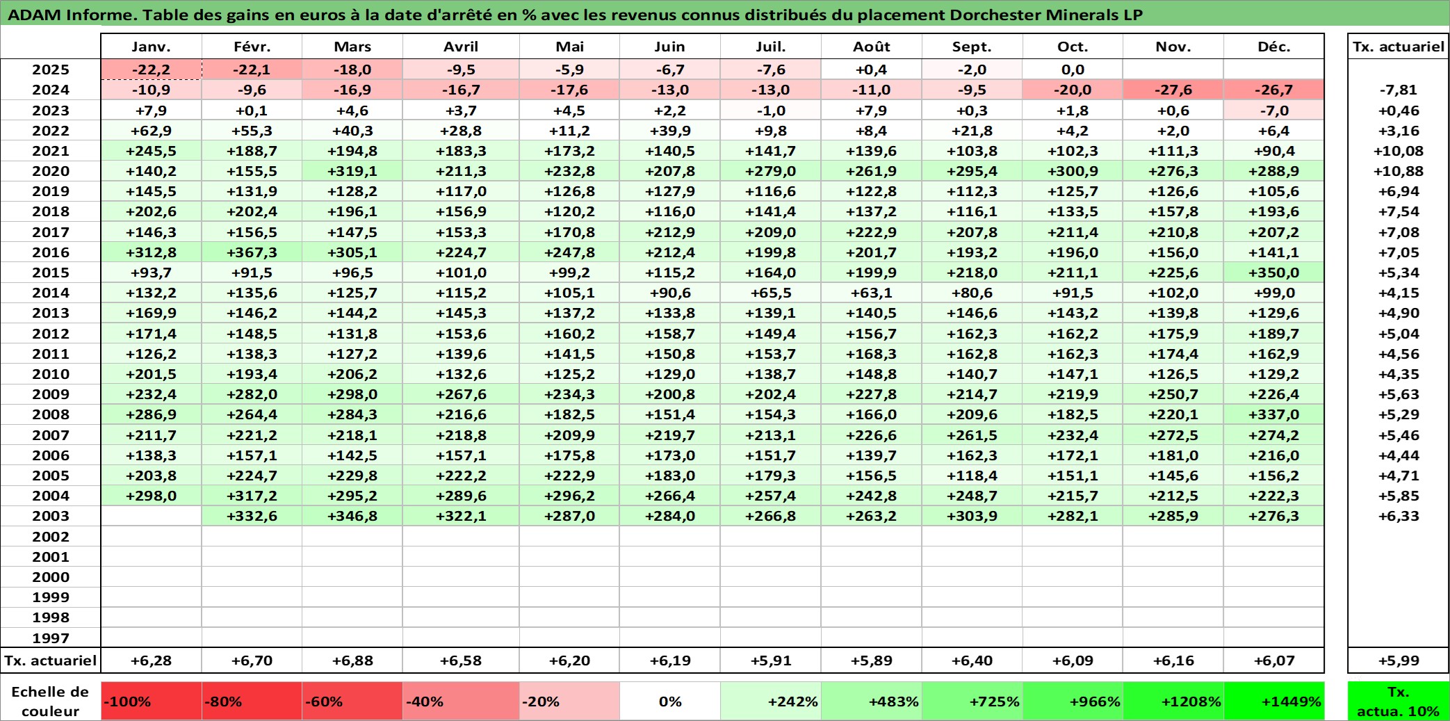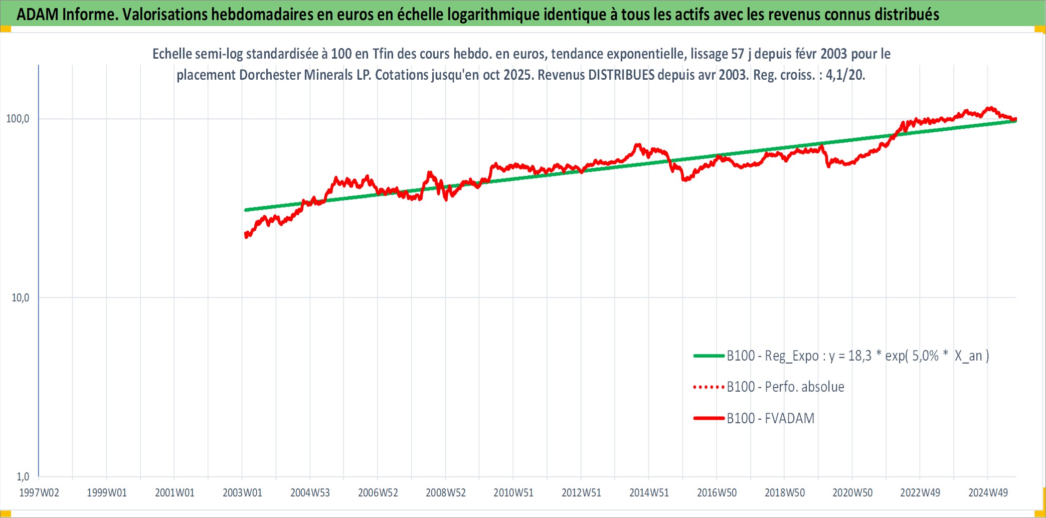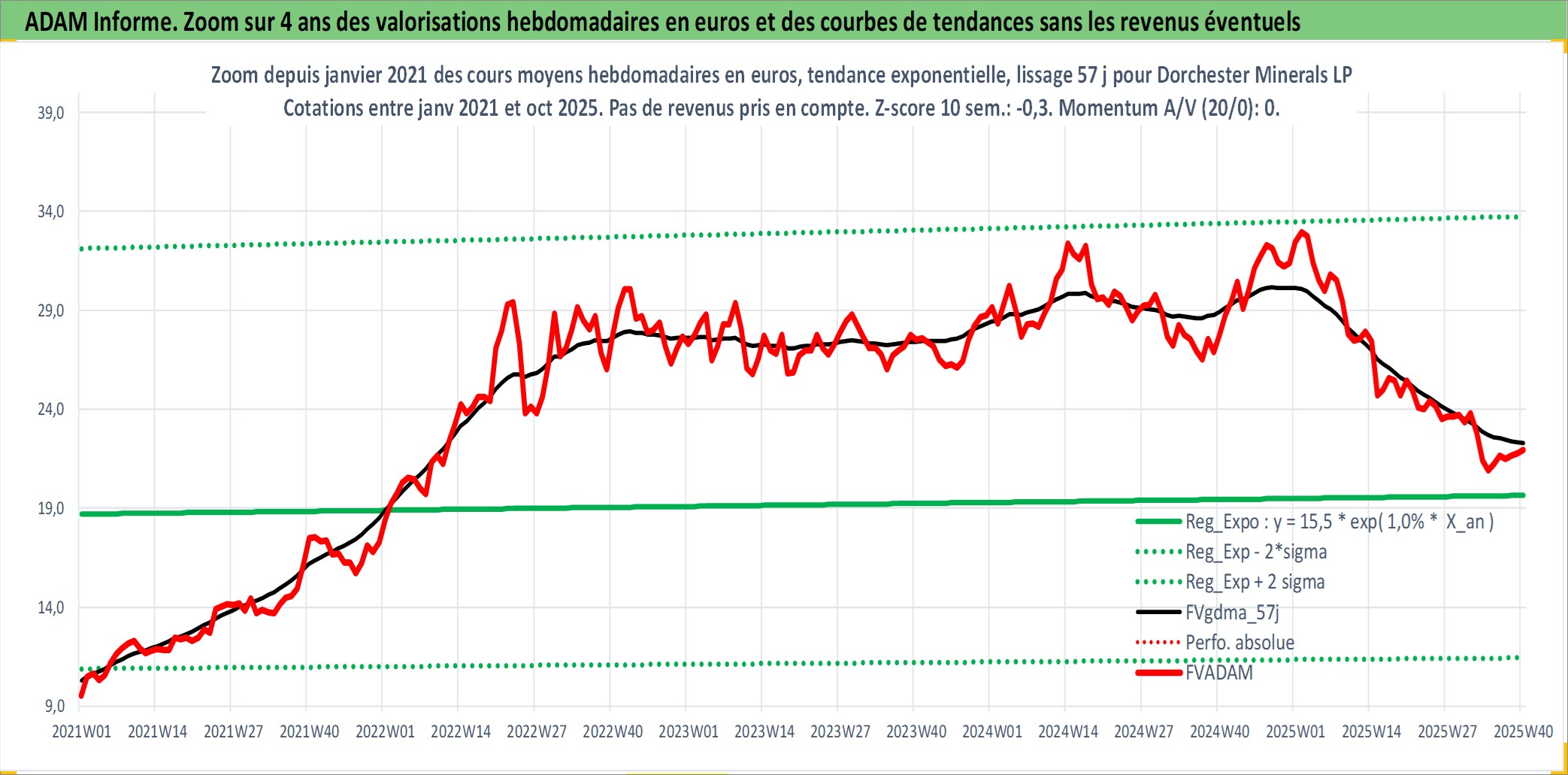 Site dédié aux investisseursPage dédiée sur site financeAnalyse des valorisations hebdomadaires de l'action Dorchester Minerals LP. Cet actif est cote en USD. Les valorisations sont en contrevaleur EURO et couvrent les semaines 2003W06 a 2025W40. Les revenus de cet actif financier sont pris en compte depuis la semaine 2003W17. La note ESG de cet actif n'est pas connue.