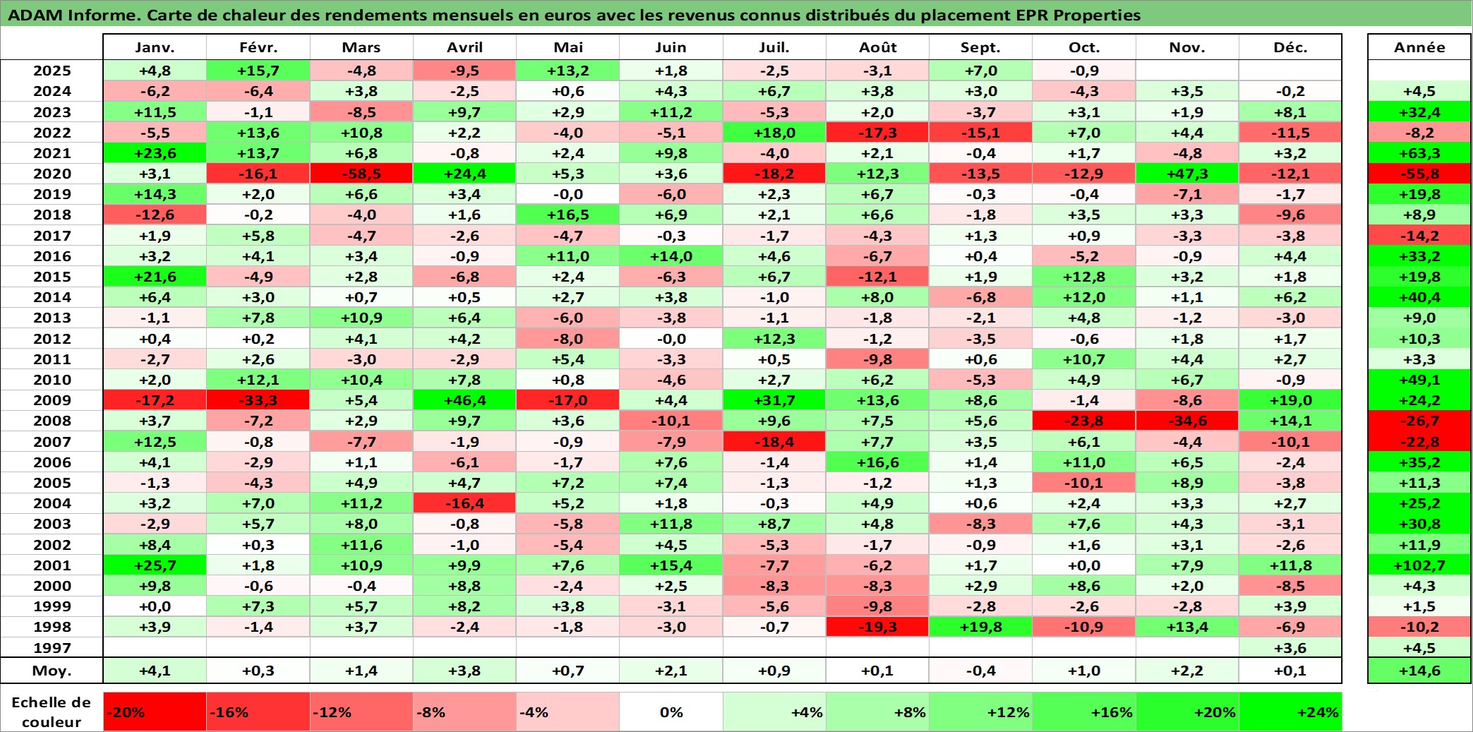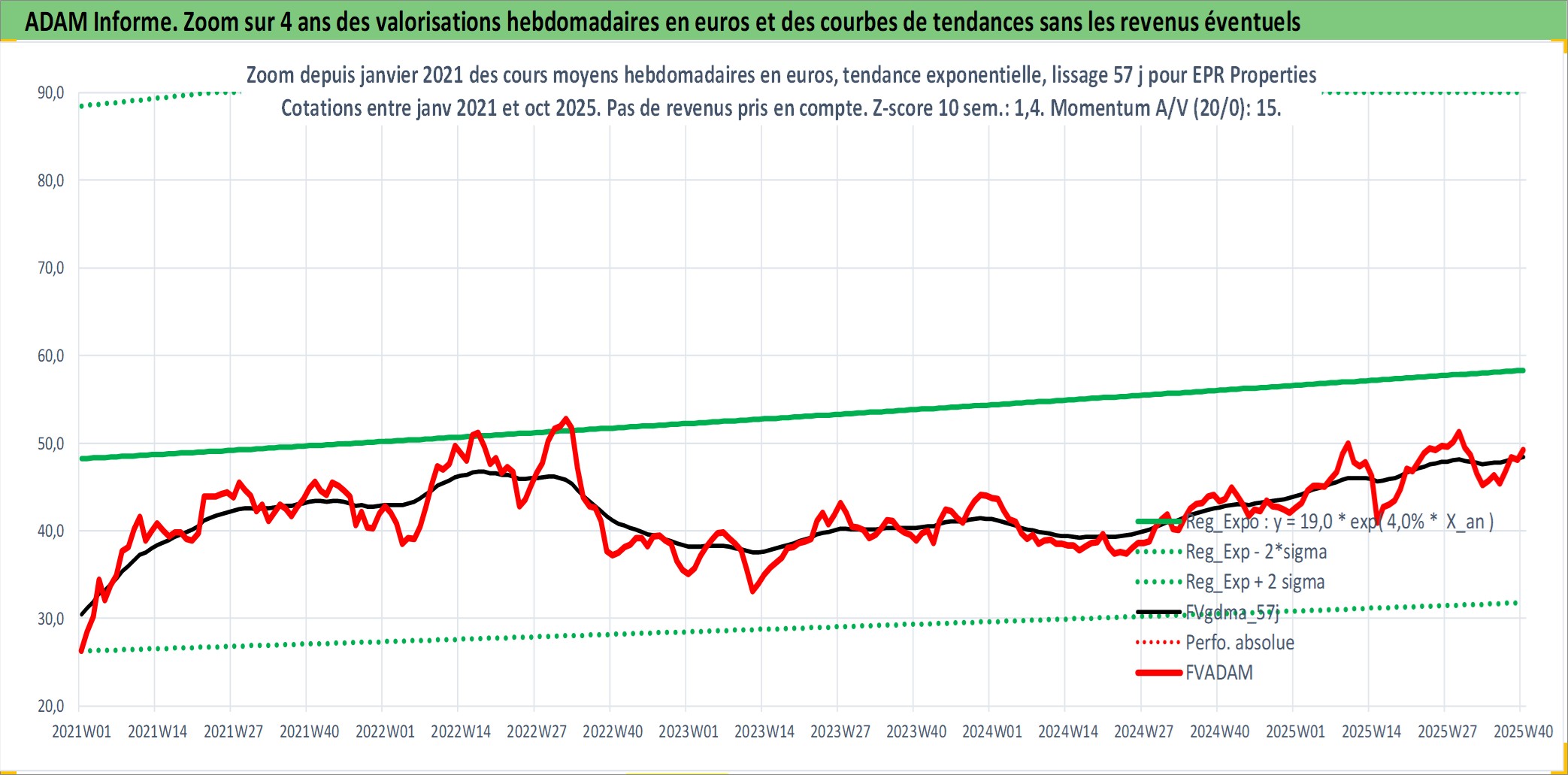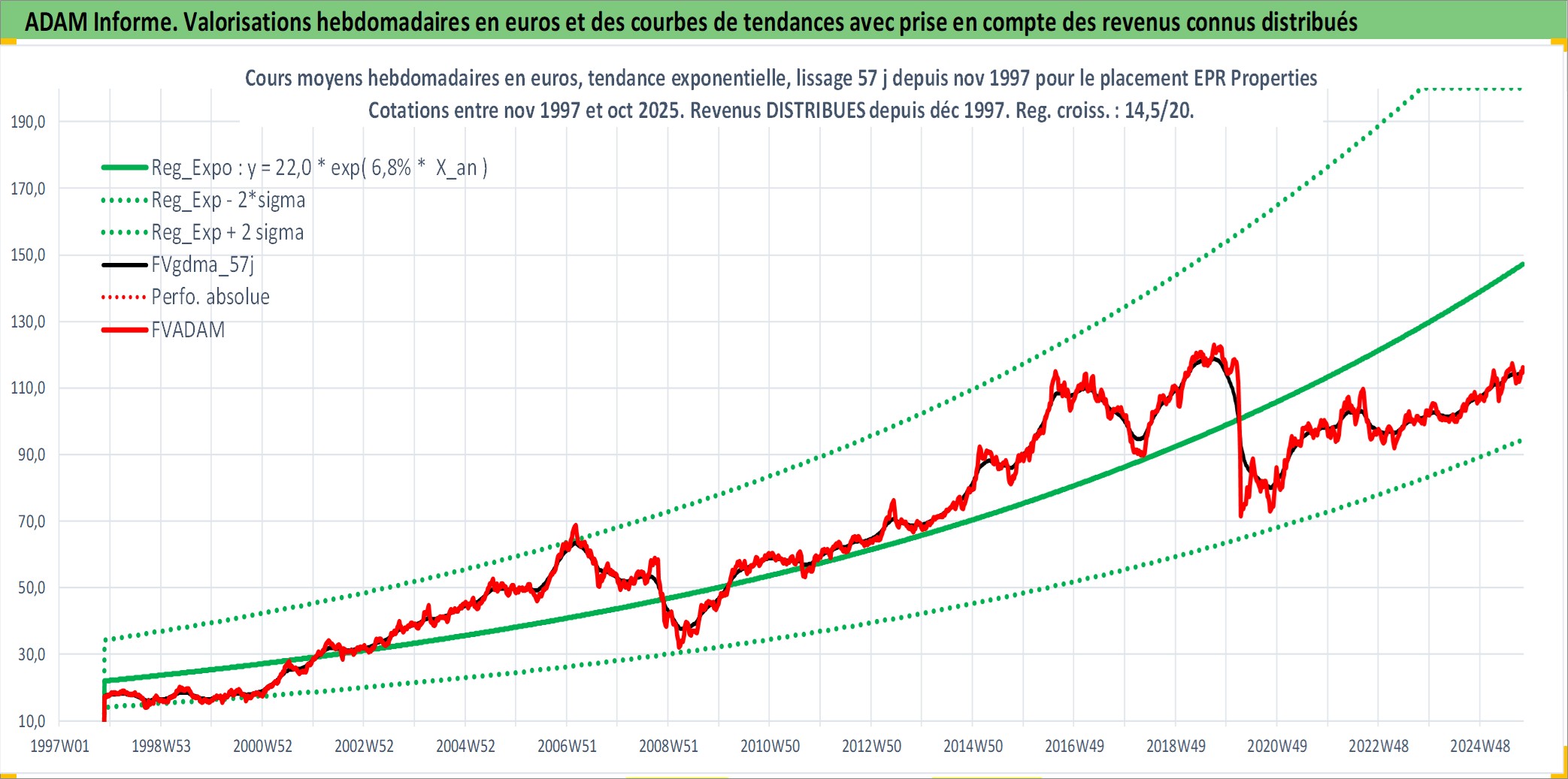 Site dédié aux investisseursPage dédiée sur site financeAnalyse des valorisations hebdomadaires de l'action EPR Properties. Cet actif est cote en USD. Les valorisations sont en contrevaleur EURO et couvrent les semaines 1997W47 a 2025W40. Les revenus de cet actif financier sont pris en compte depuis la semaine 1997W52. La note ESG de cet actif n'est pas connue.