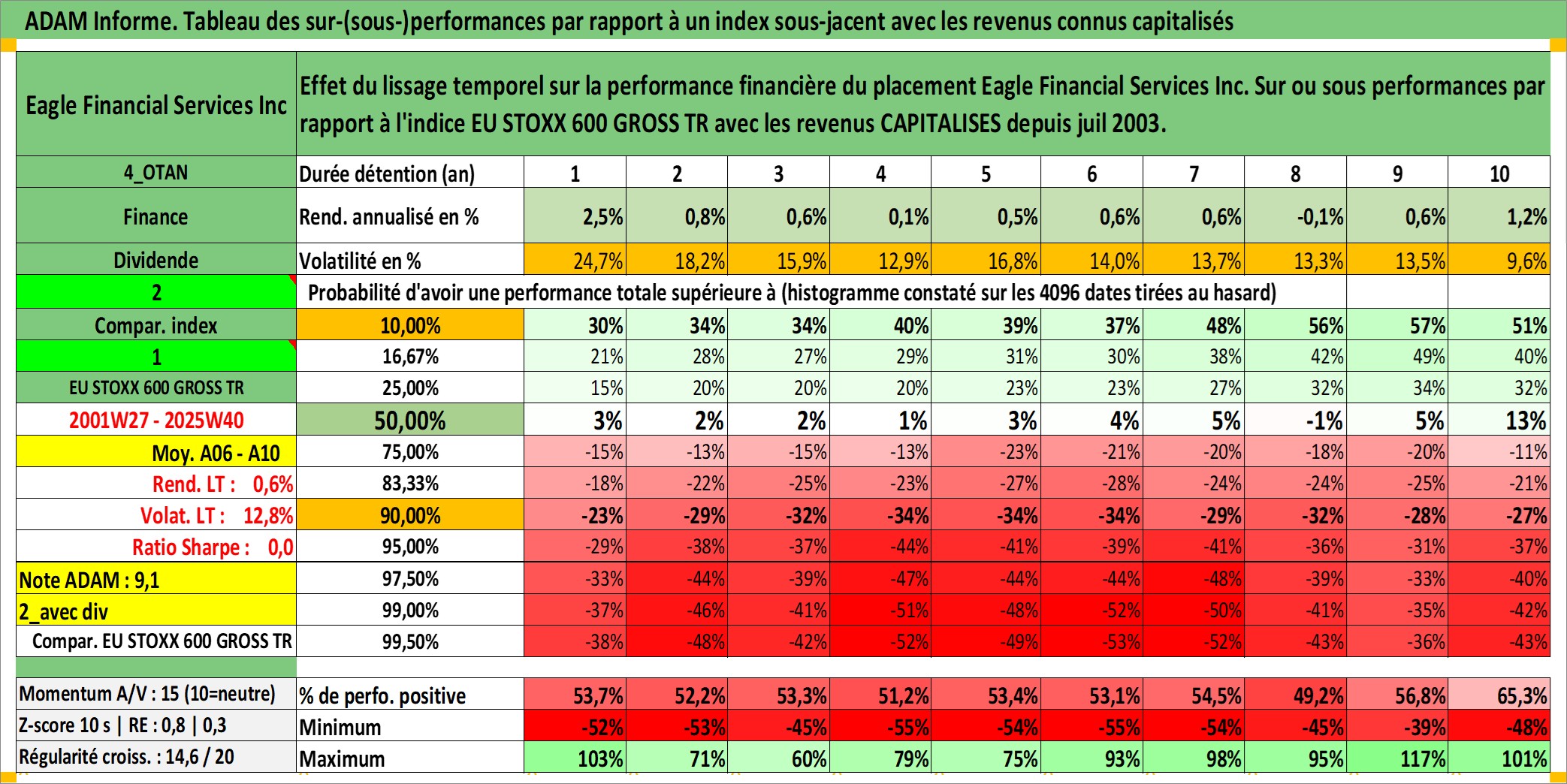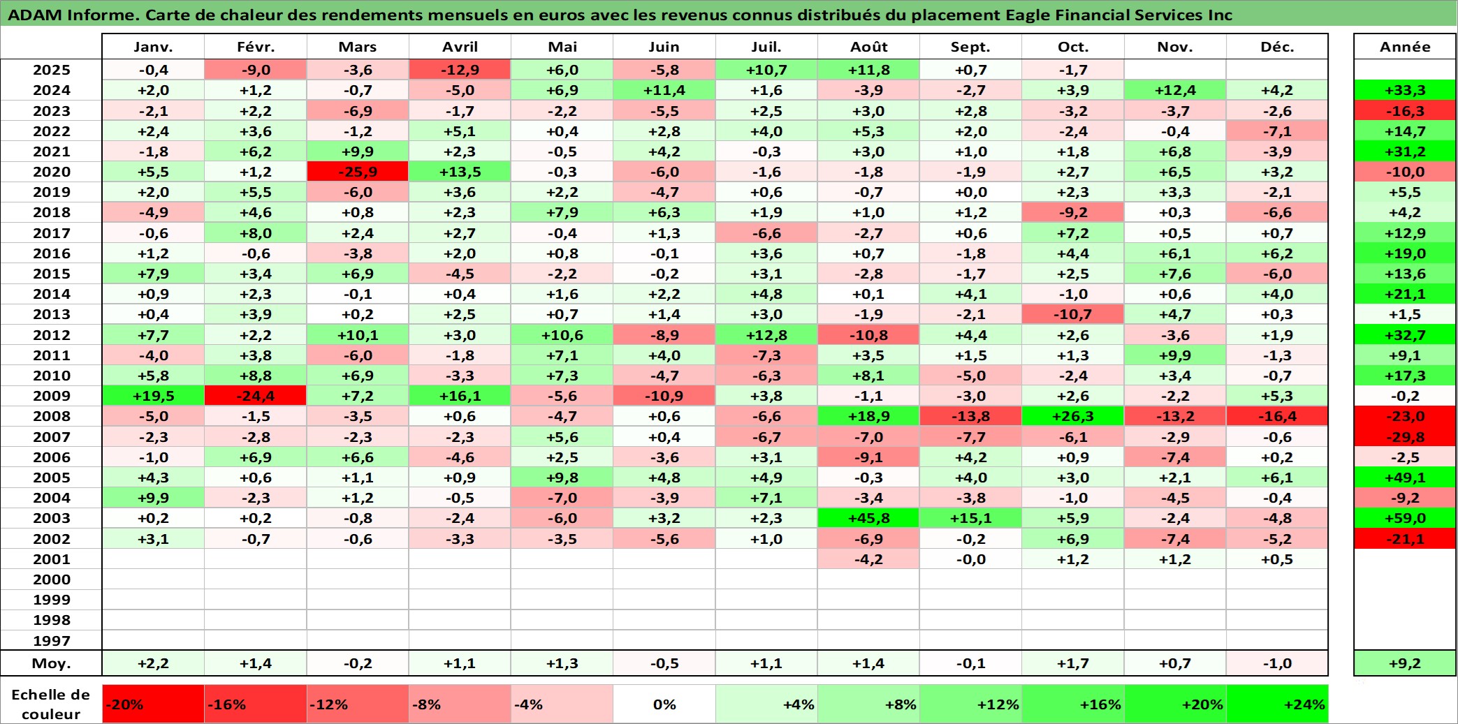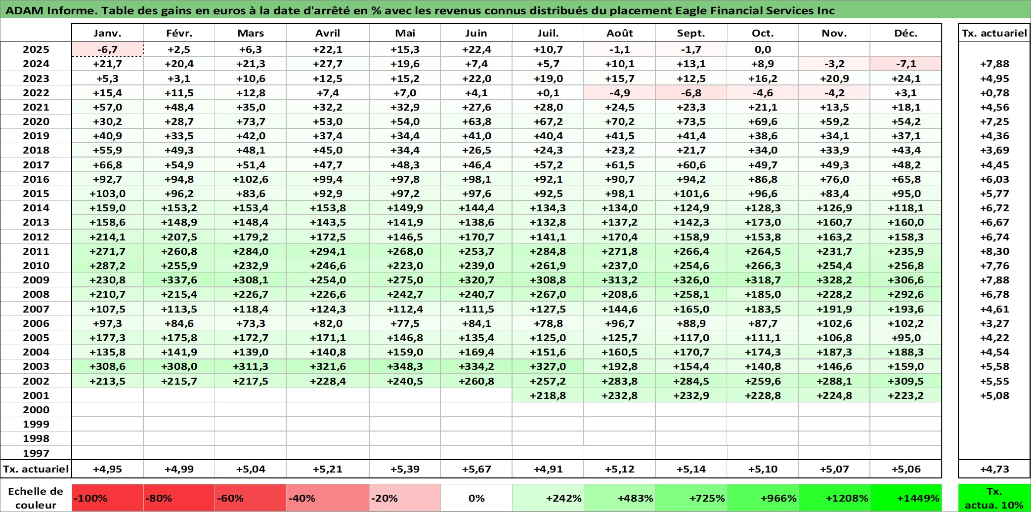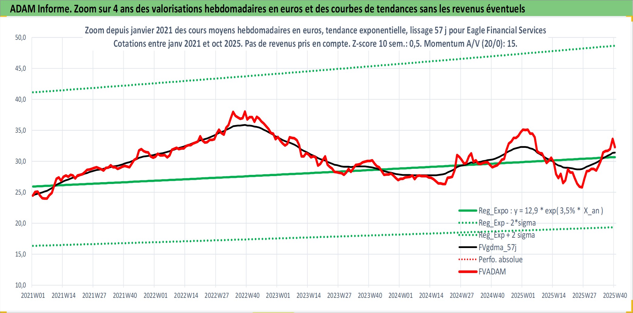 Site dédié aux investisseursPage dédiée sur site financeAnalyse des valorisations hebdomadaires de l'action Eagle Financial Services Inc. Cet actif est cote en USD. Les valorisations sont en contrevaleur EURO et couvrent les semaines 2001W27 a 2025W40. Les revenus de cet actif financier sont pris en compte depuis la semaine 2003W31. La note ESG de cet actif n'est pas connue.