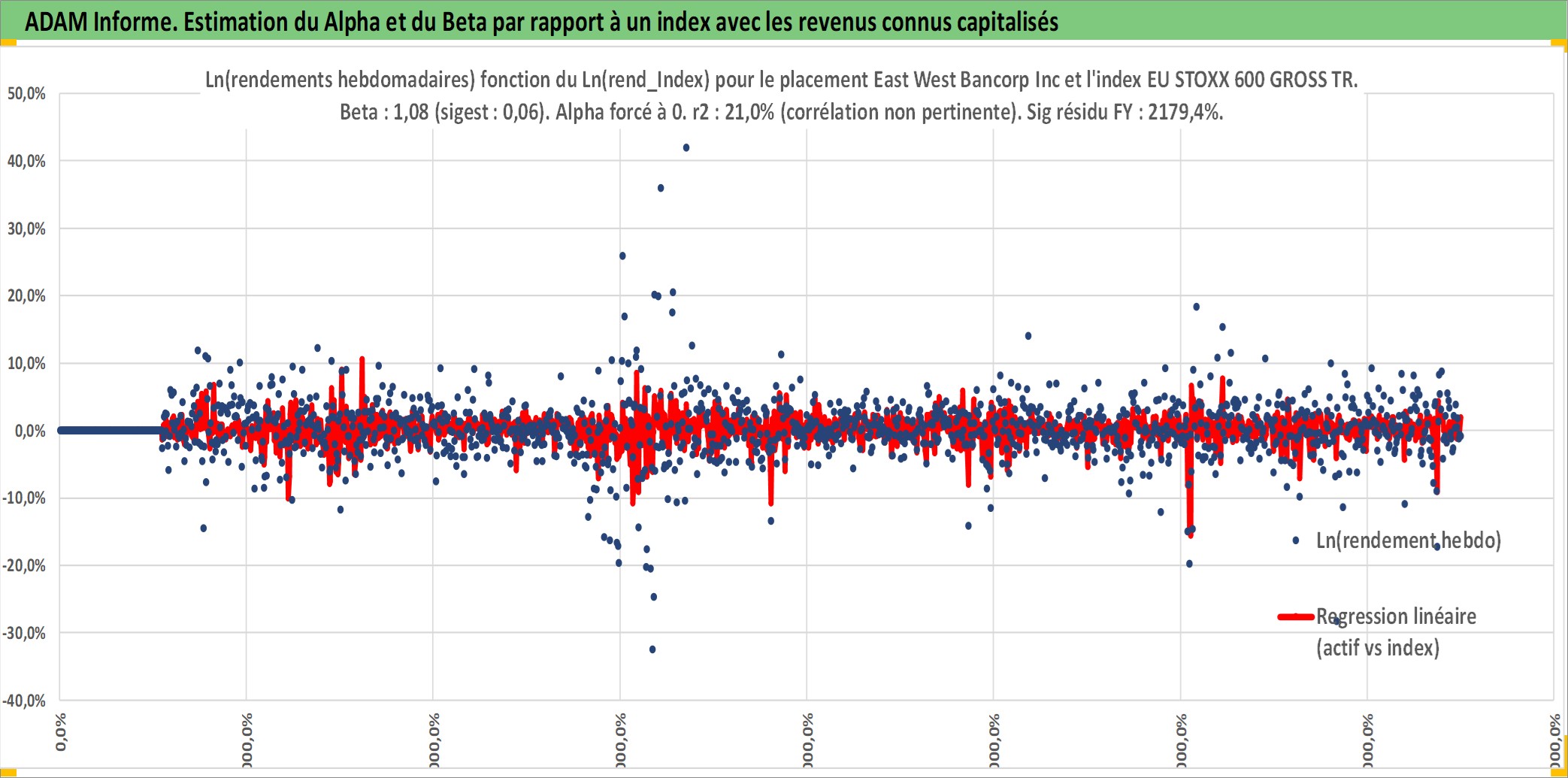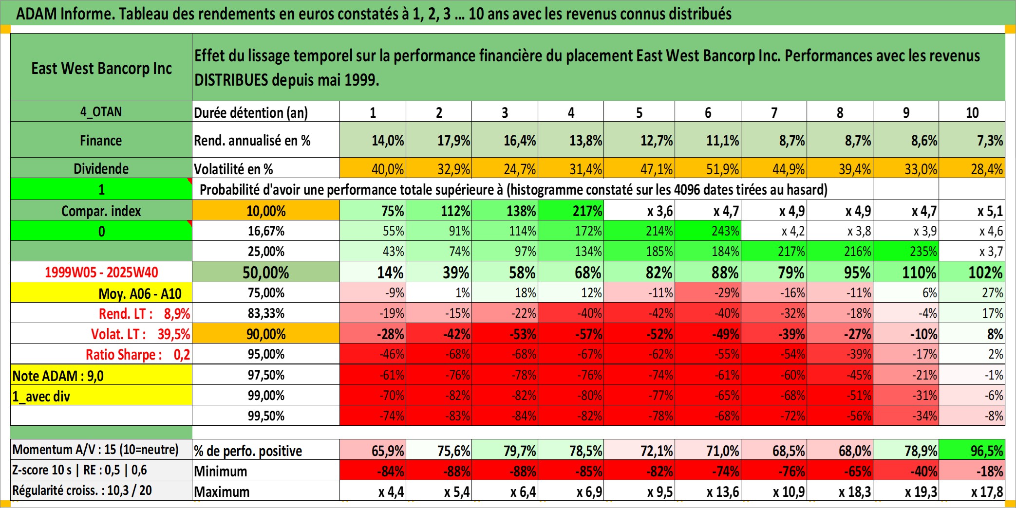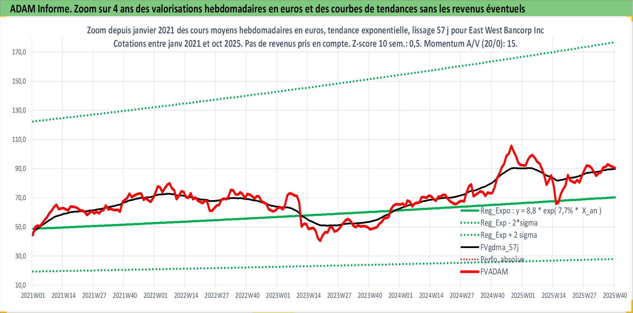 Site dédié aux investisseursPage dédiée sur site financeAnalyse des valorisations hebdomadaires de l'action East West Bancorp Inc. Cet actif est cote en USD. Les valorisations sont en contrevaleur EURO et couvrent les semaines 1999W05 a 2025W40. Les revenus de cet actif financier sont pris en compte depuis la semaine 1999W18. La note globale ESG de cet actif est estimee a 7.0 (apres rebasage entre 0 et 20).
