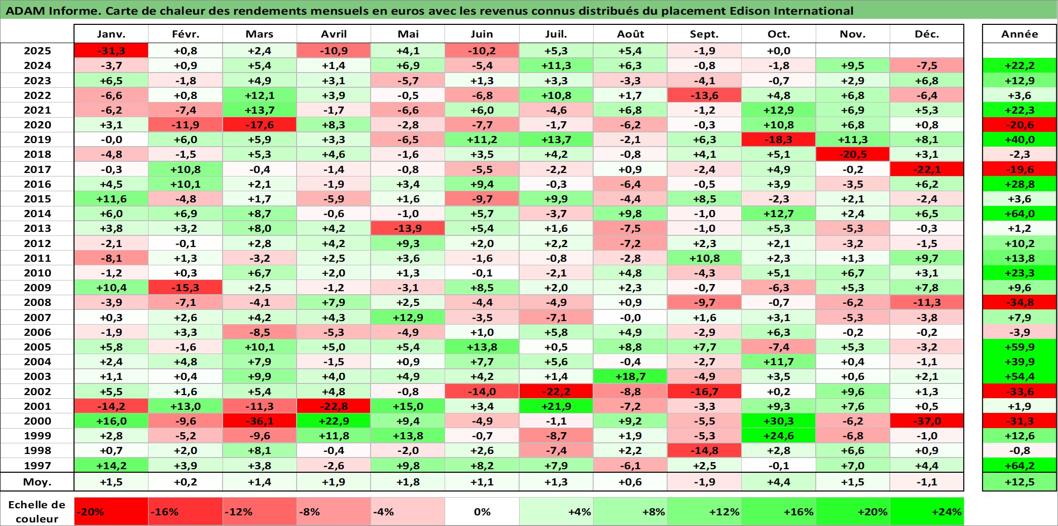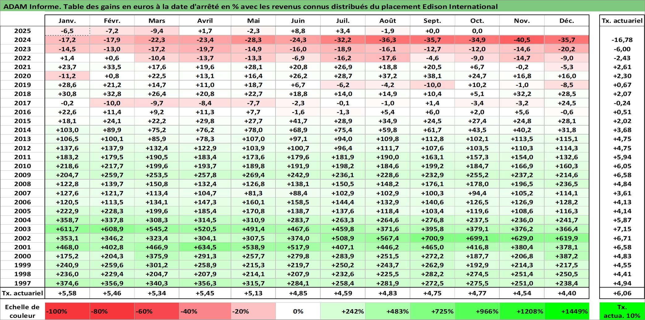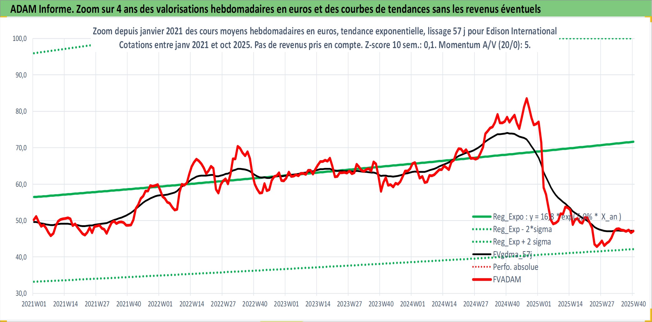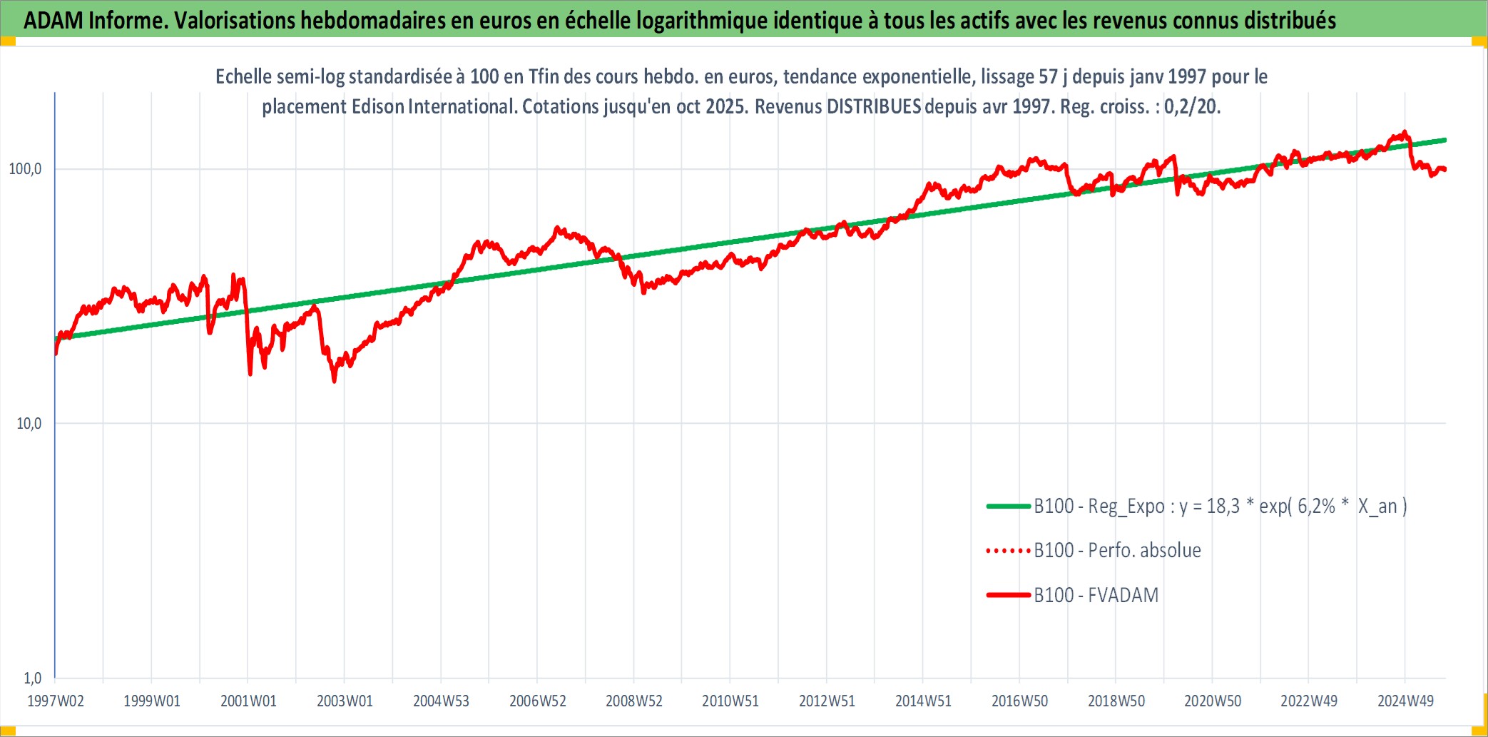 Site dédié aux investisseursPage dédiée sur site financeAnalyse des valorisations hebdomadaires de l'action Edison International. Cet actif est cote en USD. Les valorisations sont en contrevaleur EURO et couvrent les semaines 1997W01 a 2025W40. Les revenus de cet actif financier sont pris en compte depuis la semaine 1997W14. La note globale ESG de cet actif est estimee a 7.0 (apres rebasage entre 0 et 20).