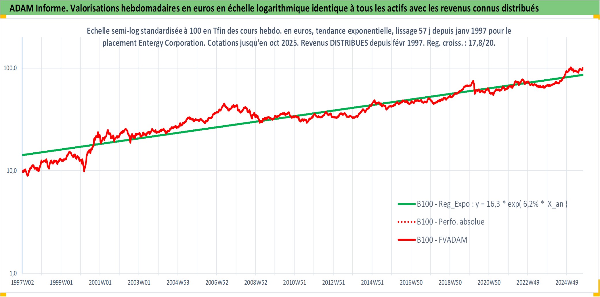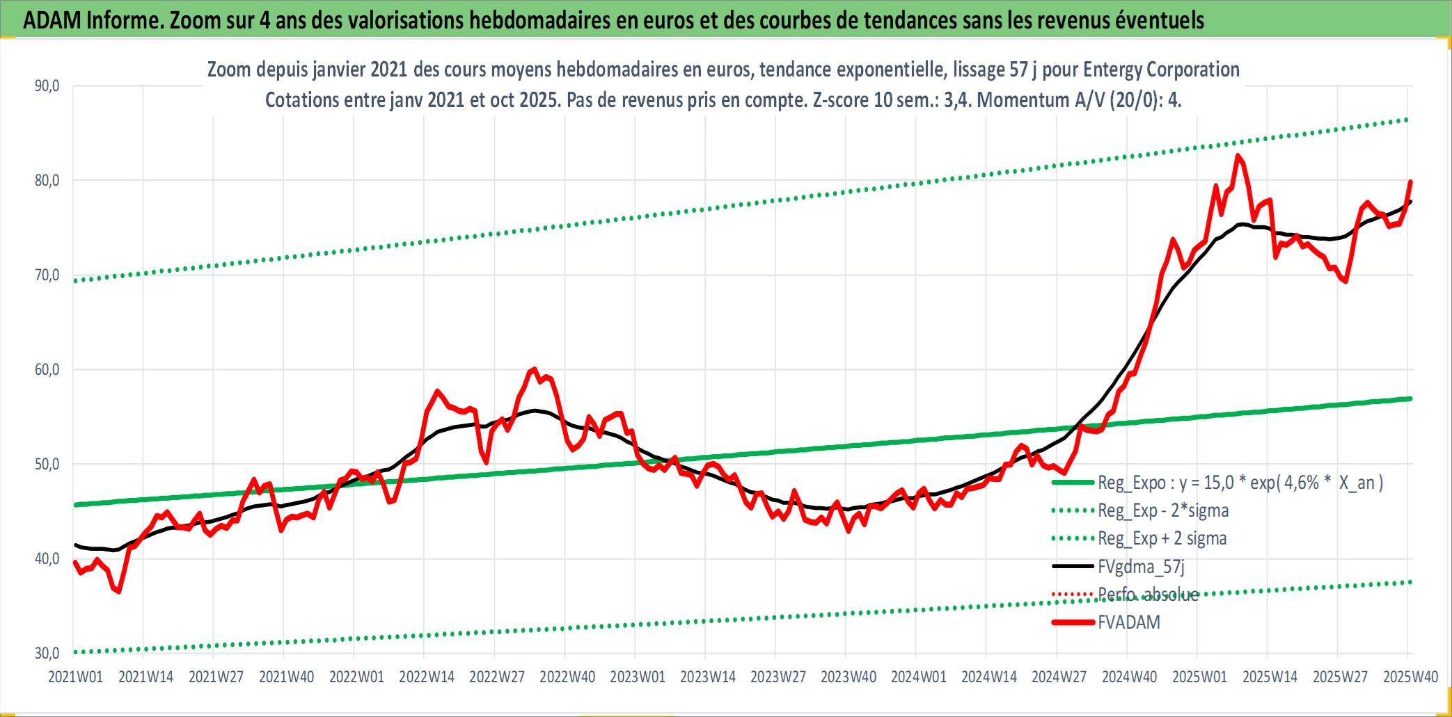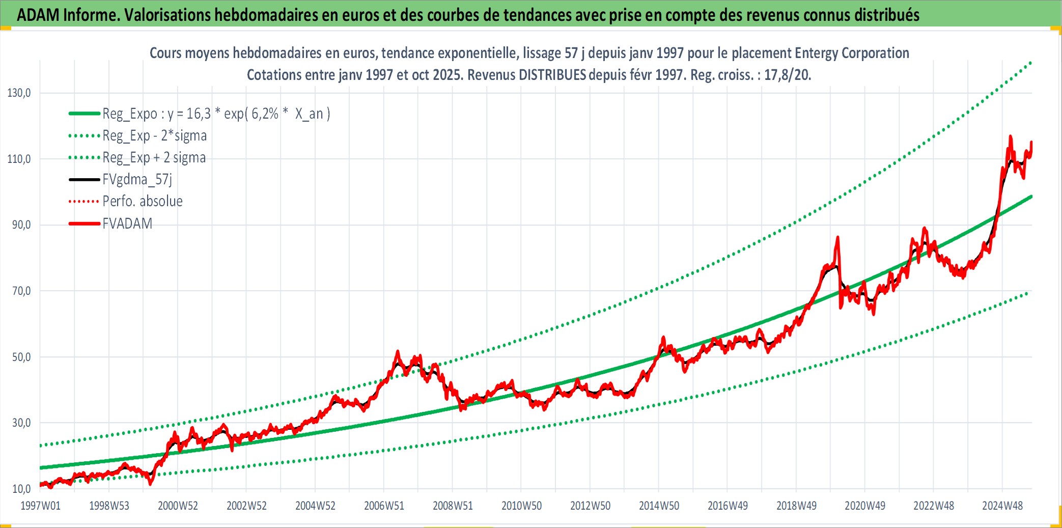 Site dédié aux investisseursPage dédiée sur site financeAnalyse des valorisations hebdomadaires de l'action Entergy Corporation. Cet actif est cote en USD. Les valorisations sont en contrevaleur EURO et couvrent les semaines 1997W01 a 2025W40. Les revenus de cet actif financier sont pris en compte depuis la semaine 1997W07. La note globale ESG de cet actif est estimee a 5.0 (apres rebasage entre 0 et 20).