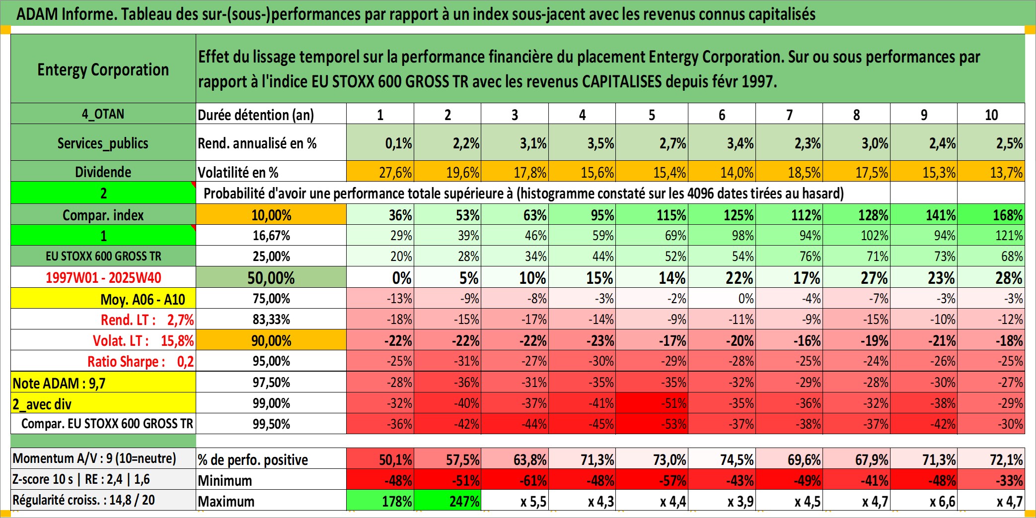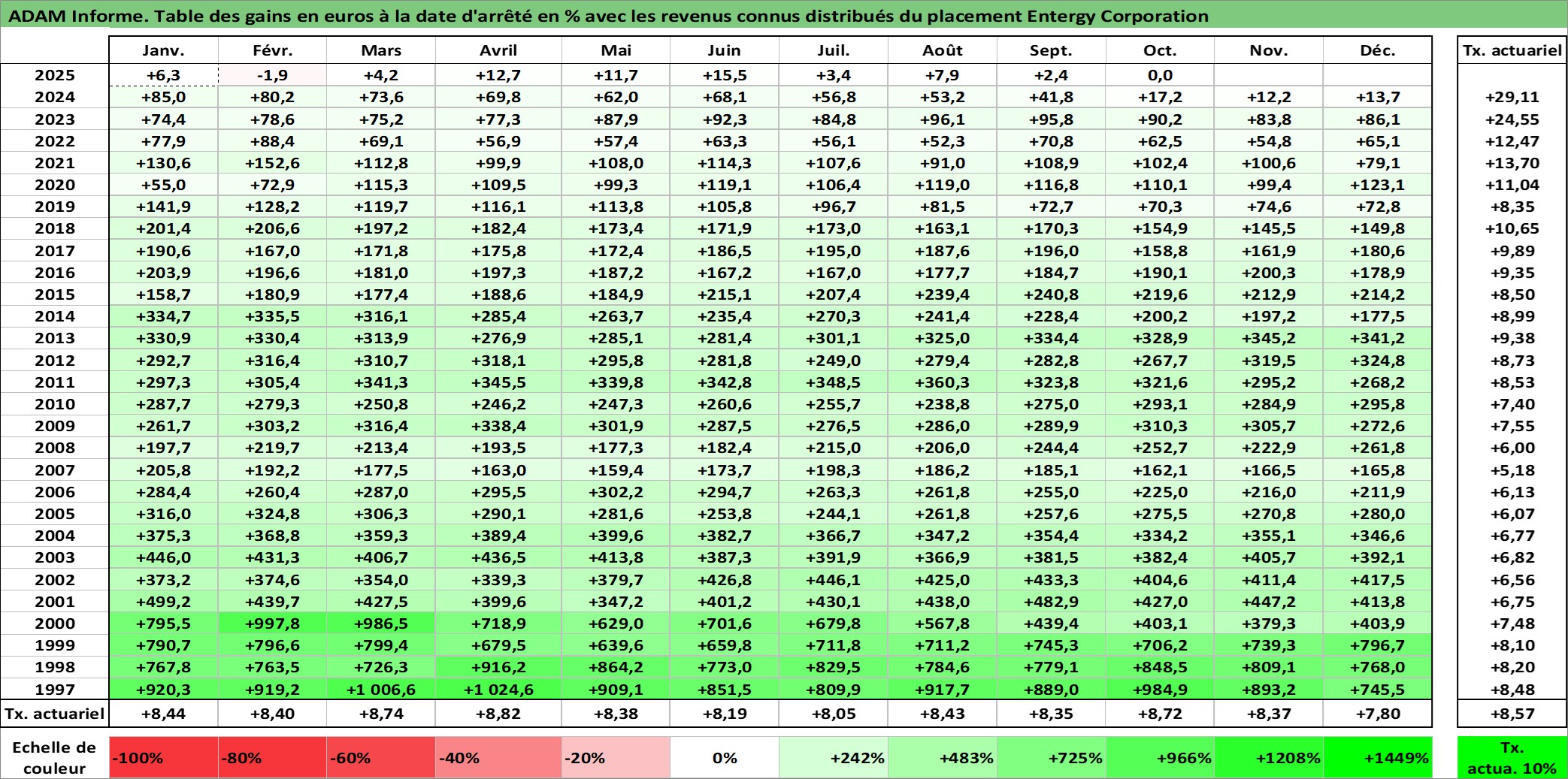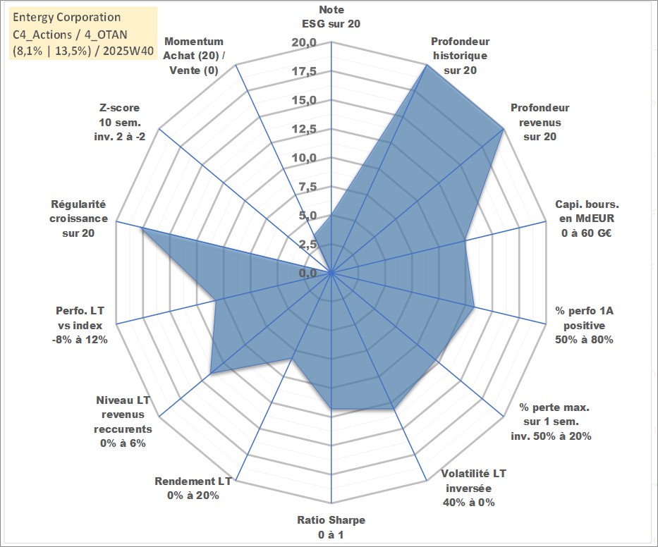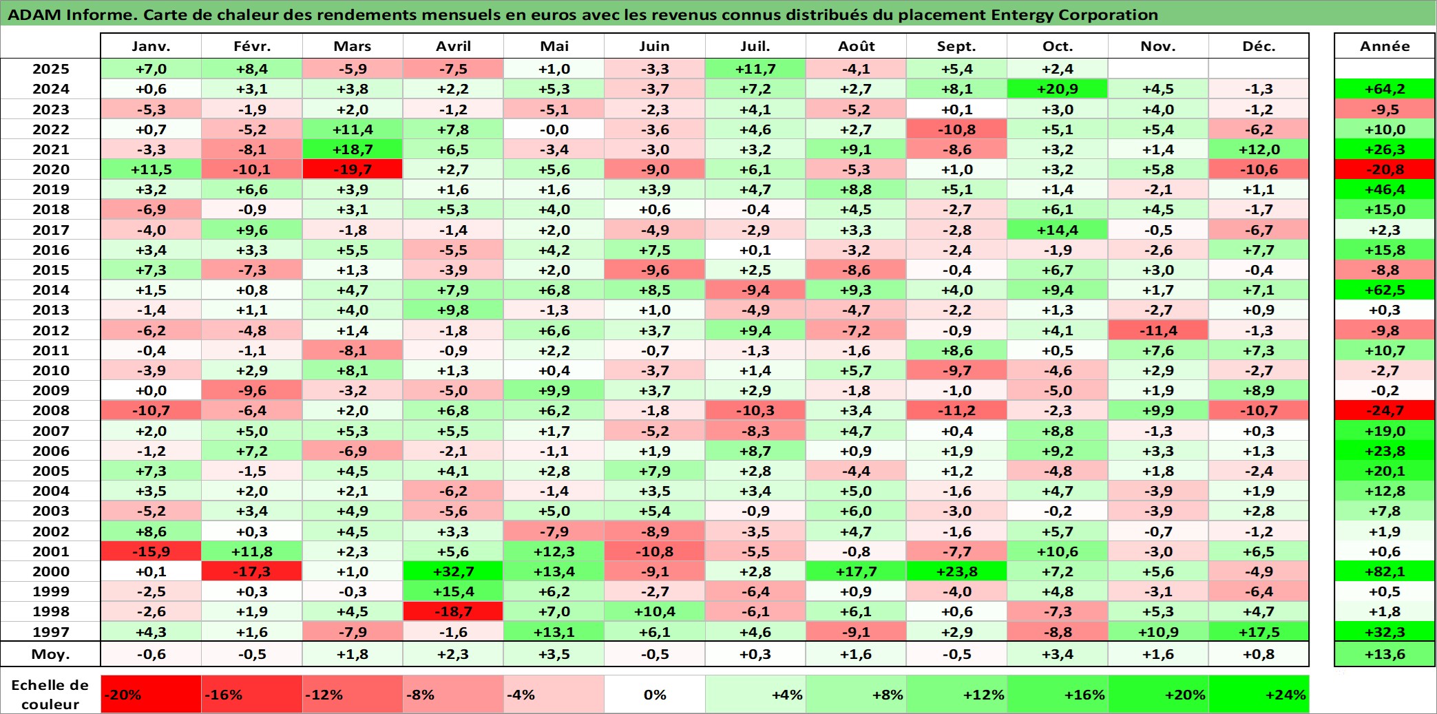 Site dédié aux investisseursPage dédiée sur site financeAnalyse des valorisations hebdomadaires de l'action Entergy Corporation. Cet actif est cote en USD. Les valorisations sont en contrevaleur EURO et couvrent les semaines 1997W01 a 2025W40. Les revenus de cet actif financier sont pris en compte depuis la semaine 1997W07. La note globale ESG de cet actif est estimee a 5.0 (apres rebasage entre 0 et 20).