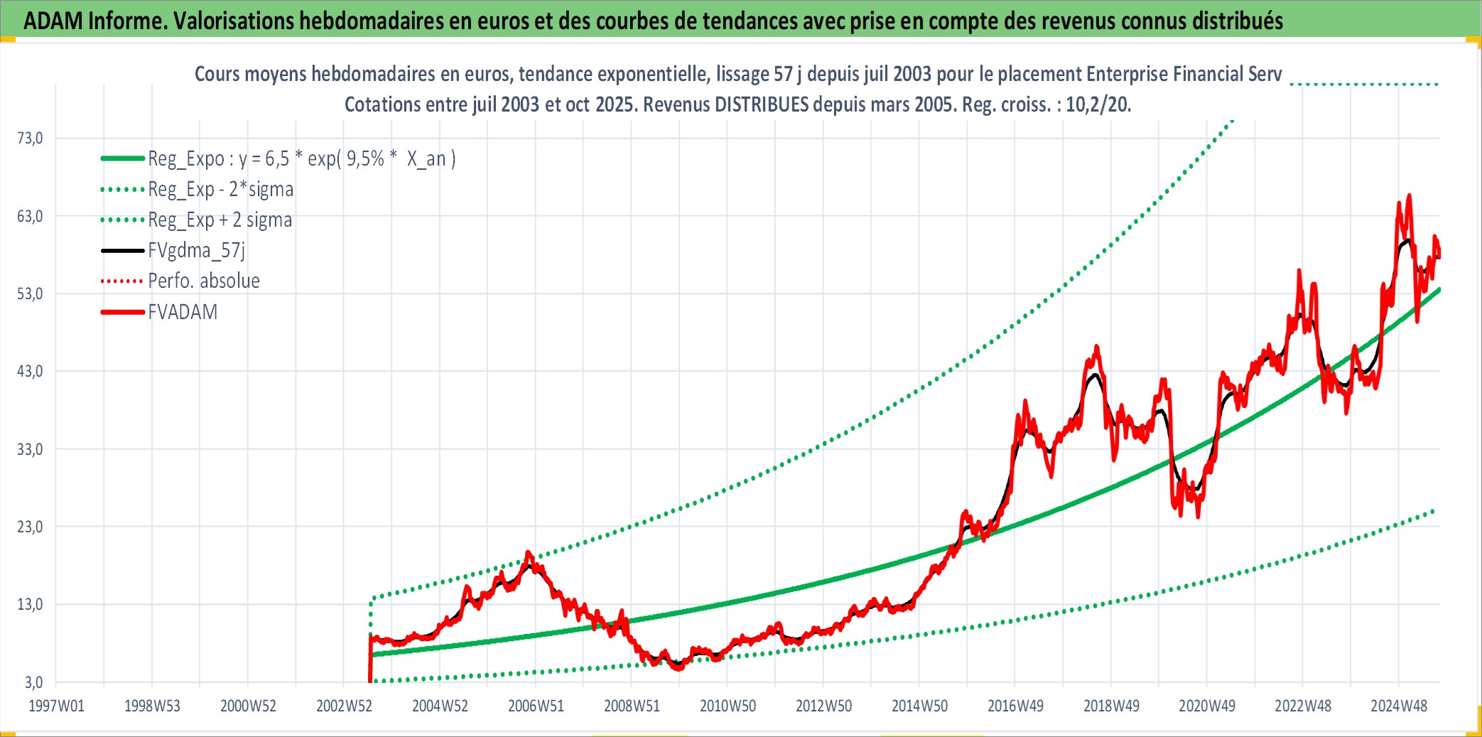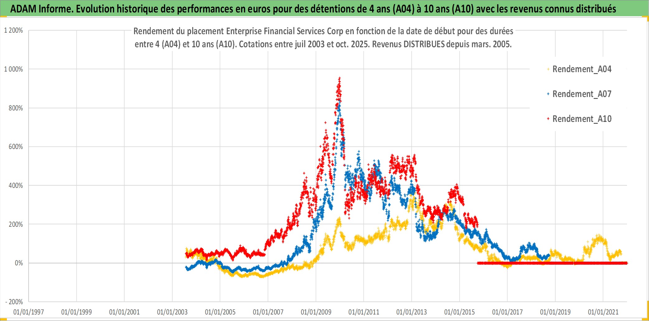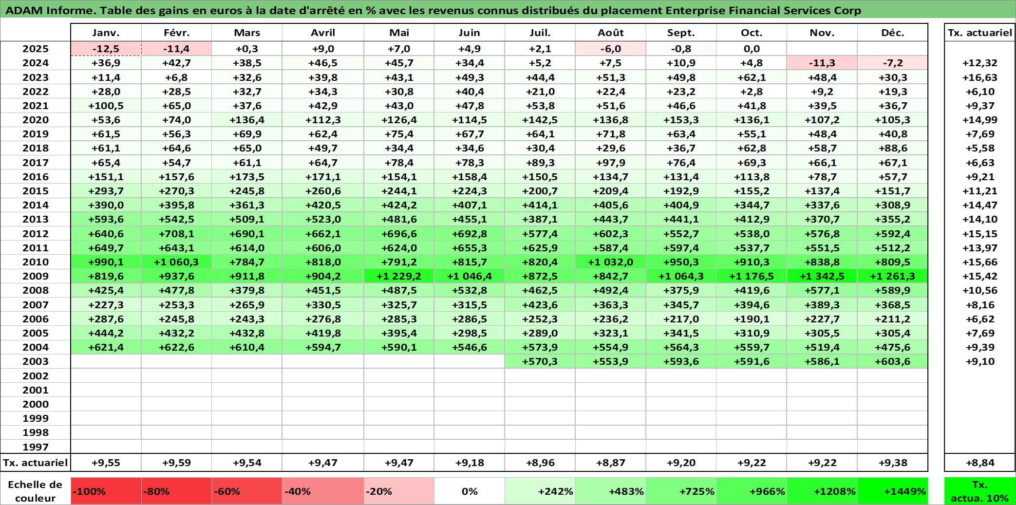 Site dédié aux investisseursPage dédiée sur site financeAnalyse des valorisations hebdomadaires de l'action Enterprise Financial Services Corp. Cet actif est cote en USD. Les valorisations sont en contrevaleur EURO et couvrent les semaines 2003W29 a 2025W40. Les revenus de cet actif financier sont pris en compte depuis la semaine 2005W11. La note ESG de cet actif n'est pas connue.