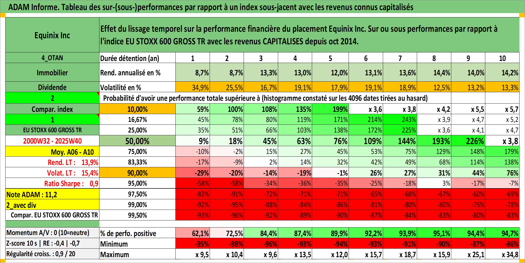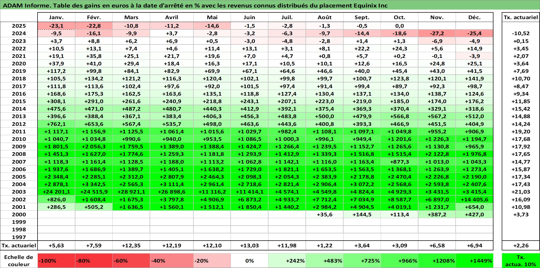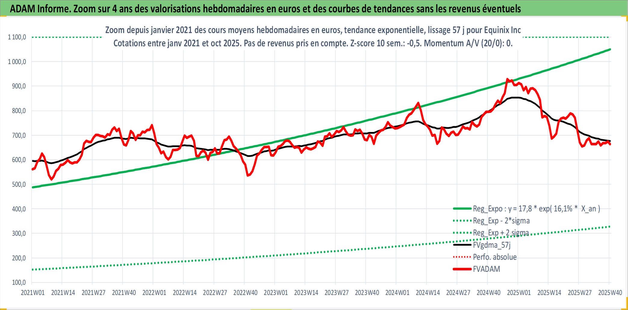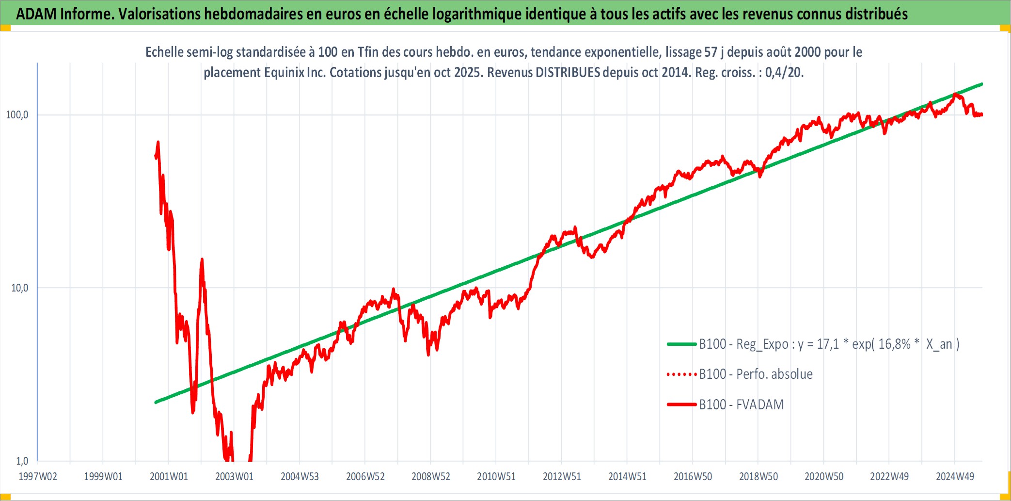 Site dédié aux investisseursPage dédiée sur site financeAnalyse des valorisations hebdomadaires de l'action Equinix Inc. Cet actif est cote en USD. Les valorisations sont en contrevaleur EURO et couvrent les semaines 2000W32 a 2025W40. Les revenus de cet actif financier sont pris en compte depuis la semaine 2014W43. La note globale ESG de cet actif est estimee a 15.0 (apres rebasage entre 0 et 20).