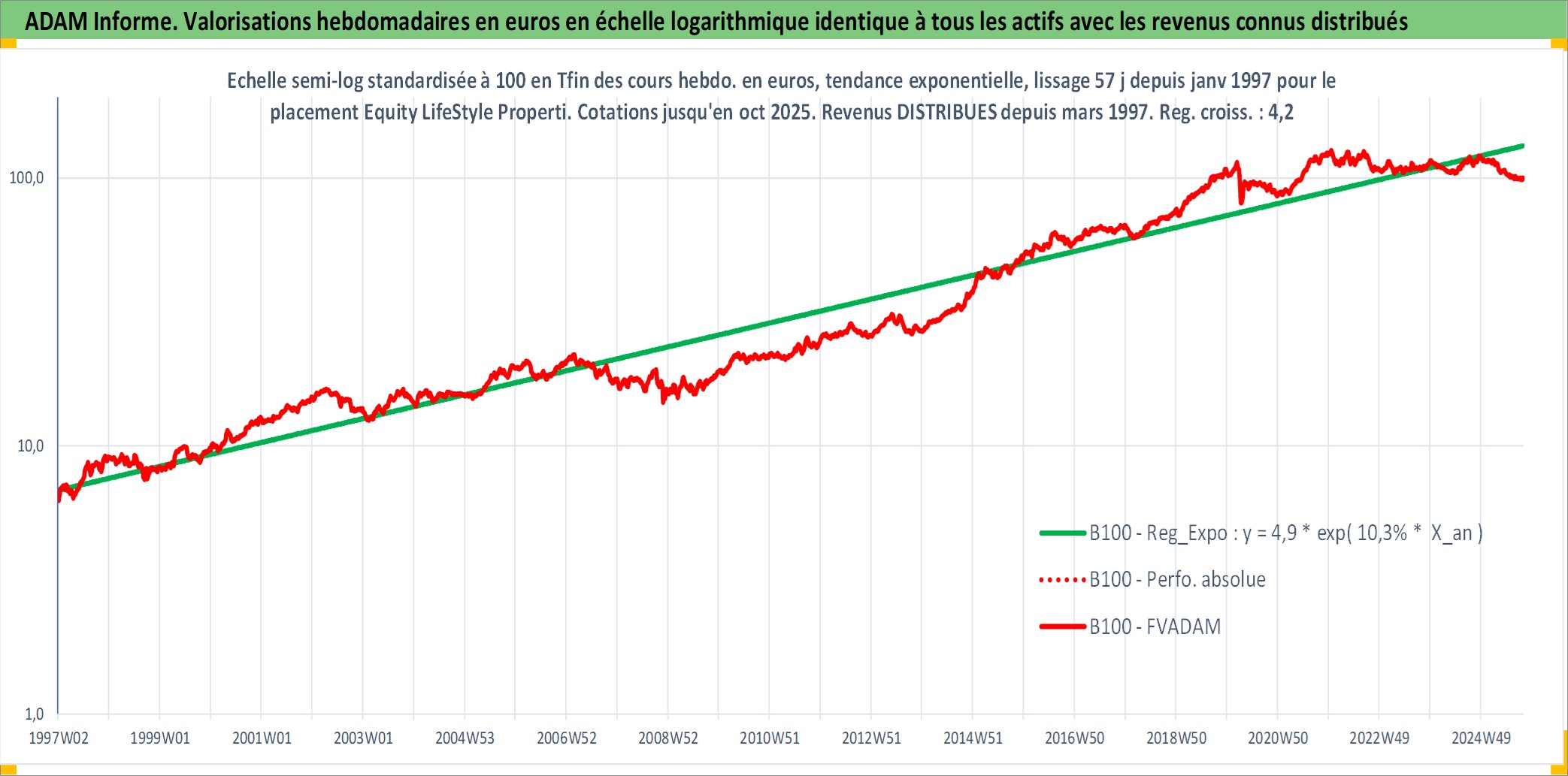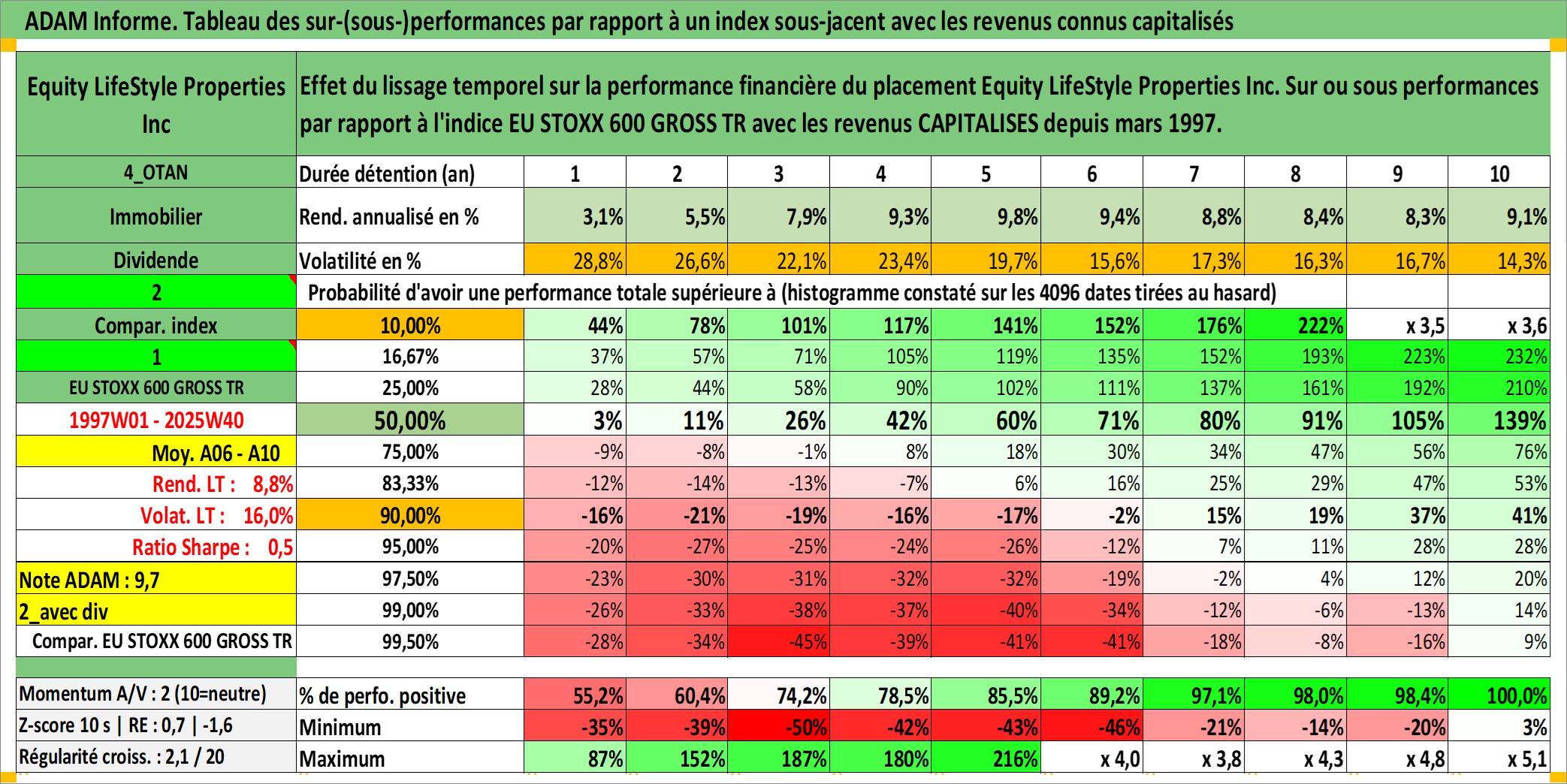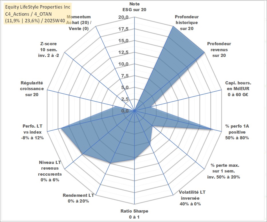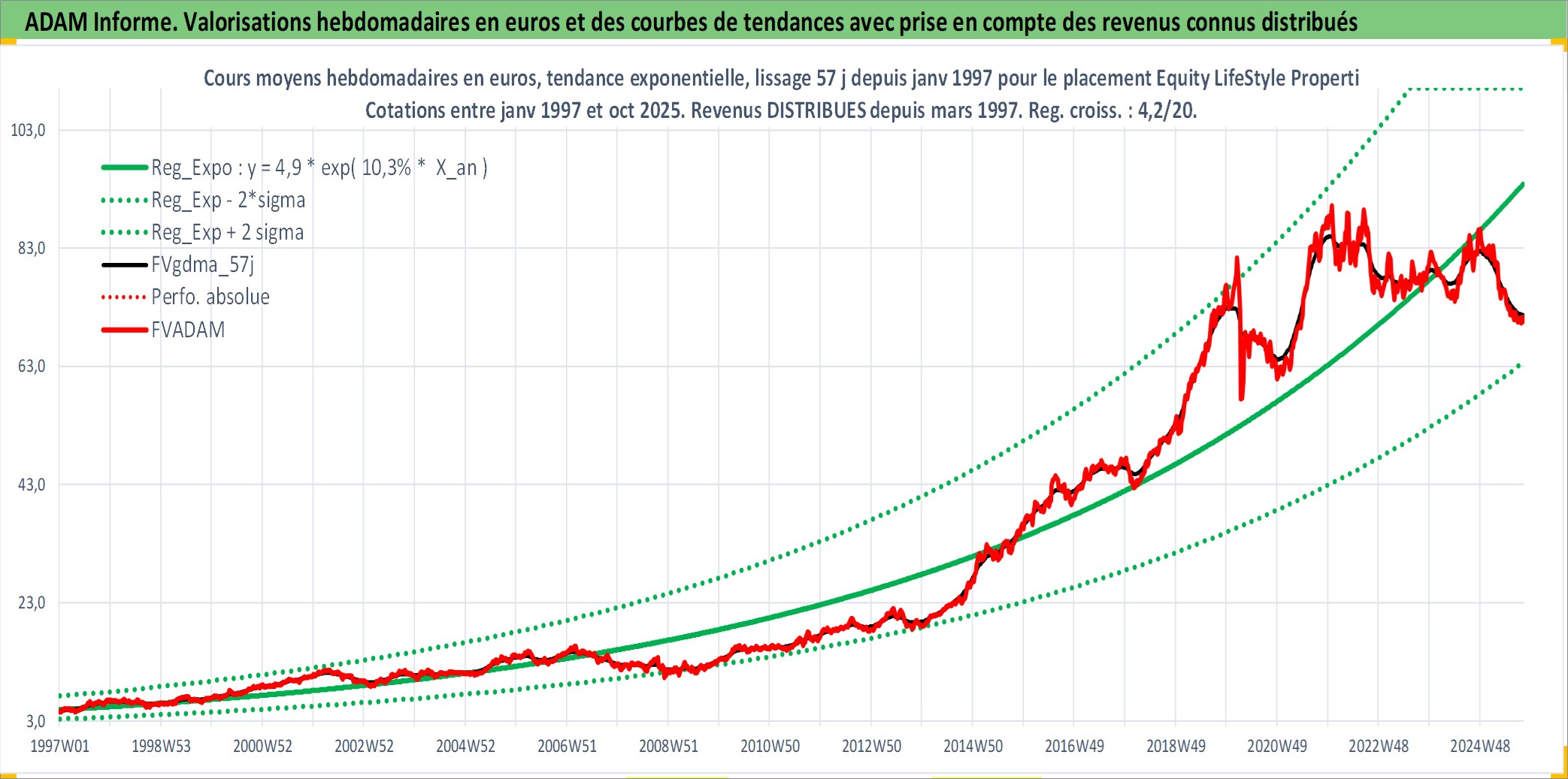 Site dédié aux investisseursPage dédiée sur site financeAnalyse des valorisations hebdomadaires de l'action Equity LifeStyle Properties Inc. Cet actif est cote en USD. Les valorisations sont en contrevaleur EURO et couvrent les semaines 1997W01 a 2025W40. Les revenus de cet actif financier sont pris en compte depuis la semaine 1997W13. La note ESG de cet actif n'est pas connue.